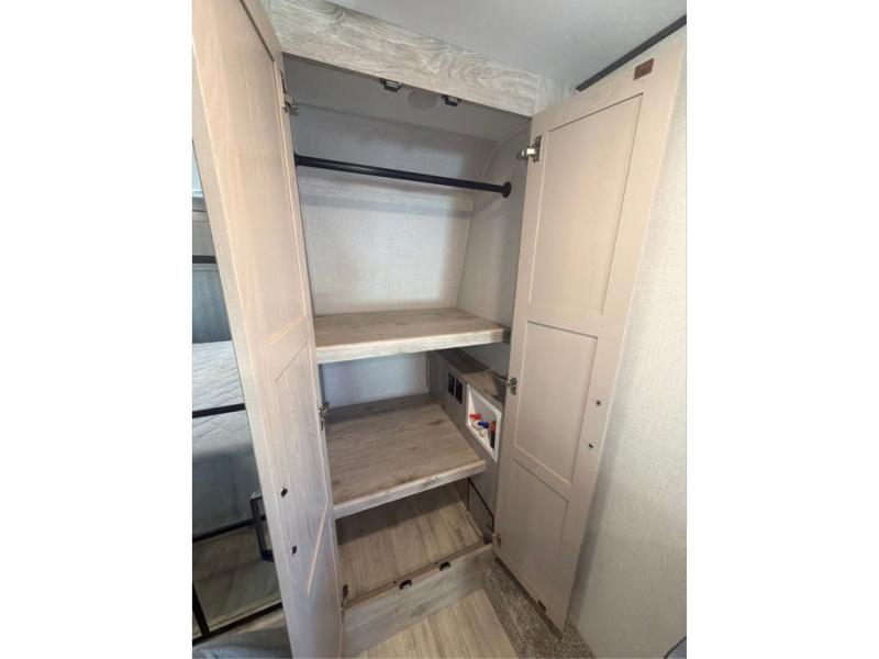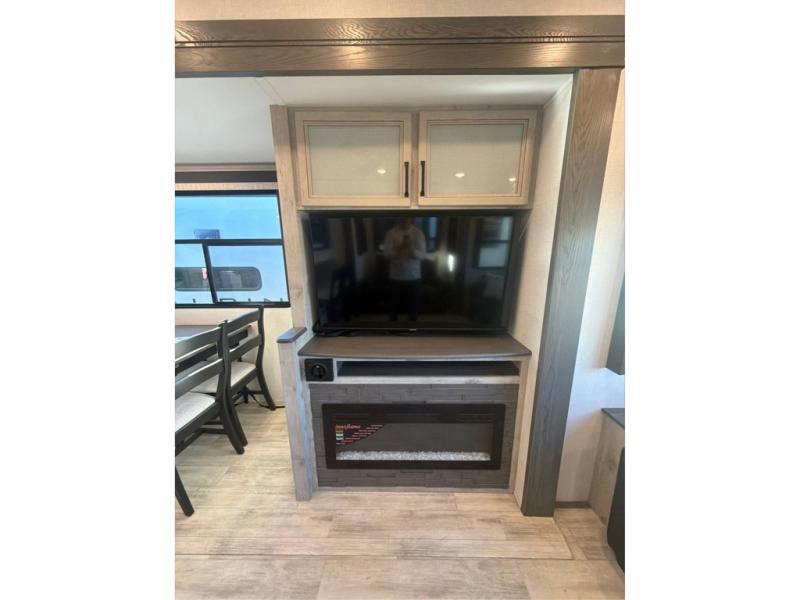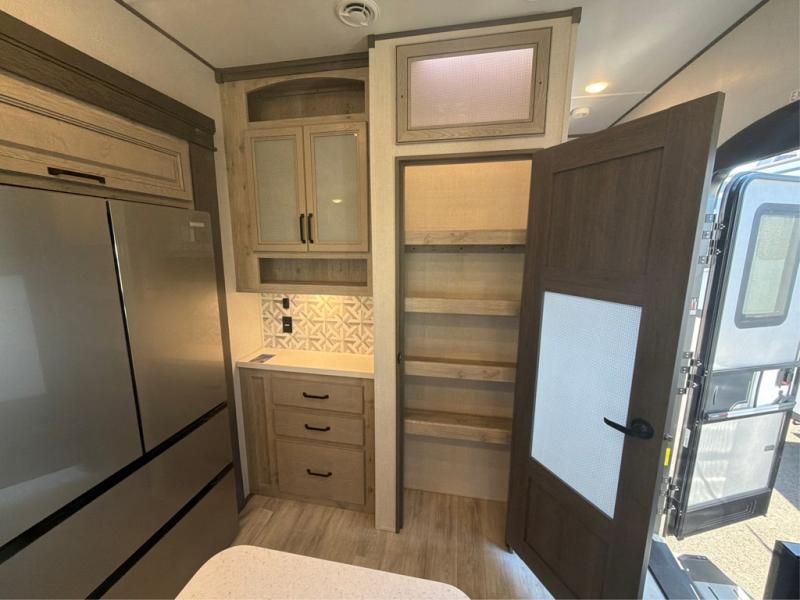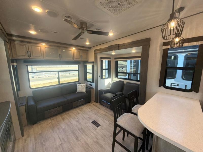 This grand kitchen offers the cook their own space to prepare and serve meals from the large L-shaped counter peninsula bar with stools, and the large pantry and curio will come in handy as well. Dining is also available at the free standing dinette with four chairs and some might even enjoy sitting on the hide-a-bed sofa sleeper. Also available for seating are the theater seats which are equipped with heat, massage, LED lights and USB charging. The master bedroom offers a king bed with storage underneath and additional wardrobe storage plus a space prepped for a washer/dryer option. Having a separate living area from the kitchen gives everyone room to spread out, and outside there are two power awnings offering additional outdoor living areas protected from the elements. The cook will enjoy the outside Grill-n-Chill outside kitchen as well.