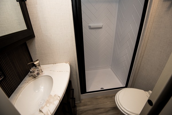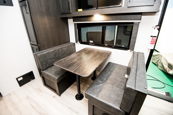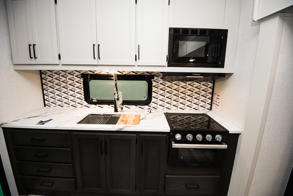 This rear kitchen fifth wheel includes ample counter space to prep meals and feed your crew. There is a tri-fold sleeper sofa slide for added space and a TV right across the sofa for easy viewing, or you can choose the optional theater seating if you don't need the extra sleeping space. Once lunch is ready, you can dine at the booth dinette or head outdoors to sit under the 17' electric awning. The full bath lets you clean up each day, and you'll feel right at home having your own private bedroom up front with a queen bed!