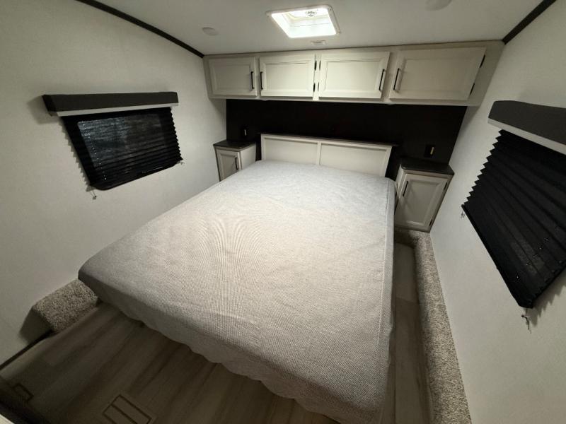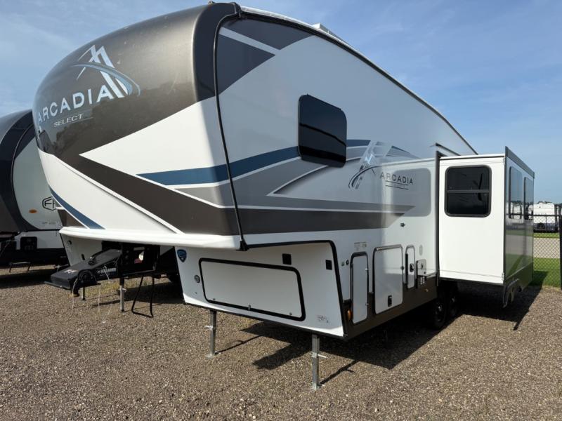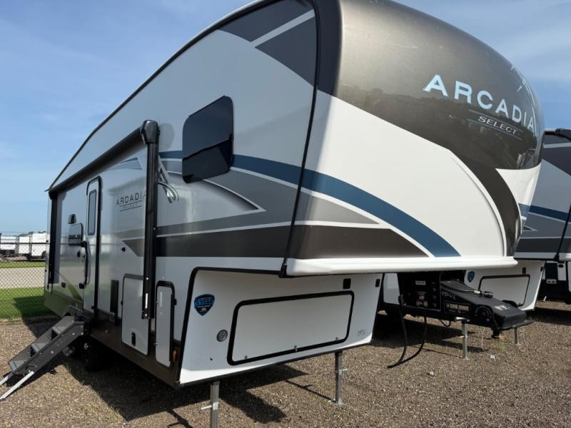 With any Arcadia Select fifth wheel by Keystone you will enjoy easy towability and at-home comforts at an affordable price! The laminated sidewalls with five sided aluminum superstructure will provide a strong foundation so you can enjoy your RV for years to come, plus a one-piece, heated and enclosed polypropylene underbelly means you can camp year around! And an upgraded Roto-Flex hitch pin with will make it easy to tow. Head inside to find tall slides for added space, seamless, pressed countertops, convenient underbed storage, and a large shower with a retractable door and skylight. These fifth wheels also include a Blade Pure A/C system, Girard on-demand tankless water heater, two 30 lb. LP tanks, and more utilities to make your camping experience run smoothly.