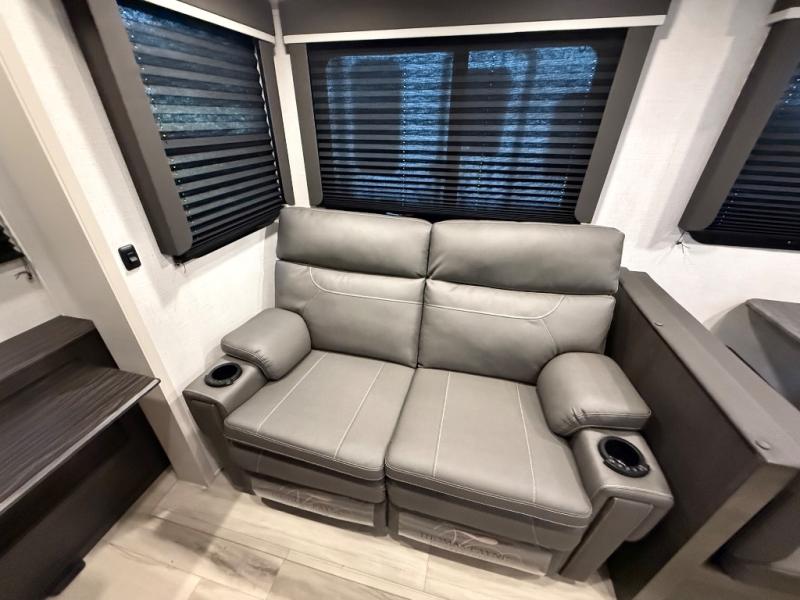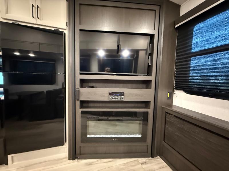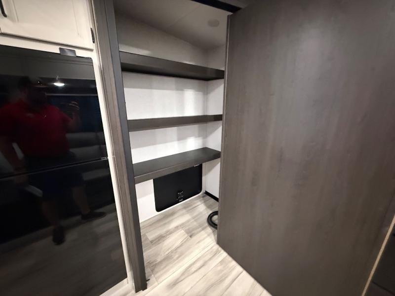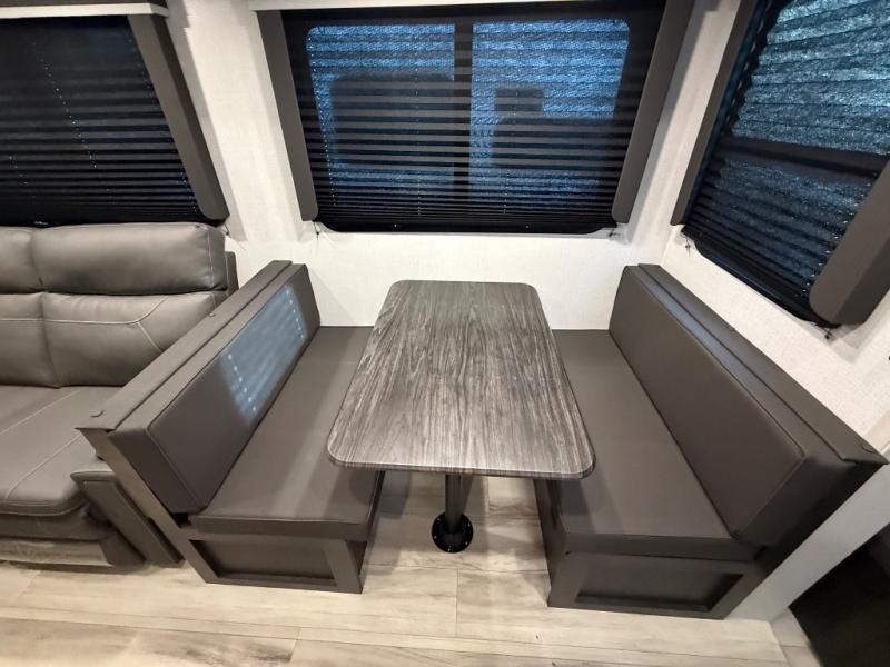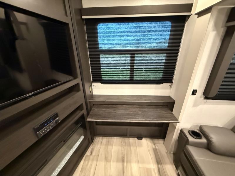 Trips to the lake are made complete in this spacious fifth wheel that can sleep five each night. You'll enjoy your own private bedroom up front that includes a queen bed, a wardrobe, plus bedside wardrobes and nightstands for your things. After you've made dinner on the cooktop, you can dine at the booth dinette. There is additional seating on the tri-fold sofa, and both of these areas can double as sleeping space for guests. If you're wanting a little more comfort, just choose the optional theater seating in place of the sofa. A flip-up desk in the back will let you get some work done if needed, and the hidden walk-in pantry behind the TV/fireplace is a huge convenience!