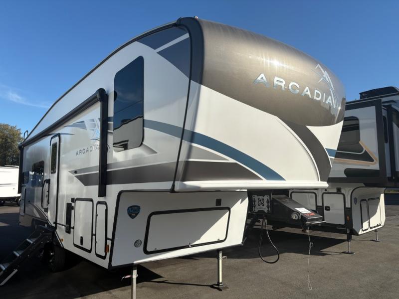 With any Arcadia Super Lite fifth wheel by Keystone, you will enjoy easy-to-tow lengths, unmatched storage, and oversized windows to let the outdoor views in. The structural I-beam frame will provide a strong foundation to your RV, and the Curt Performance Package means you can enjoy hassle-free towing. You will be able to camp year around thanks to the Peak Weather Package that includes a heated and enclosed underbelly, a 35K BTU furnace, and Keystone's exclusive HyperDeck floor that adds an additional layer of insulation to your floor. The interior will make you feel at home with residential hardware, seamless pressed countertops, black roller shades, and ample storage space. Sometimes the best things come in smaller packages; choose a Arcadia Super Lite today!