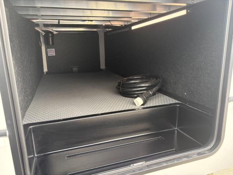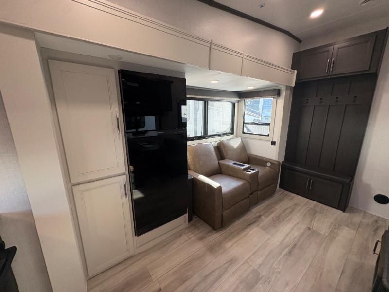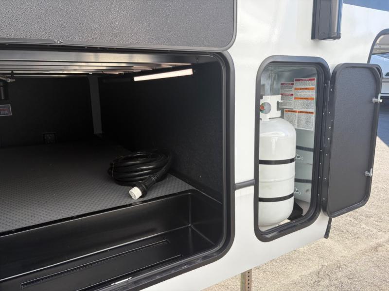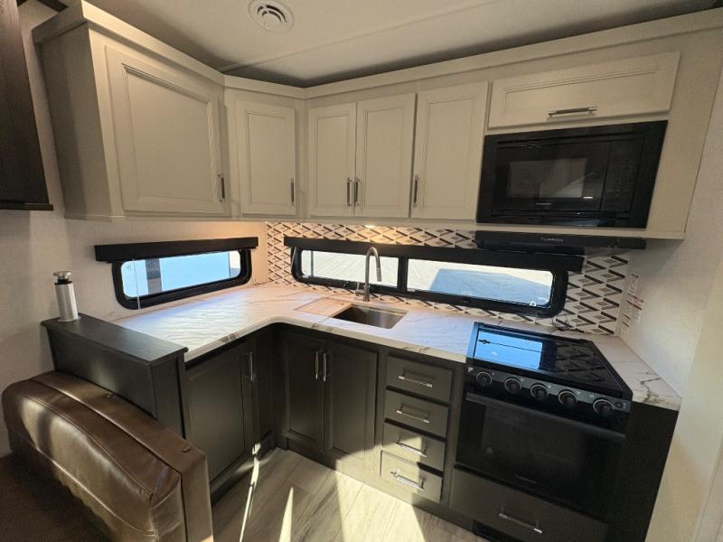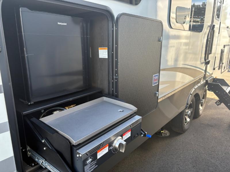 This rear kitchen fifth wheel is packed with features to make each trip memorable! Once you've arrived at the campground and set up the 21' electric awning, you can start lunch on the Grill-N-Chill outdoor kitchen before heading inside. If the weather isn't cooperating, you'll find a 21" Furrion range and microwave oven in the rear kitchen to whip up a meal. There is also a pantry and 10 cu. ft. 12V "Solar Friendly" refrigerator for food storage. The theater seating will provide a place for you to relax in the evenings, and the full bath with a spacious shower means you can clean up before bed. Speaking of bedtime, the front private bedroom includes a queen bed for a great night's rest. There are also dual nightstands and a wardrobe slide to keep your space tidy!
