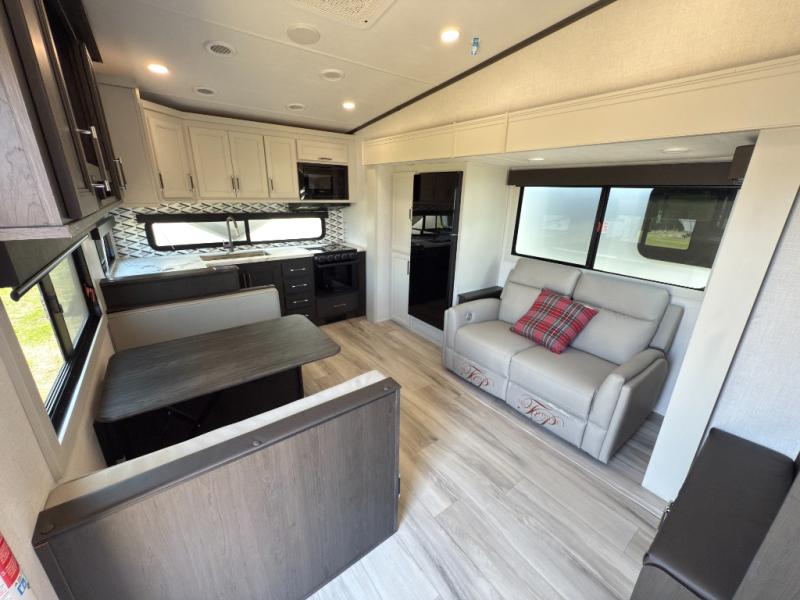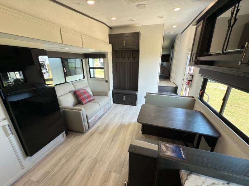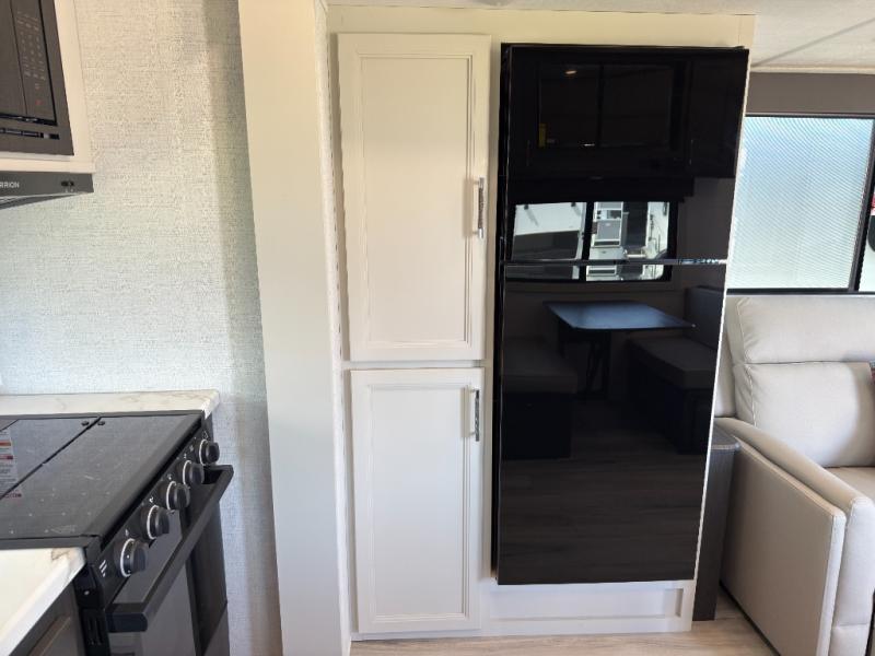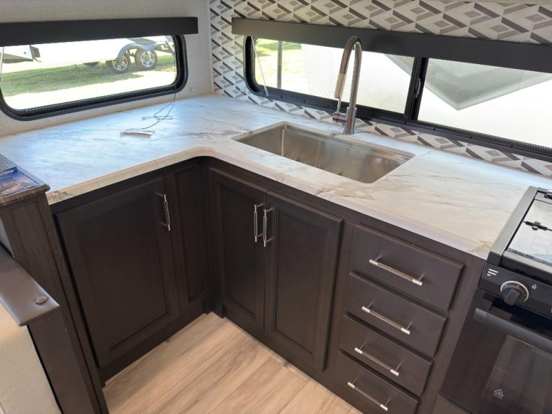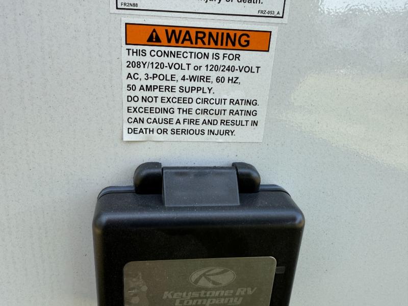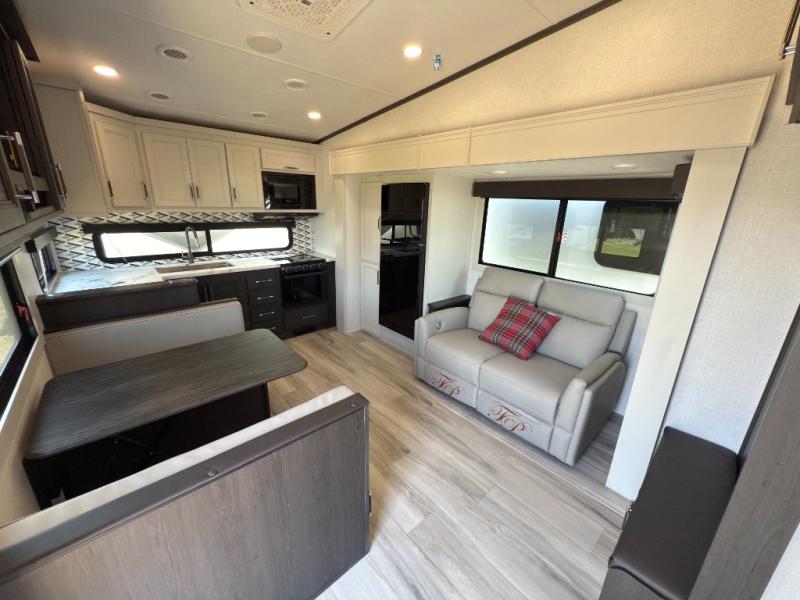 This rear kitchen fifth wheel is packed with features to make each trip memorable! Once you've arrived at the campground and set up the 21' electric awning, you can start lunch on the Grill-N-Chill outdoor kitchen before heading inside. If the weather isn't cooperating, you'll find a 21" Furrion range and microwave oven in the rear kitchen to whip up a meal. There is also a pantry and 10 cu. ft. 12V "Solar Friendly" refrigerator for food storage. The theater seating will provide a place for you to relax in the evenings, and the full bath with a spacious shower means you can clean up before bed. Speaking of bedtime, the front private bedroom includes a queen bed for a great night's rest. There are also dual nightstands and a wardrobe slide to keep your space tidy!