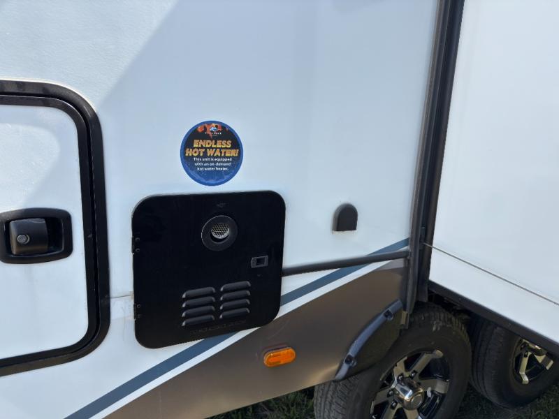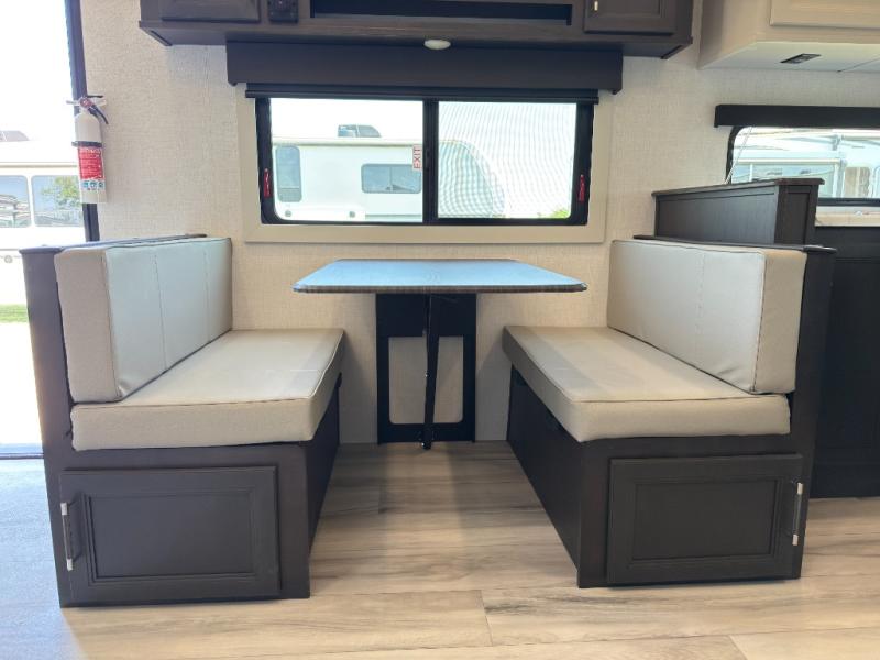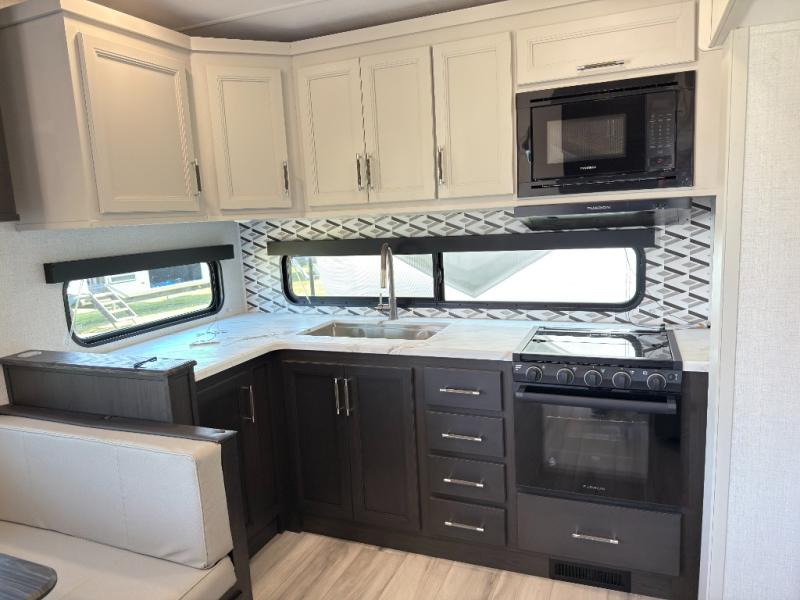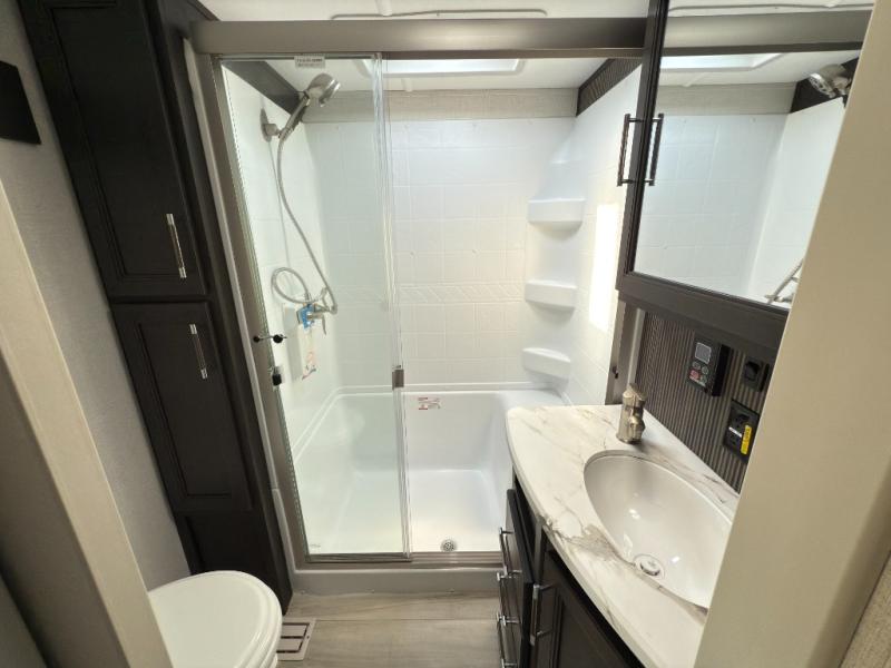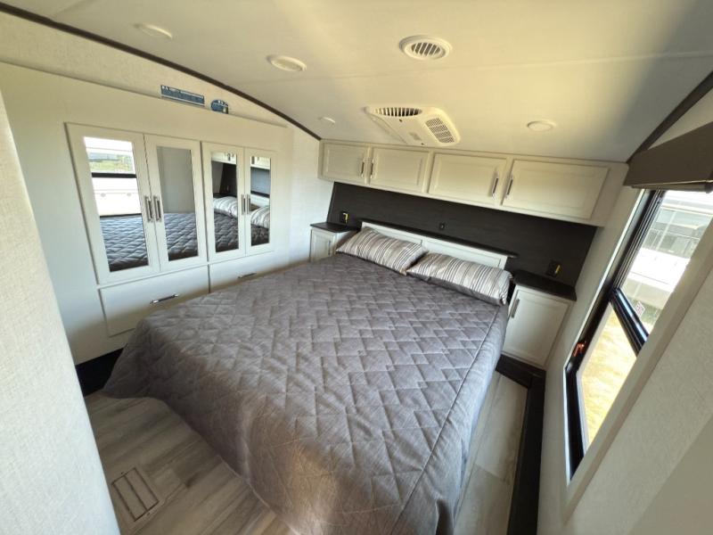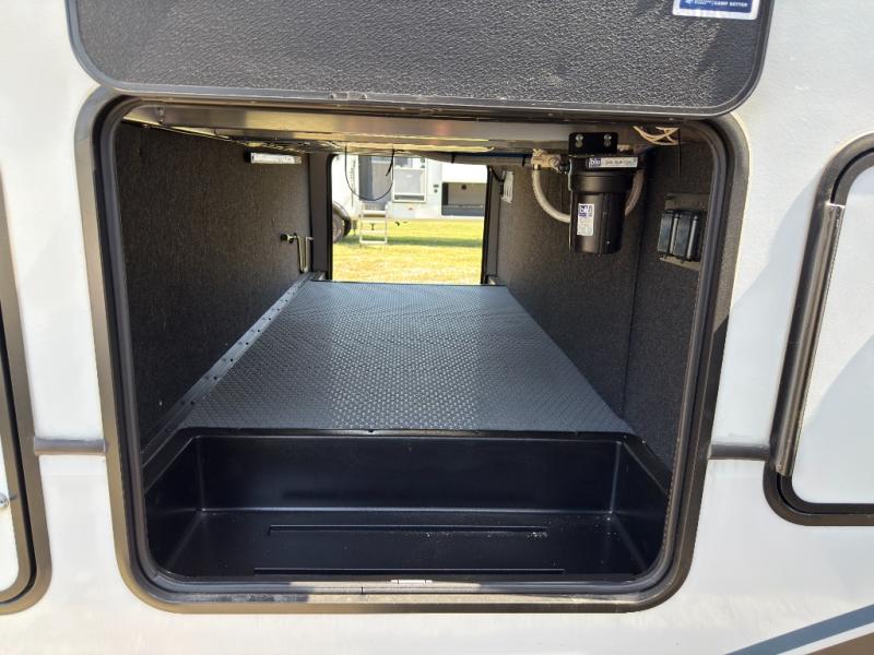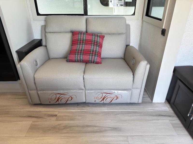 This rear kitchen fifth wheel is packed with features to make each trip memorable! Once you've arrived at the campground and set up the 21' electric awning, you can start lunch on the Grill-N-Chill outdoor kitchen before heading inside. If the weather isn't cooperating, you'll find a 21" Furrion range and microwave oven in the rear kitchen to whip up a meal. There is also a pantry and 10 cu. ft. 12V "Solar Friendly" refrigerator for food storage. The theater seating will provide a place for you to relax in the evenings, and the full bath with a spacious shower means you can clean up before bed. Speaking of bedtime, the front private bedroom includes a queen bed for a great night's rest. There are also dual nightstands and a wardrobe slide to keep your space tidy!