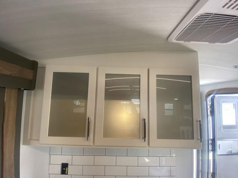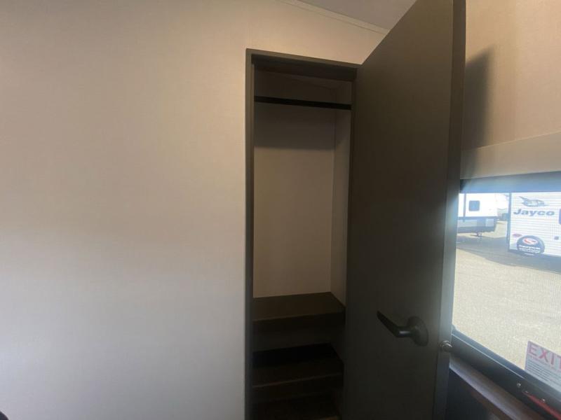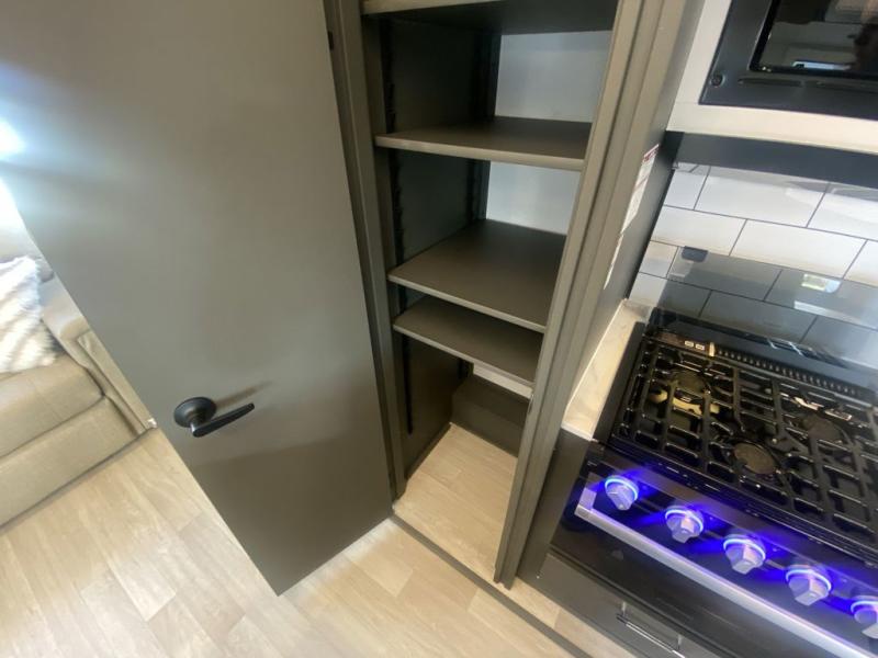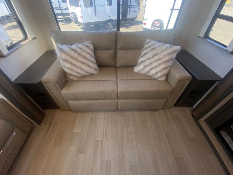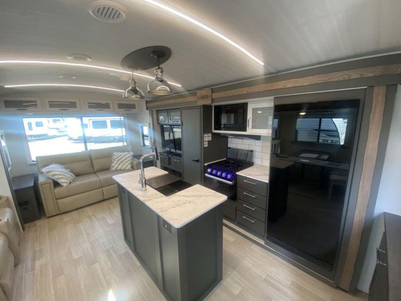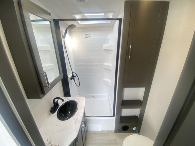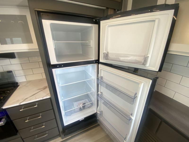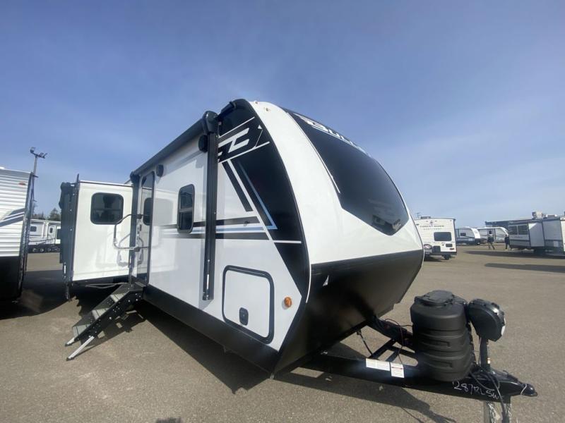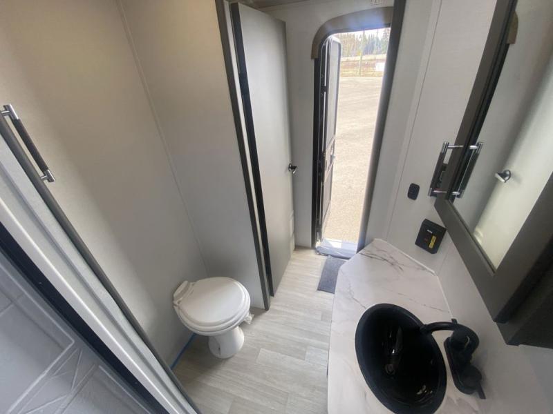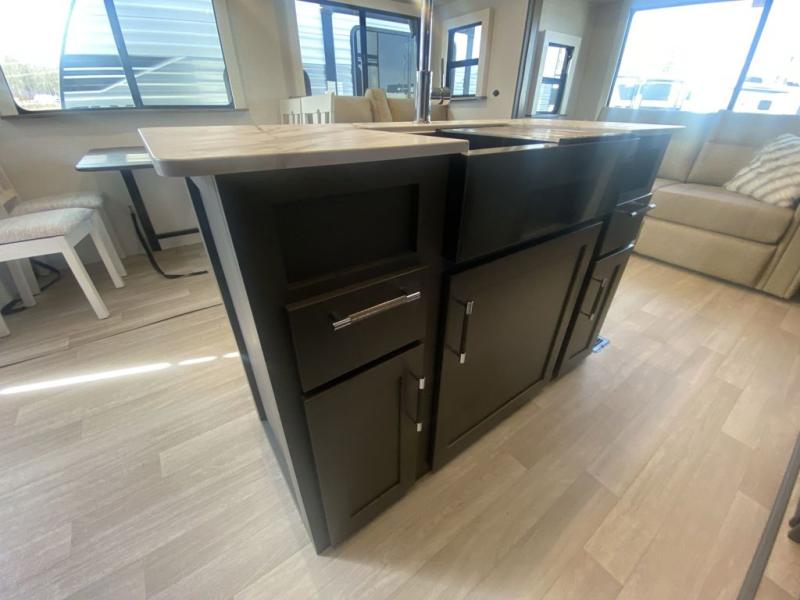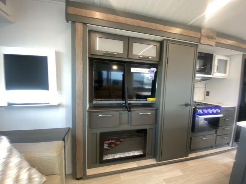 Weekend trips to the campground are made easy in this travel trailer! There are dual opposing slides in the combined kitchen and living area to provide you with ample space to stretch out. A kitchen island will come in handy when prepping meals, plus you'll have all the appliances needed to cook them. You will find comfortable seating on the rear tri-fold sofa sleeper, Do-More dinette table, and theater seats across from the entertainment center and fireplace. When you're ready to call it a night, the front private bedroom with a queen bed will be calling your name, and the full bath onboard will let you freshen up each day!
