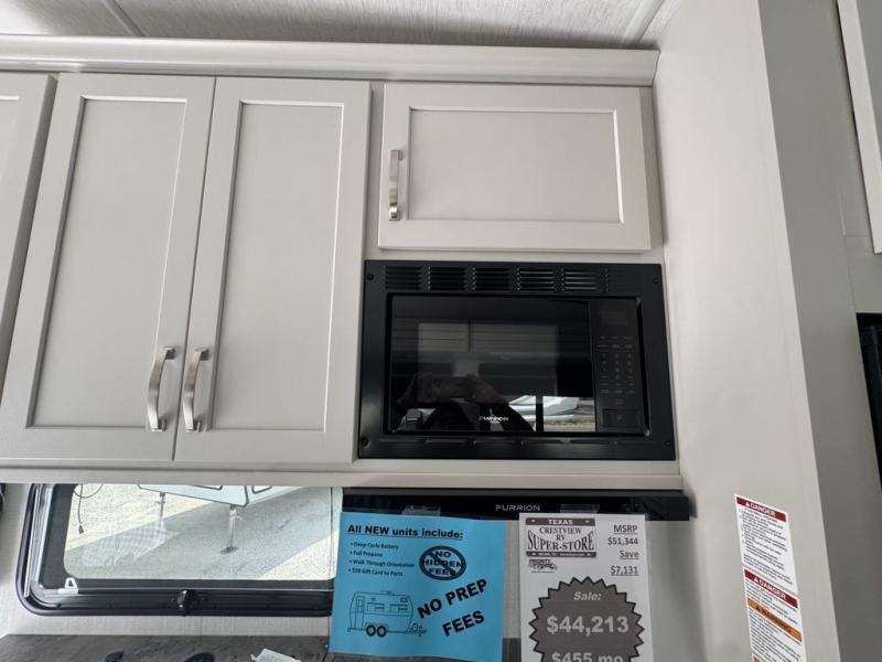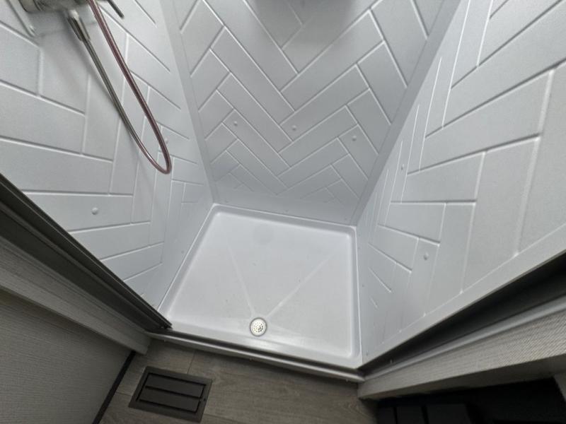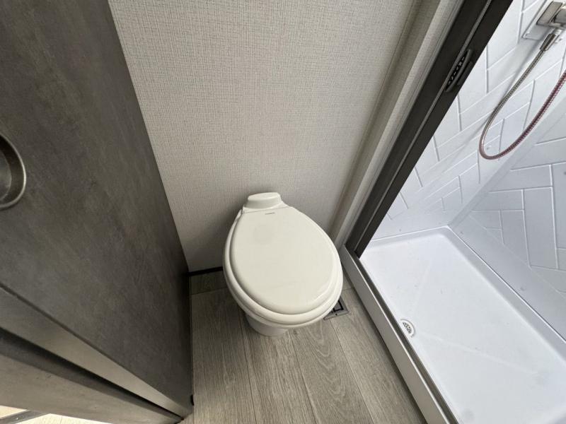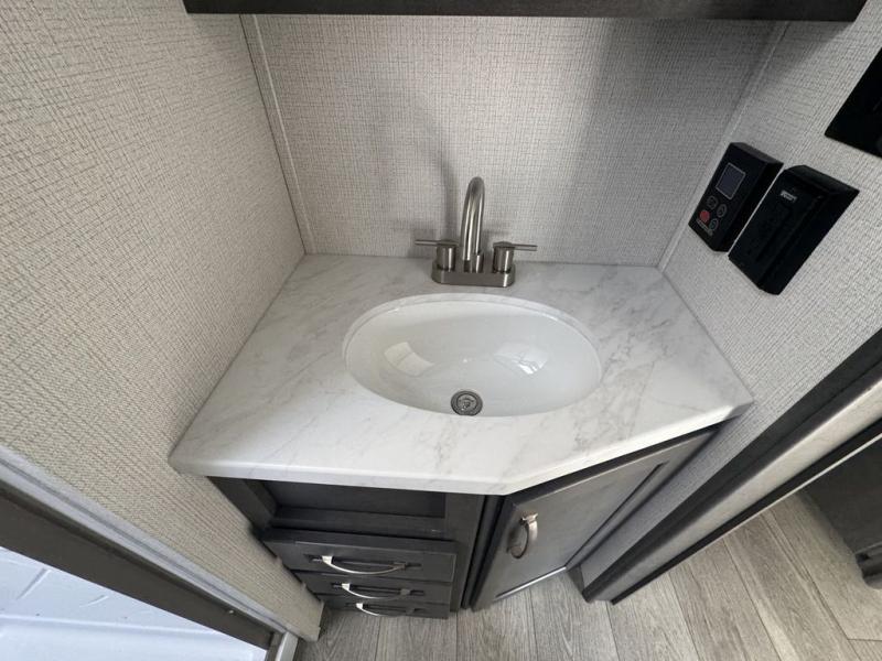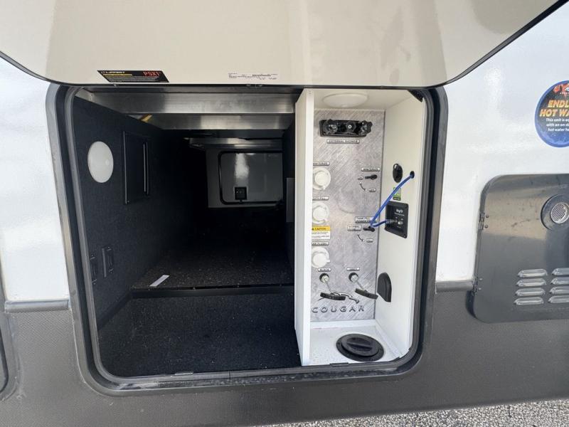 The Cougar Sport structural I-beam frame with stamped steel cross-members and outriggers, plus its laminated sidewalls with five-sided aluminum superstructure and Alpha Super Flex roof membrane are what active RVers love about the construction of the Cougar line. The Cougar Sport models are no exception when it comes to a great package, as well as being smaller and lighter weight than their big brother Cougar models. A one-piece, heated and enclosed polypropylene underbelly means a longer camping season. On the inside, residential shaker style hardwood cabinet doors and decorative crown molding, plus seamless pressed countertops and an on-demand water heater will make your unit feel even more like home. You are also sure to appreciate the shiplap style decorative accent wall behind the bed, a porcelain foot flush toilet in the bathroom, plus residential kitchen hardware, and so much more.