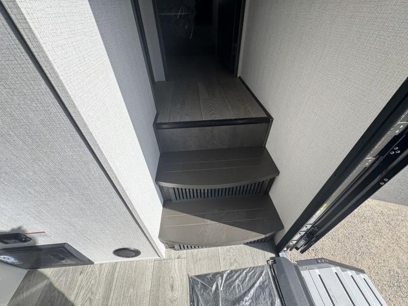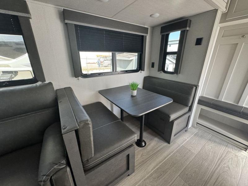 This lightweight fifth wheel is big enough for your small family to camp together! Enter to find a convenient combined kitchen and living space with large slide for added space. The slide features theater seating and a booth dinette which offers ample seating for meals and hanging out. There is a flip up table along the rear wall with a nearby 40" LED TV which features a butler pantry behind. Head up the steps to the right of the entry door to a complete bath and private front bedroom featuring a queen size bed with dual shirt wardrobes and nightstands on both sides of the bed. The bathroom offers a shower with a skylight for added headroom and natural lighting. Outside, a 16' awning provides added living space protected from the elements!