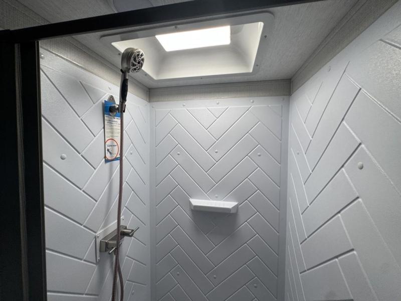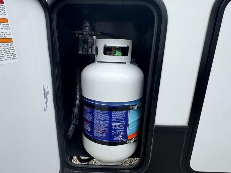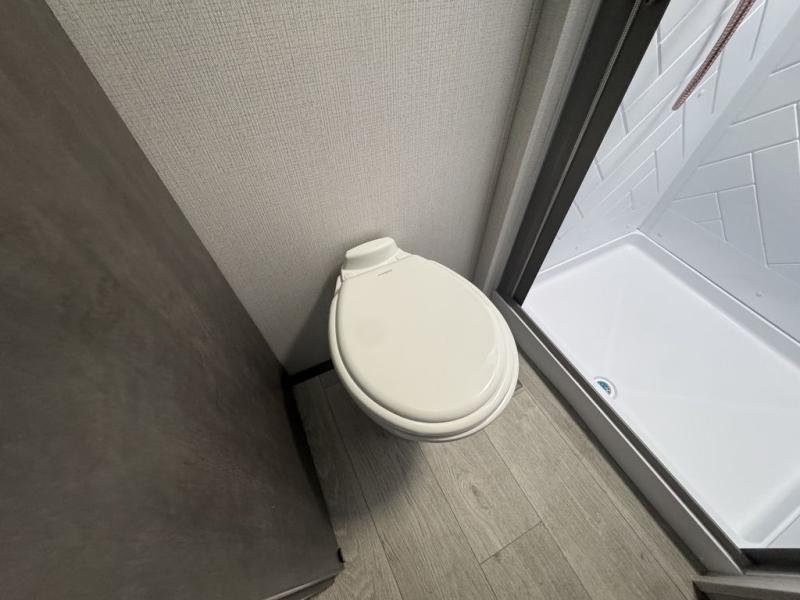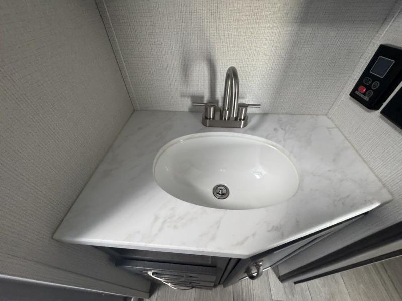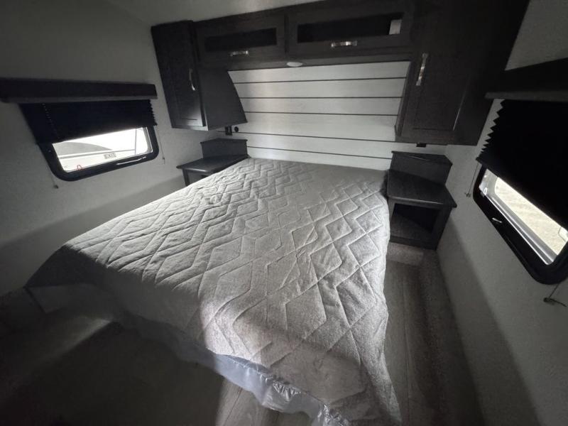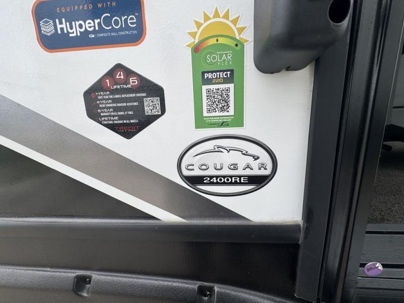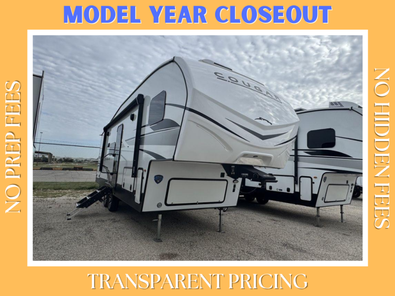 The Cougar Sport structural I-beam frame with stamped steel cross-members and outriggers, plus its laminated sidewalls with five-sided aluminum superstructure and Alpha Super Flex roof membrane are what active RVers love about the construction of the Cougar line. The Cougar Sport models are no exception when it comes to a great package, as well as being smaller and lighter weight than their big brother Cougar models. A one-piece, heated and enclosed polypropylene underbelly means a longer camping season. On the inside, residential shaker style hardwood cabinet doors and decorative crown molding, plus seamless pressed countertops and an on-demand water heater will make your unit feel even more like home. You are also sure to appreciate the shiplap style decorative accent wall behind the bed, a porcelain foot flush toilet in the bathroom, plus residential kitchen hardware, and so much more.