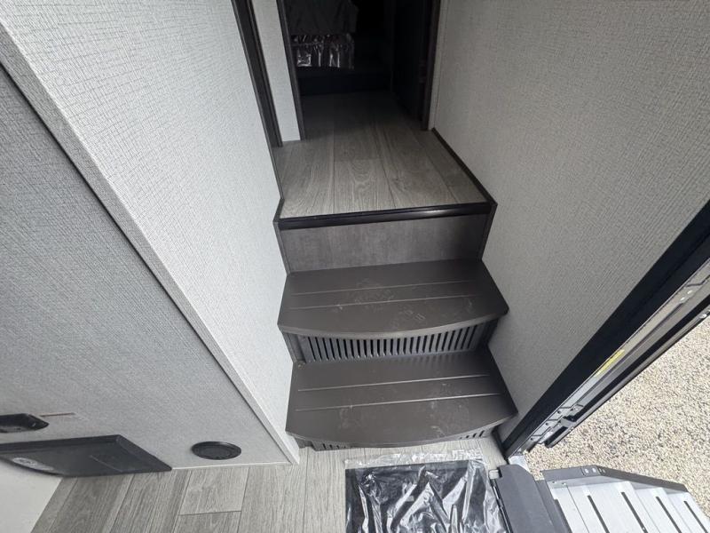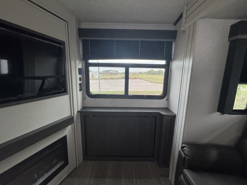 This lightweight fifth wheel is big enough for your small family to camp together! Enter to find a convenient combined kitchen and living space with large slide for added space. The slide features theater seating and a booth dinette which offers ample seating for meals and hanging out. There is a flip up table along the rear wall with a nearby 40" LED TV which features a butler pantry behind. Head up the steps to the right of the entry door to a complete bath and private front bedroom featuring a queen size bed with dual shirt wardrobes and nightstands on both sides of the bed. The bathroom offers a shower with a skylight for added headroom and natural lighting. Outside, a 16' awning provides added living space protected from the elements!