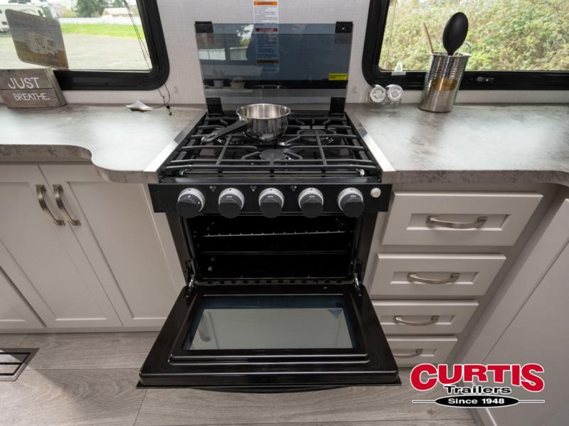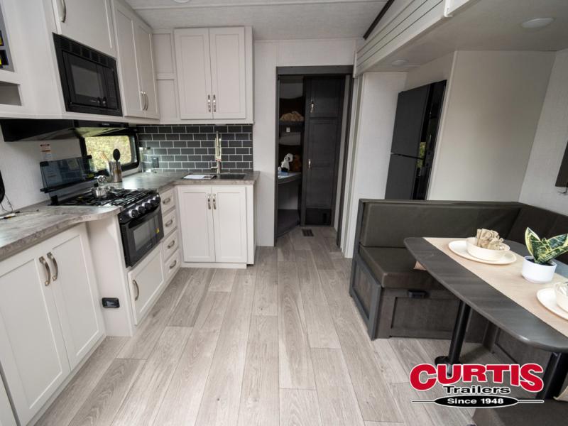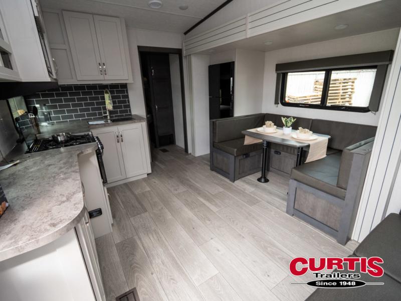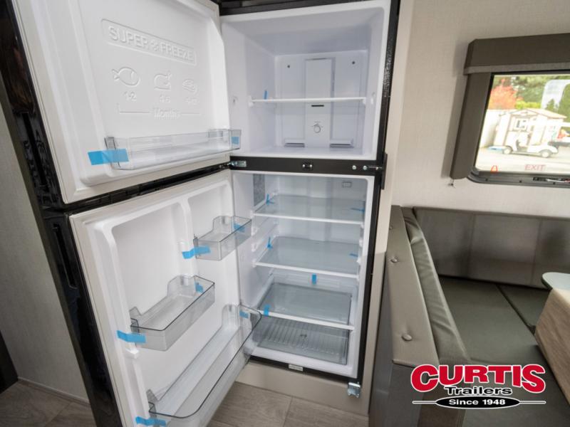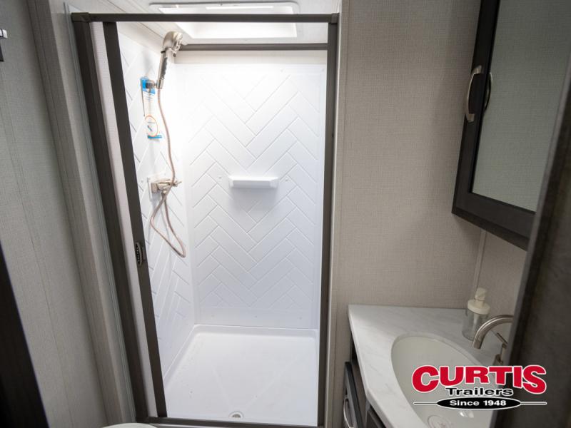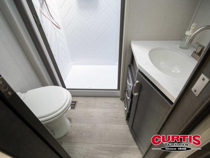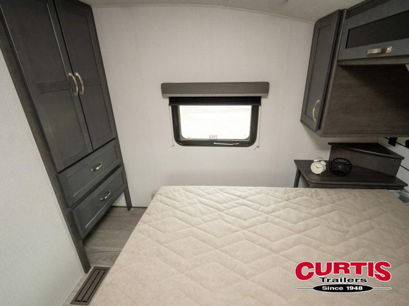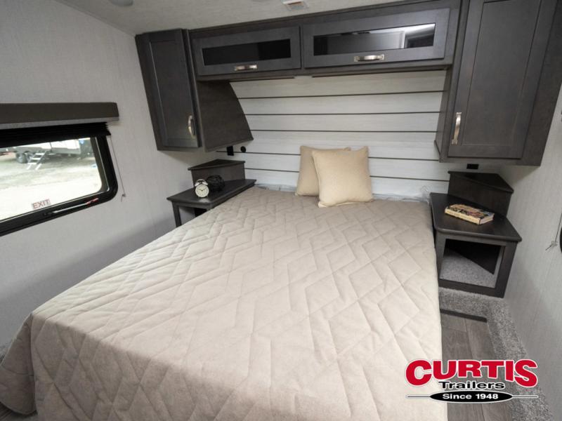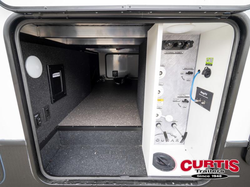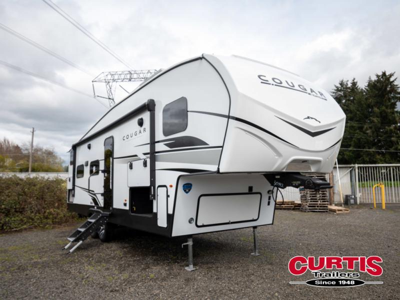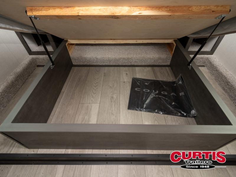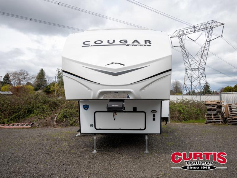 The Cougar Sport structural I-beam frame with stamped steel cross-members and outriggers, plus its laminated sidewalls with five-sided aluminum superstructure and Alpha Super Flex roof membrane are what active RVers love about the construction of the Cougar line. The Cougar Sport models are no exception when it comes to a great package, as well as being smaller and lighter weight than their big brother Cougar models. A one-piece, heated and enclosed polypropylene underbelly means a longer camping season. On the inside, residential shaker style hardwood cabinet doors and decorative crown molding, plus seamless pressed countertops and an on-demand water heater will make your unit feel even more like home. You are also sure to appreciate the shiplap style decorative accent wall behind the bed, a porcelain foot flush toilet in the bathroom, plus residential kitchen hardware, and so much more.
