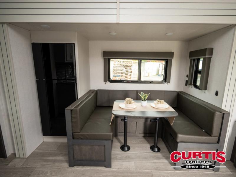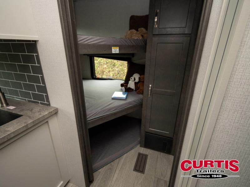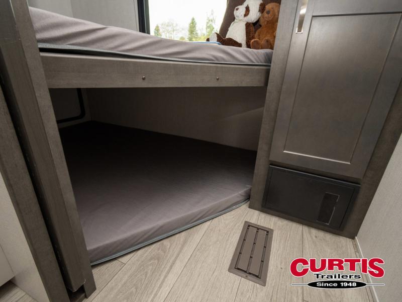 This lightweight Cougar Sport bunk model features sleeping for ten or more with triple stacked double bed bunks in the rear bunk room, a large U-shaped dinette that can be transformed into sleep space, as well as a tri-fold sofa sleeper and a queen bed in the private bedroom up front. The U-shaped dinette will seat quite a few of you for meals and even game time, plus the sofa is nearby for even more to kick back on. A fully equipped kitchen with overhead microwave, a three burner range, and large sink plus storage will make it easy to keep everyone fed and happy. A 10.4 Cu. Ft. 12 volt refrigerator will keep all of your perishable items fresh, and there are plenty of cabinets for storing snacks and dry goods as well. Head up the steps to the bathroom featuring a shower with a skylight, sink with overhead medicine cabinet, and toilet. The private front bedroom takes you away from the hustle and bustle of the main living area and bunkhouse to provide a relaxing retreat including a comfy queen bed, dual nightstands and shirt wardrobes as well as an additional wardrobe along the interior wall for even more storage.