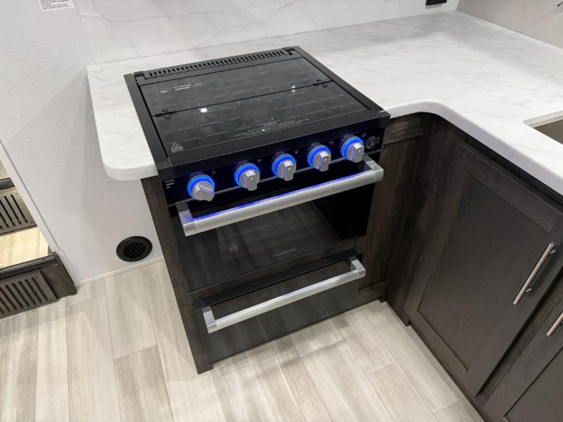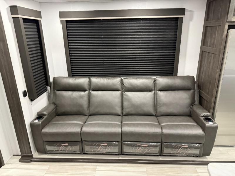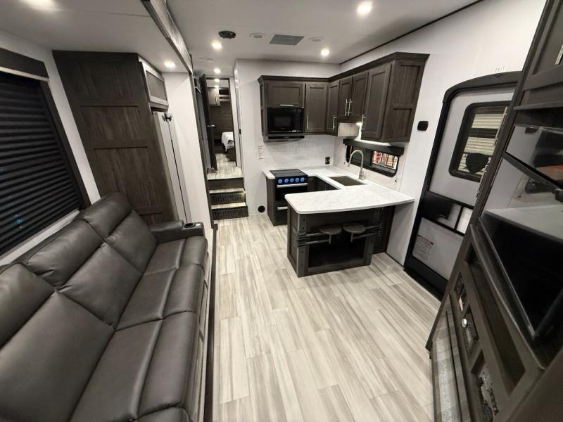Looking for a triple axles, a separate garage and extra sleeping space for friends? This fifth wheel offers dual entry doors for a smooth flow of traffic, double slides for more interior floor space, and a 15' garage area for your toys as well as dining and sleeping space! The U-shaped kitchen countertop includes exclusive swing-out bar stools where two can eat at, plus there are three pantries for all the dry goods and snacks. The dual entry bath will create a front master suite that will feel just like home, and there is a convenient half bath in the garage that will be handy during the day and night. This fifth wheel also includes an LED TV and a fireplace for inside entertainment.