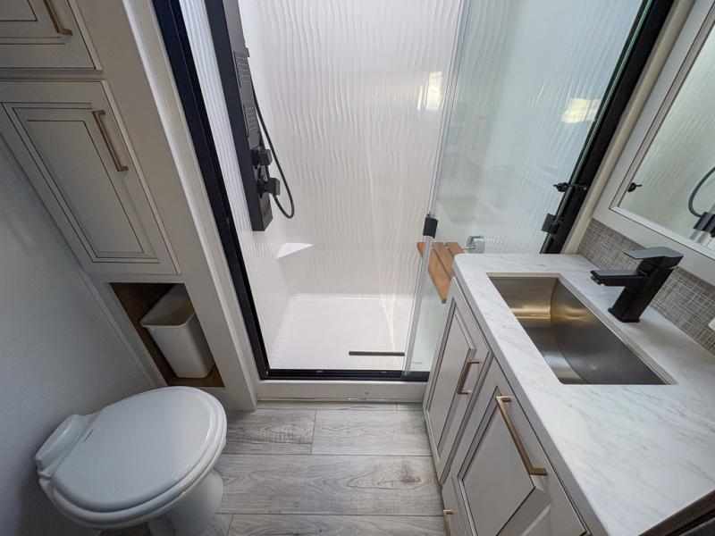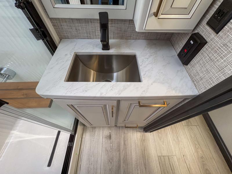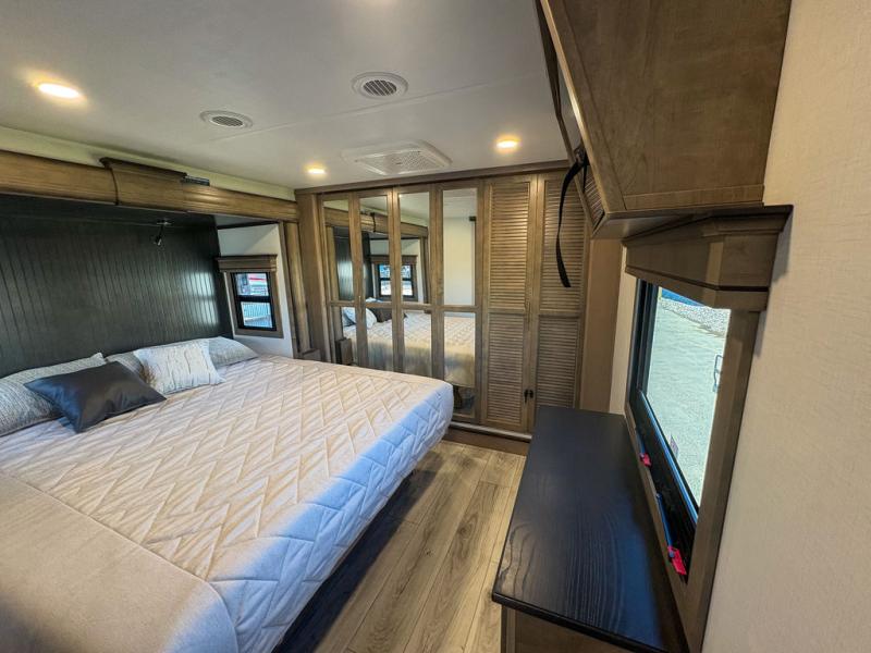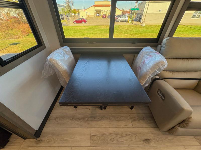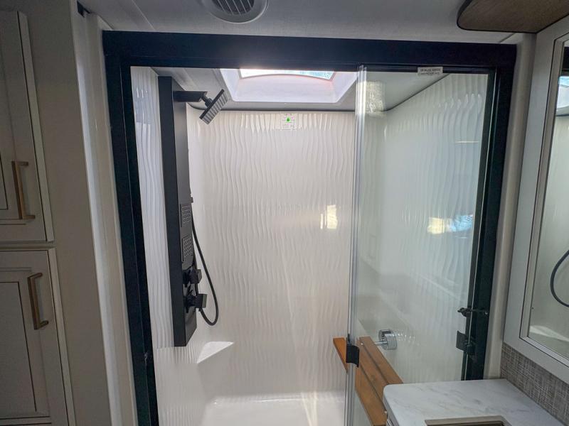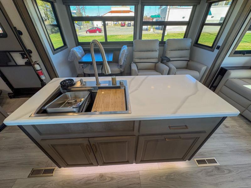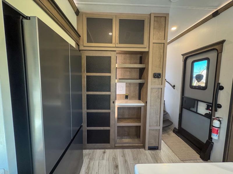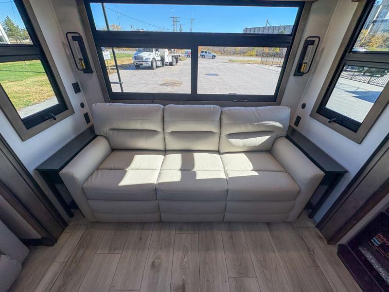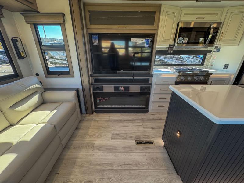 Luxury abounds throughout this fifth wheel! Starting in the kitchen with the island, floor to ceiling pantry with shelves, 24" range, and residential convection microwave. The full bathroom has a 48" x 30" fiberglass shower with a seat, decorative glass enclosure, and a skylight above it for more natural lighting. Sleep like a baby in the front private bedroom on the king bed slide with storage underneath and keep your clothes looking their best with the front closet that has a clothing hamper and stackable washer and dryer prep. The rear living area offers true relaxation with a hide-a-bed sofa and power theater seating across from the entertainment center with a 5,000 BTU decorative fireplace heater and 50" Smart TV to watch your favorite movies!
