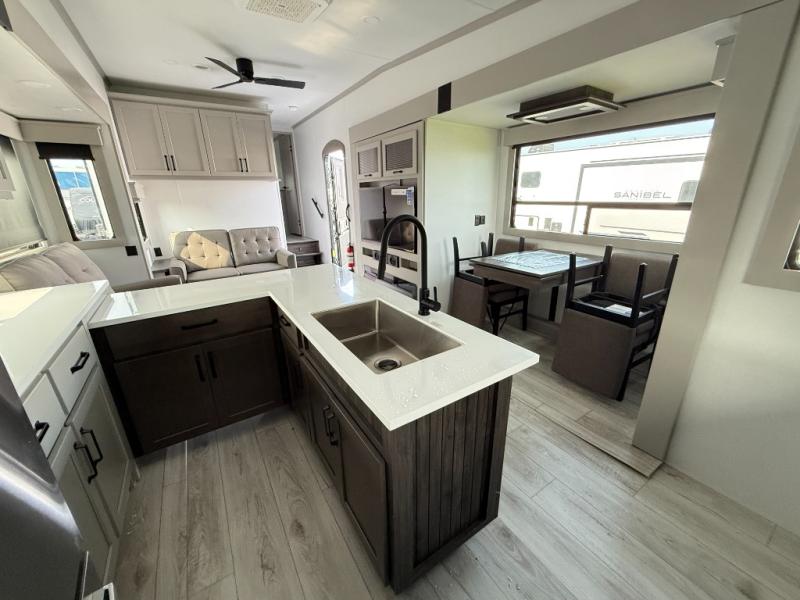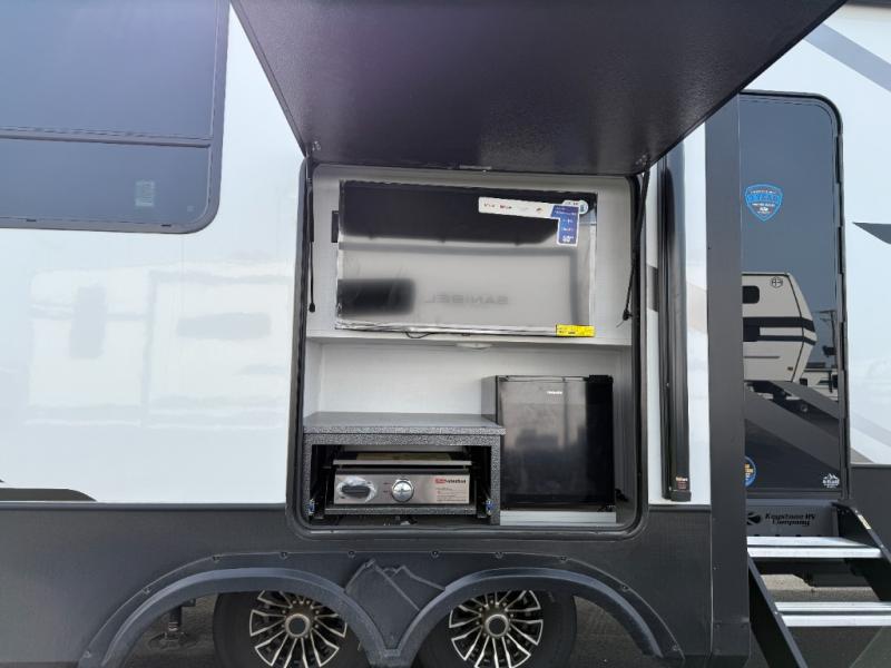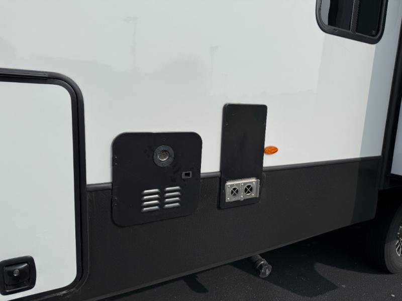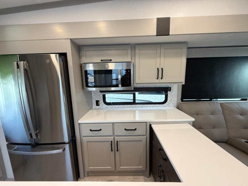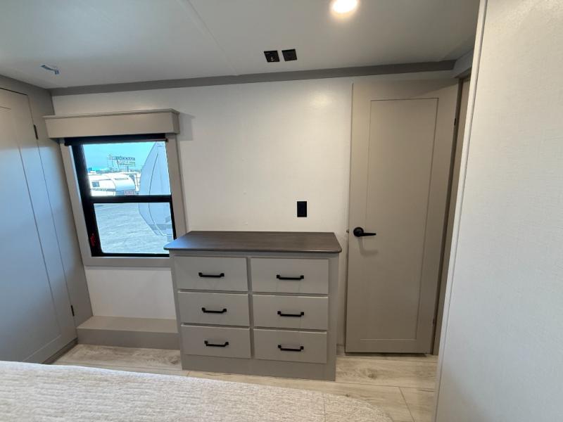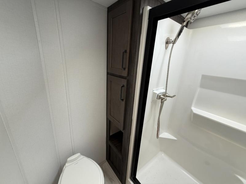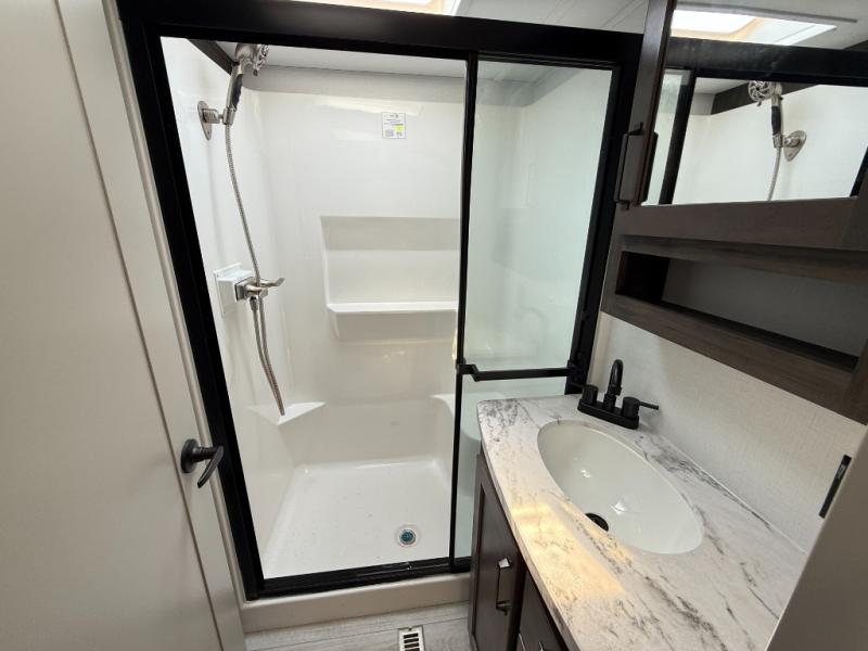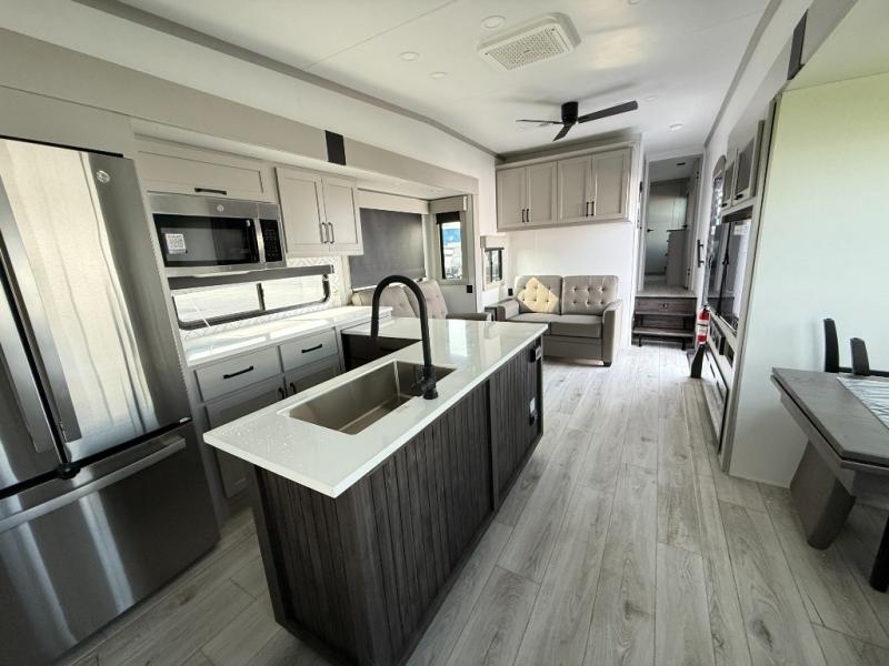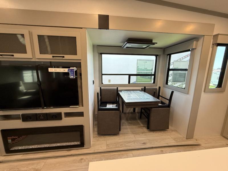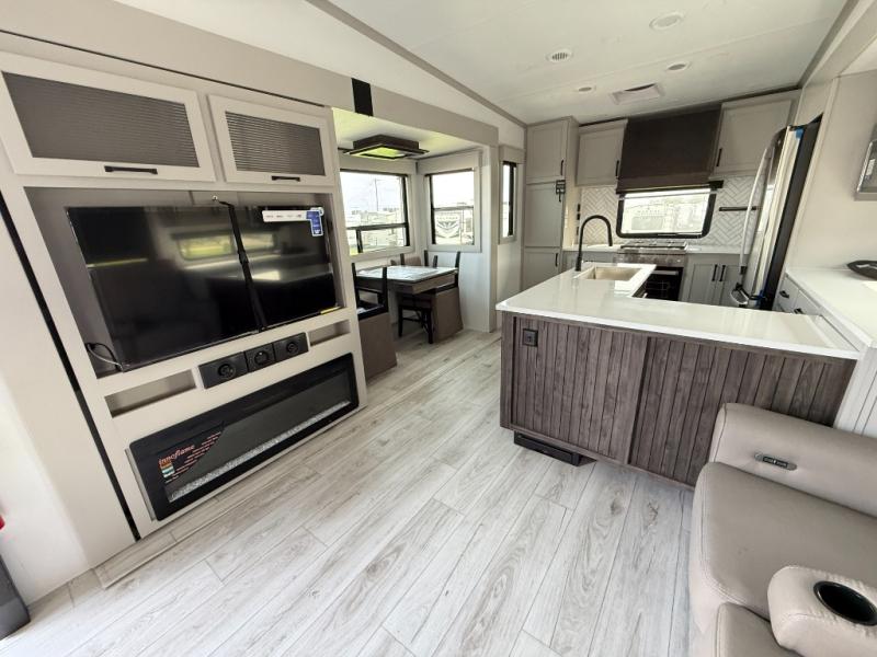This rear kitchen fifth wheel features ample counter space, an L-shaped counter, plus a spacious pantry and residential refrigerator for food storage. Your crew can relax on the hide-a-bed sofa and power theater seating, or dine at the booth dinette. There is also an entertainment center and fireplace with a hidden pantry behind it for board games and movies. A full bath includes a shower with a seat for added comfort, and the front private bedroom with a king bed slide is sure to bring a great night's rest. You'll find a spacious wardrobe and a dresser to keep your clothes organized, plus washer and dryer prep if you want to add these appliances.
