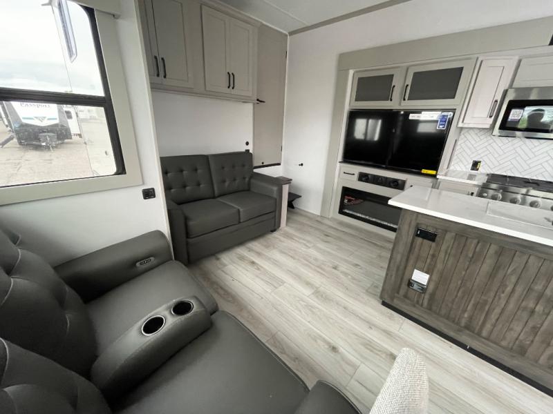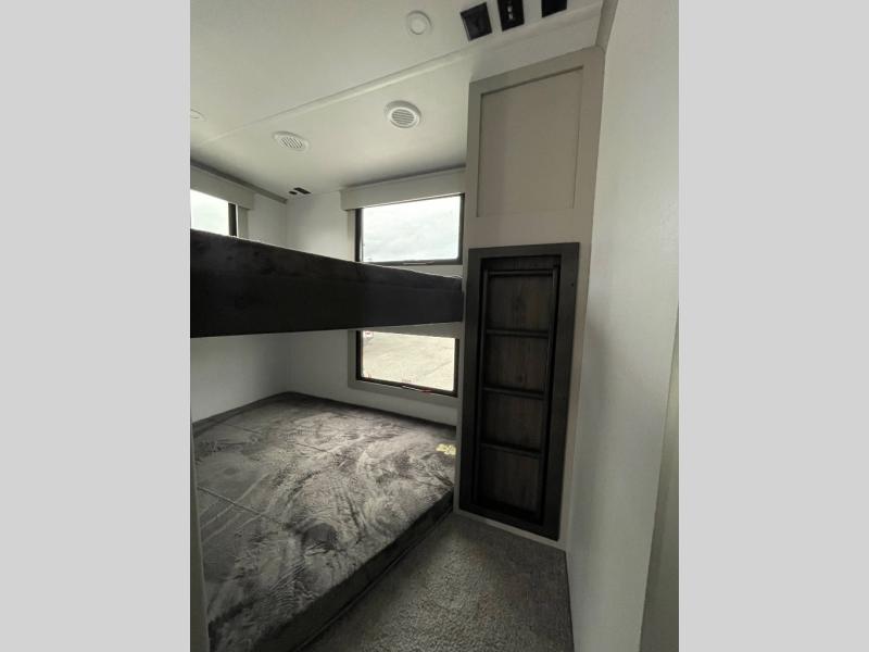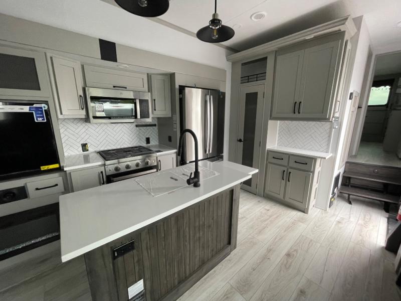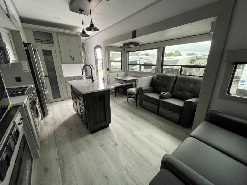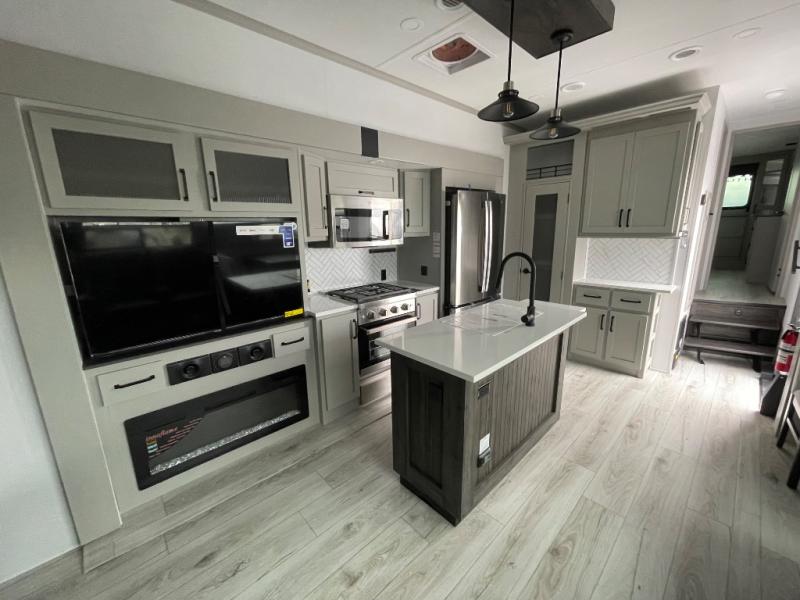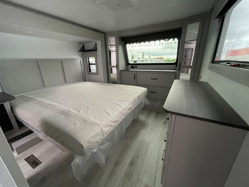 You will be living in true luxury with this Montana High Country fifth wheel! First of all, you'll have your own master suite up at the front which happens to have a Lippert duo memory foam mattress for great comfort. The bedroom also has great storage space for your clothes with the two dressers and two wardrobes. Second, there is a great sleeping area in the back for the extra travelers you have with you. The RV queen-size bunks allow four adults to sleep comfortably each night in this area, and there is even a hide-a-bed sofa next to the bunks for yet another set of sleepy campers. The power theater seating sits directly across from the fireplace and 50" LCD TV, and the kitchen island has a countertop extension for even more prep space in the kitchen.
