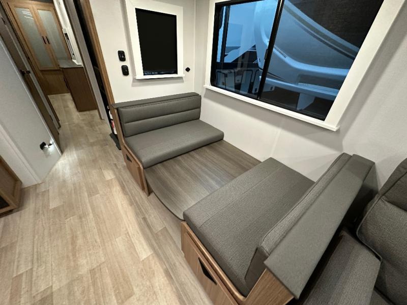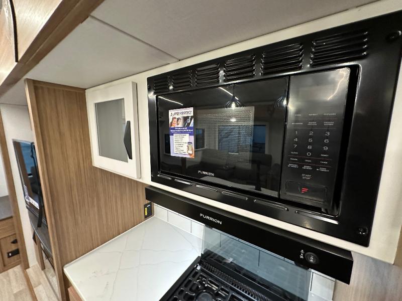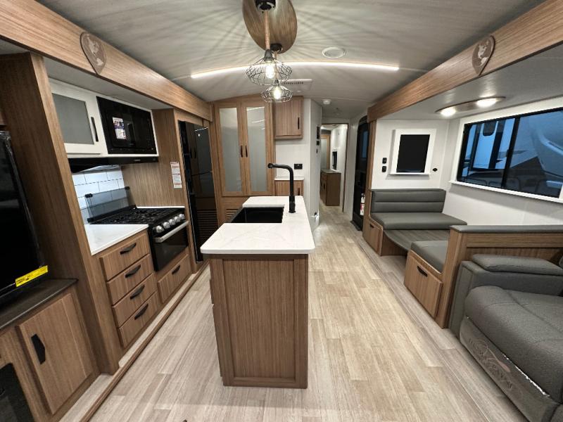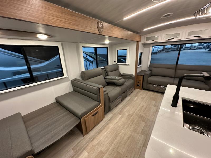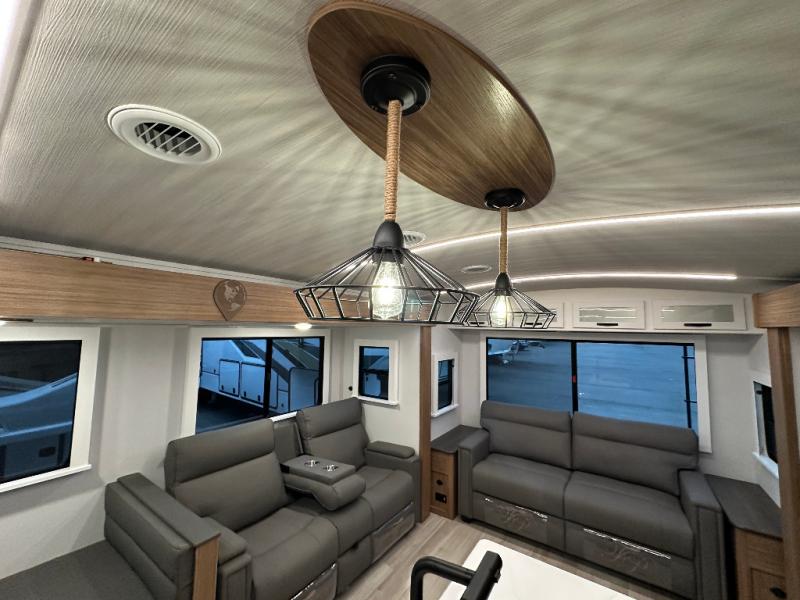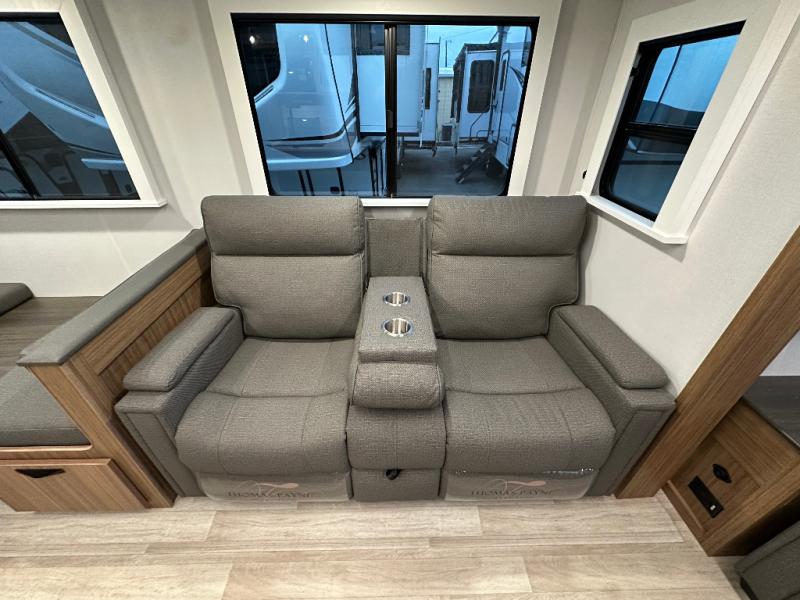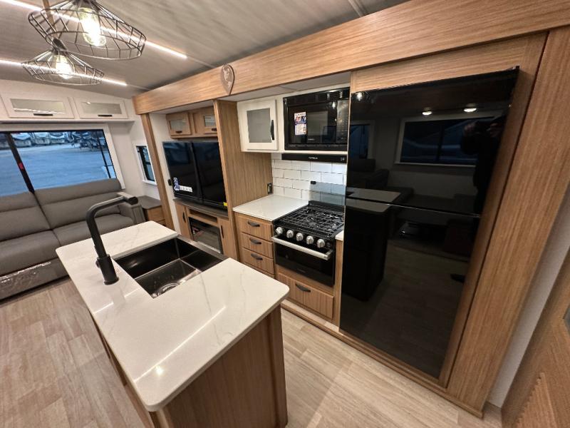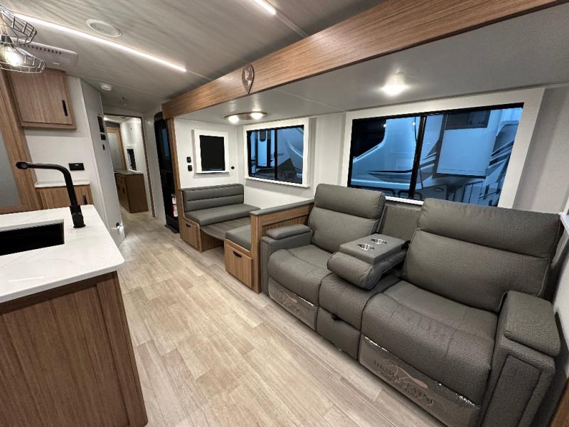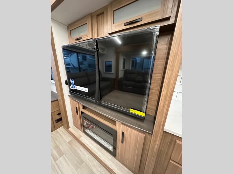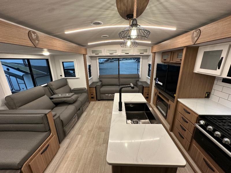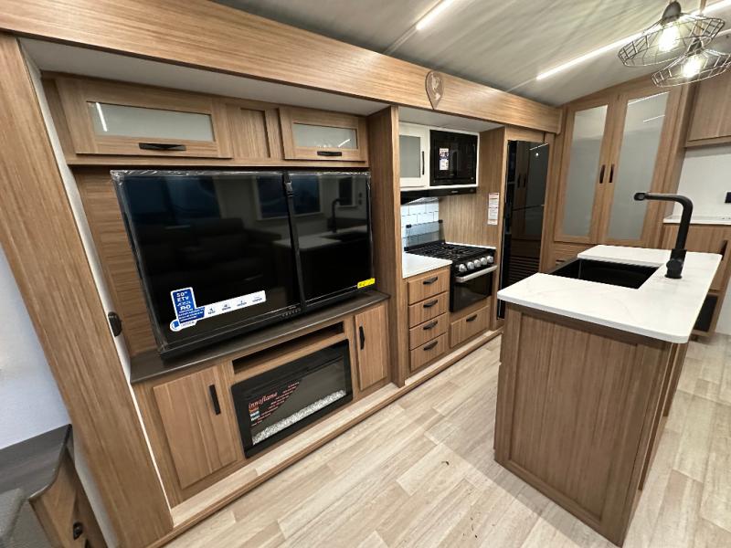 You will feel right at home in this travel trailer! The front private bedroom has a king bed slide to lay your head on at night, a front closet with washer and dryer prep, and a wardrobe with TV prep. Just outside the bedroom is the full bathroom with a shower with a skylight for added natural lighting as you get ready. Now that you're ready for the day, you can head to the fully equipped kitchen complete with a kitchen island to whip up some delicious cinnamon rolls that can be enjoyed at the Do-More Dinette table. The rear living area not only has luxury cinema recliners, but also a 68" tri-fold sofa by an entertainment center with a fireplace!