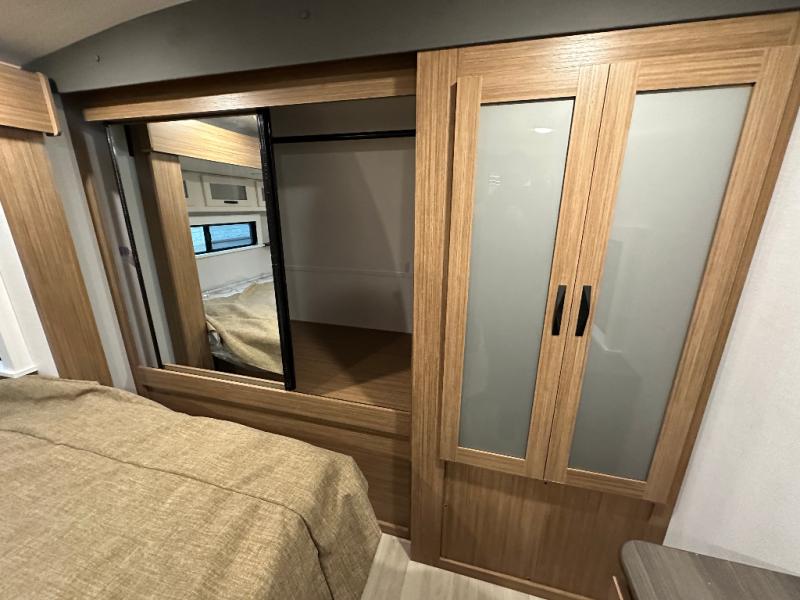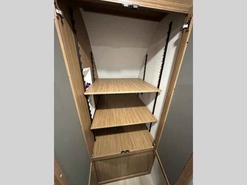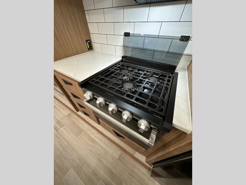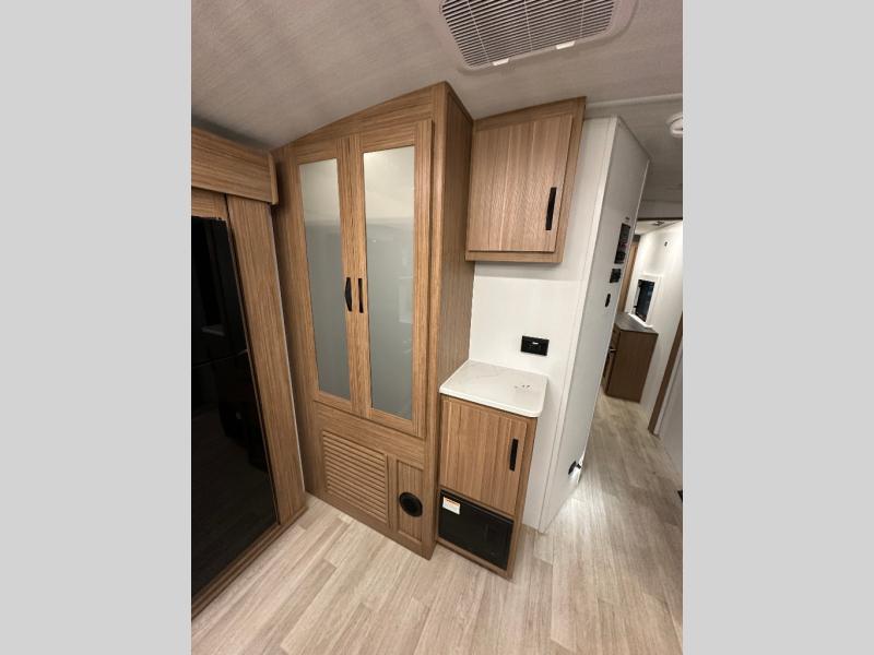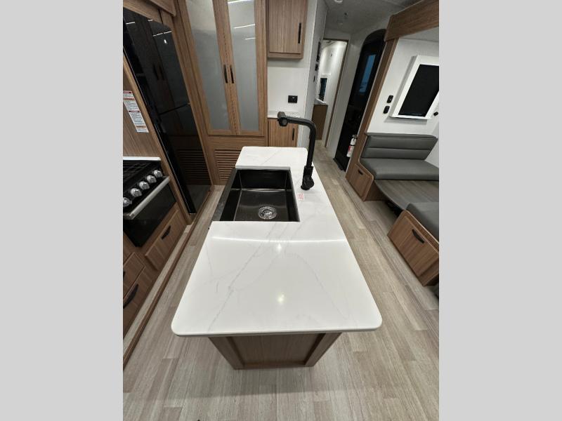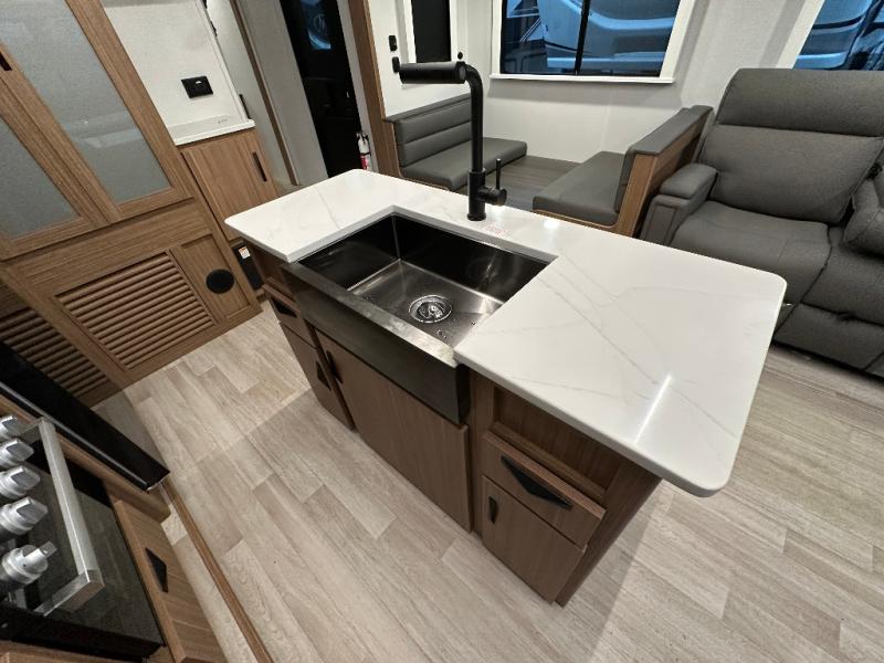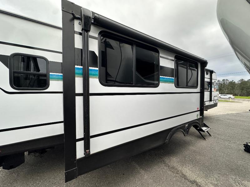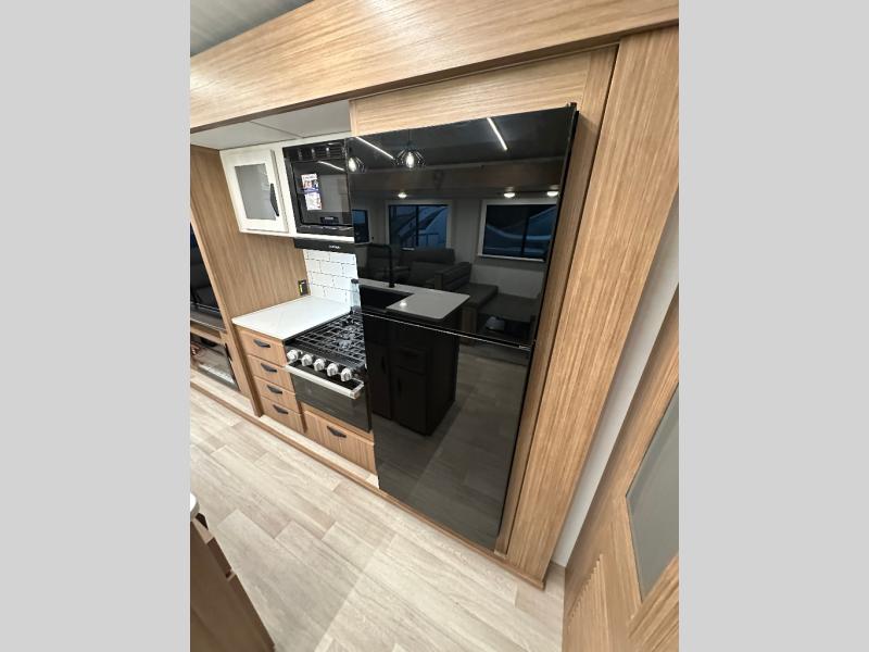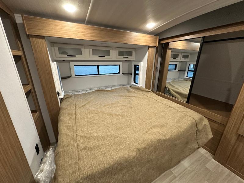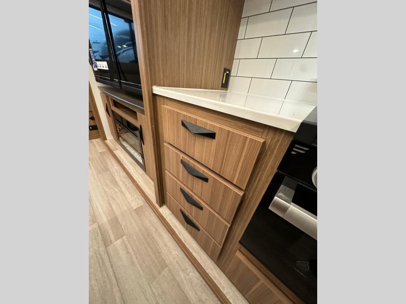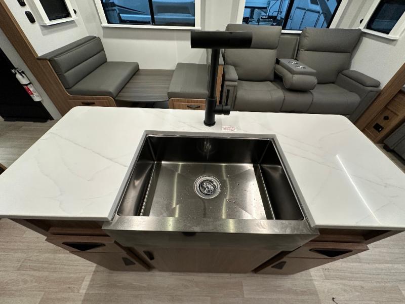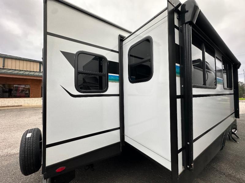 You will feel right at home in this travel trailer! The front private bedroom has a king bed slide to lay your head on at night, a front closet with washer and dryer prep, and a wardrobe with TV prep. Just outside the bedroom is the full bathroom with a shower with a skylight for added natural lighting as you get ready. Now that you're ready for the day, you can head to the fully equipped kitchen complete with a kitchen island to whip up some delicious cinnamon rolls that can be enjoyed at the Do-More Dinette table. The rear living area not only has luxury cinema recliners, but also a 68" tri-fold sofa by an entertainment center with a fireplace!