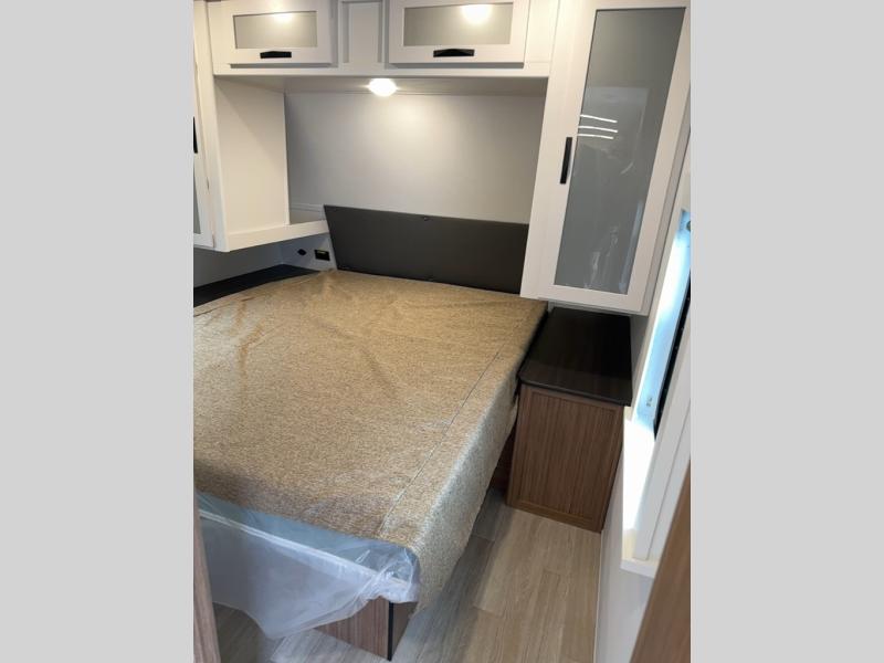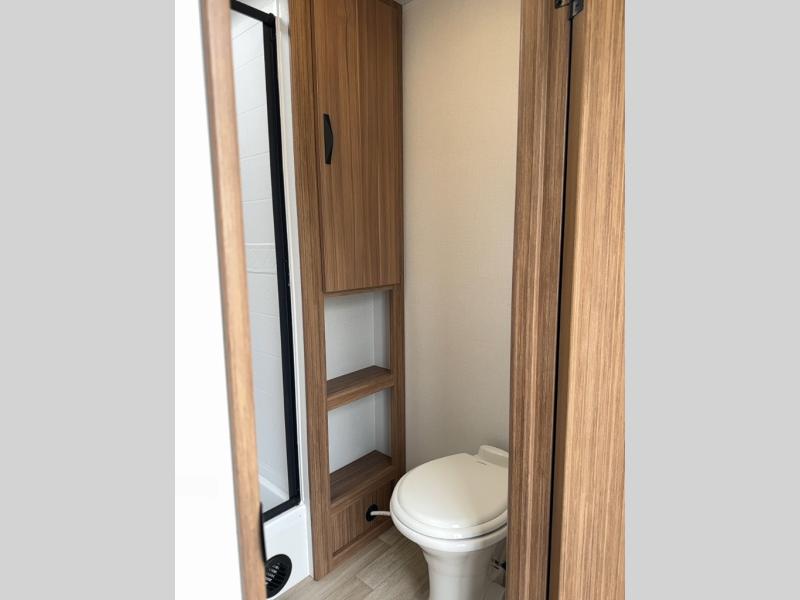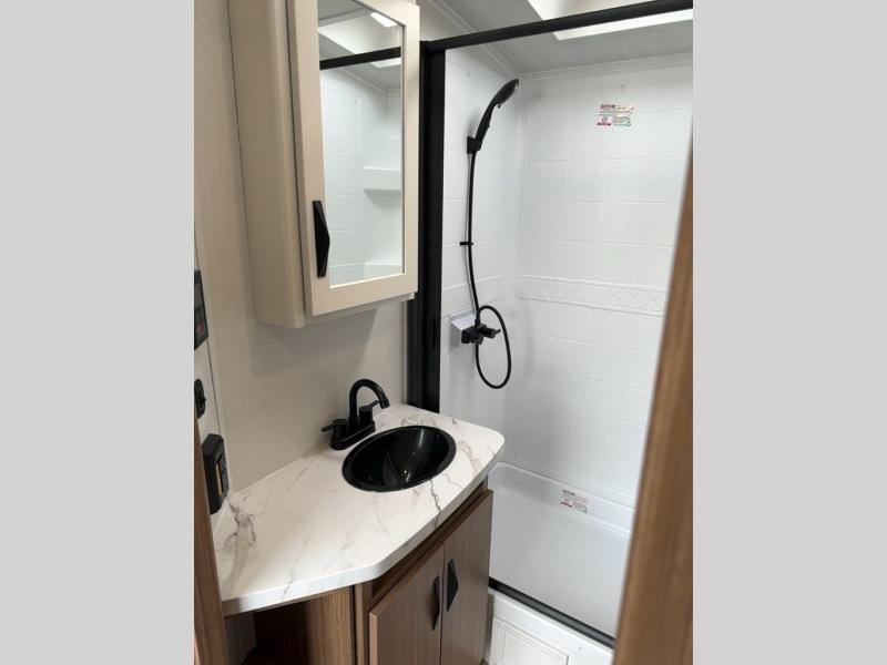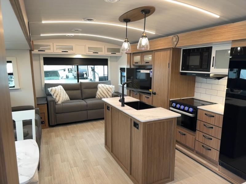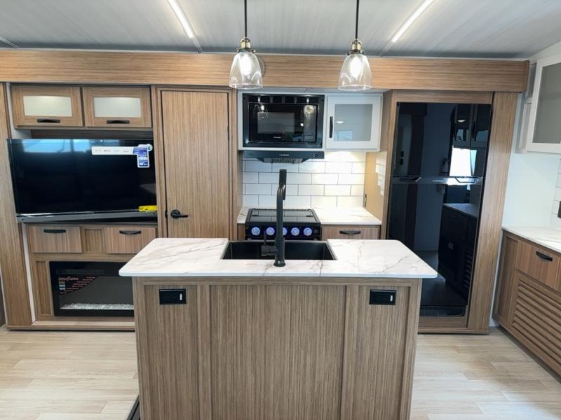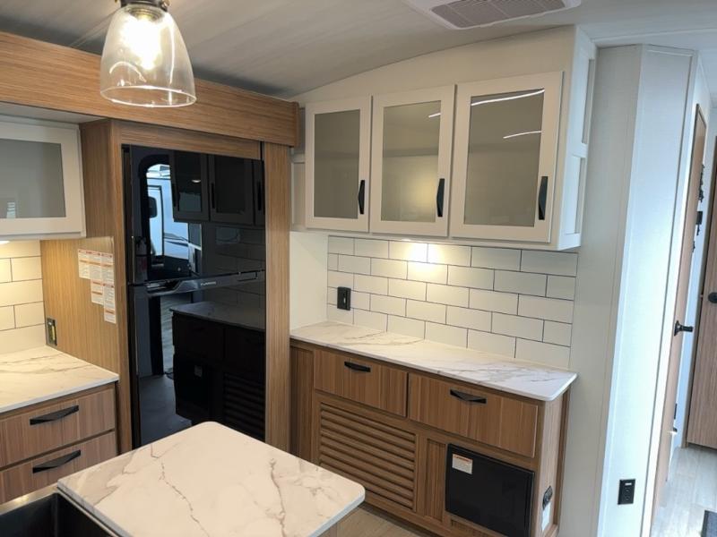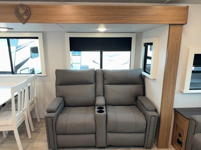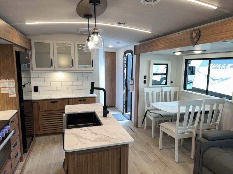 Pack your bags and hitch up this travel trailer for a fun weekend getaway! The rear living area has a tri-fold sofa sleeper with end tables to set your bag of popcorn that was popped in the microwave and theater seating across from the entertainment center with a TV and a fireplace. The kitchen island will make meal prepping easier and you can enjoy your meals at the booth dinette or switch it out for the optional free standing dinette. Freshen up in the full bathroom with the shower that has a skylight above for more natural lighting. Head to the front private bedroom when you're ready to wind down your nights and get a good night's rest on the queen bed with nightstands and wardrobes on either side of it!