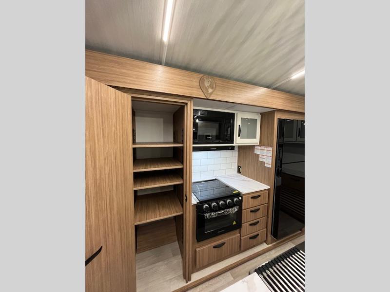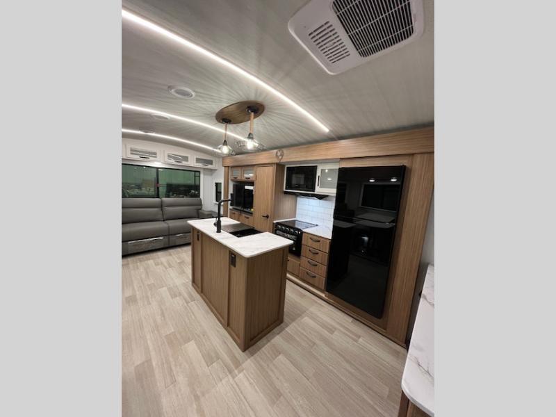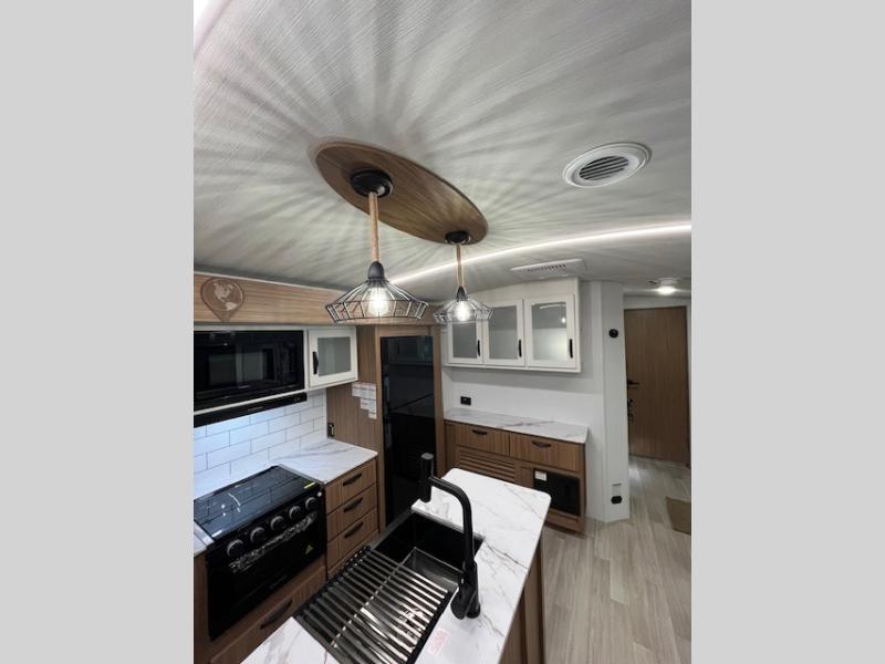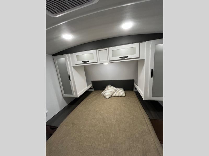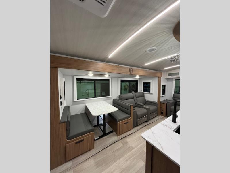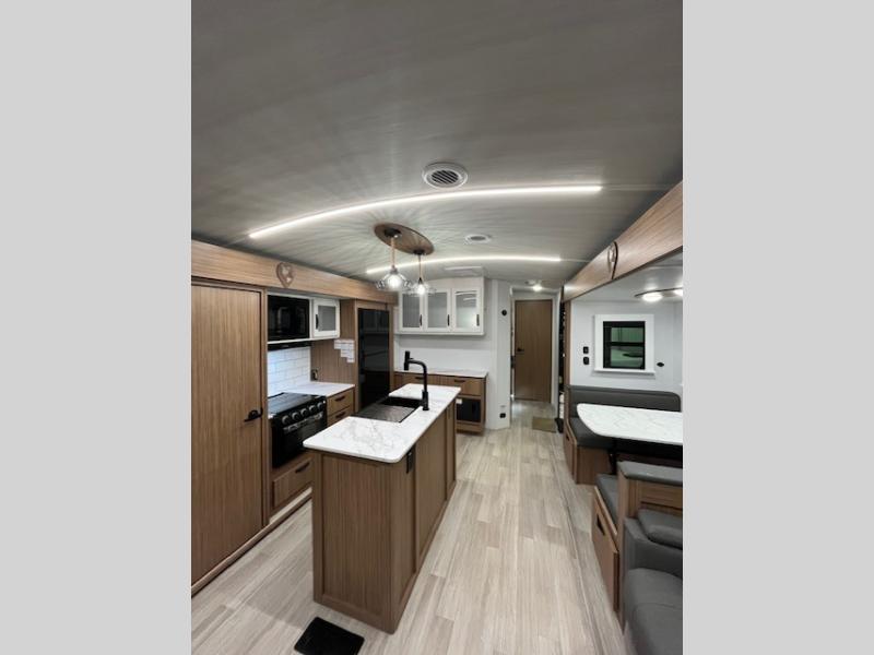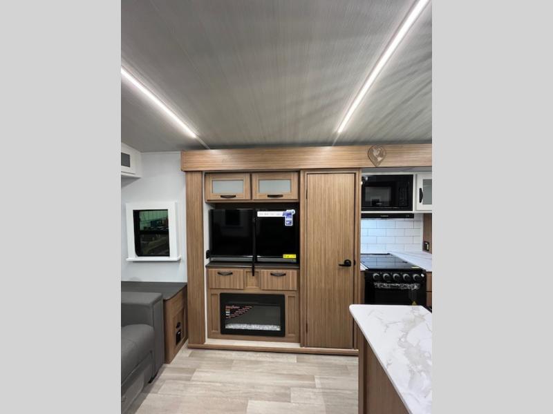 This is the travel trailer you've been searching for with a spacious interior, a front private bedroom, and a kitchen island for more counter space! Your crew can relax on the tri-fold sofa sleeper and luxury cinema recliners, or play a game at the Do-More dinette table. There is also an entertainment center and a fireplace to make this space feel more like home. A full kitchen, complete with a large pantry and 12V refrigerator will keep the chef of your group happy, and the full bath will let everyone clean up before bed. When it's time to call it a night, the front bedroom with a queen bed will be waiting for you, while your guests sleep on the sofa and dinette.