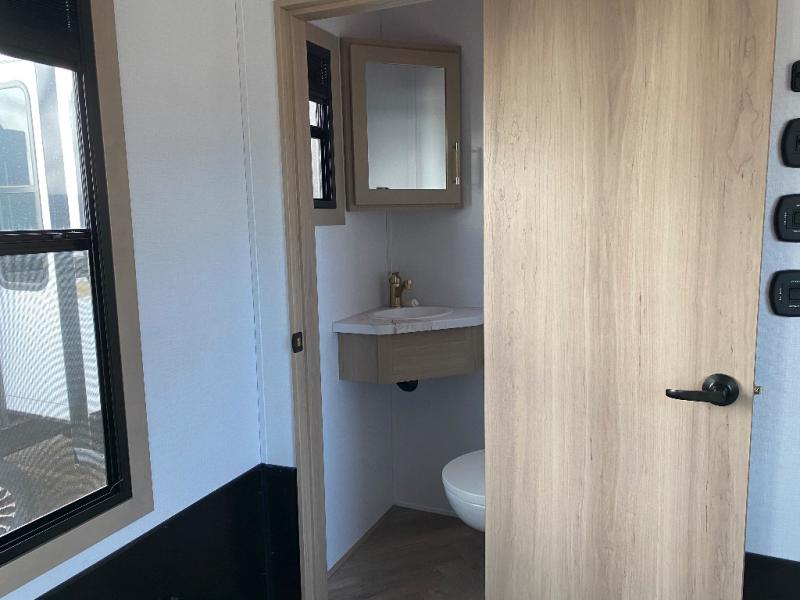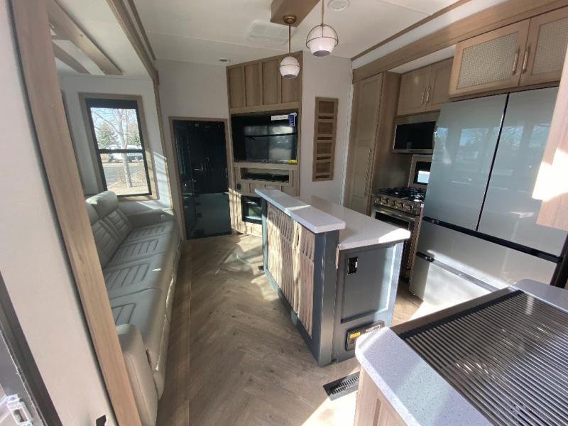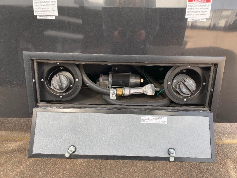 You will have everything you need for a comfortable camping trip and then some with this toy hauler! Load your toys into the 16' garage area with the zero gravity ramp door and secure them with 5,000 lb. frame welded tie-downs. The garage also has an electric bed above dual opposing sofas with a table in between, a loft with a twin bed, a half bathroom, and washer and dryer prep. Create your best meals with the four burner cooktop and enjoy the company of others sitting at the kitchen island with three bar stools while you prepare it. Relax in true comfort on the 4-seat recliner across from the entertainment center with a fireplace. When you're ready to wind down your nights, take a hot shower in the dual entry bathroom then head directly into the front private bedroom which features a king bed suite with a large front wardrobe for clothing storage, and washer/dryer prep in case you wish to add appliances so you can wash your clothes while you are away!
