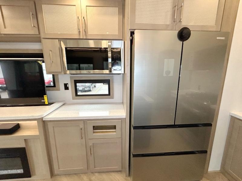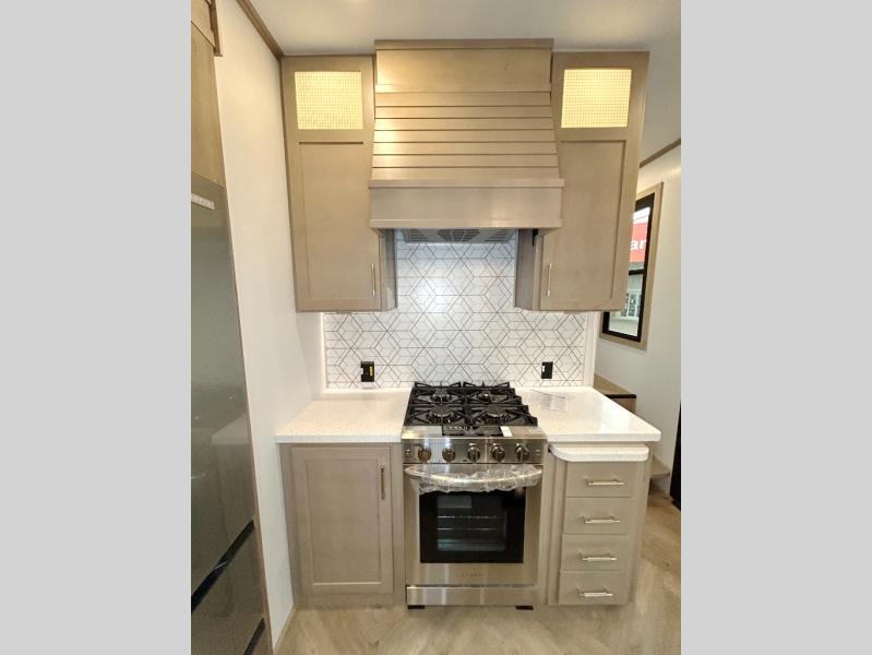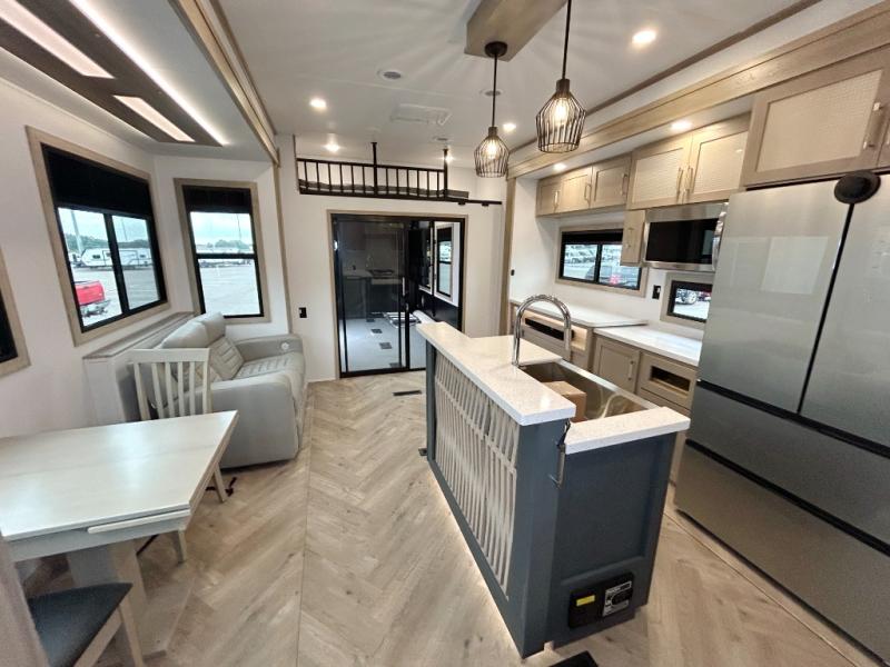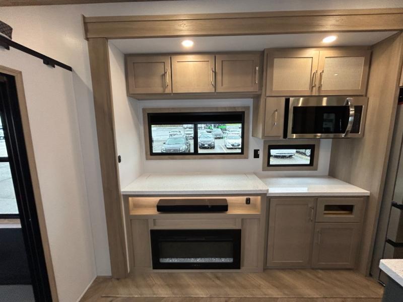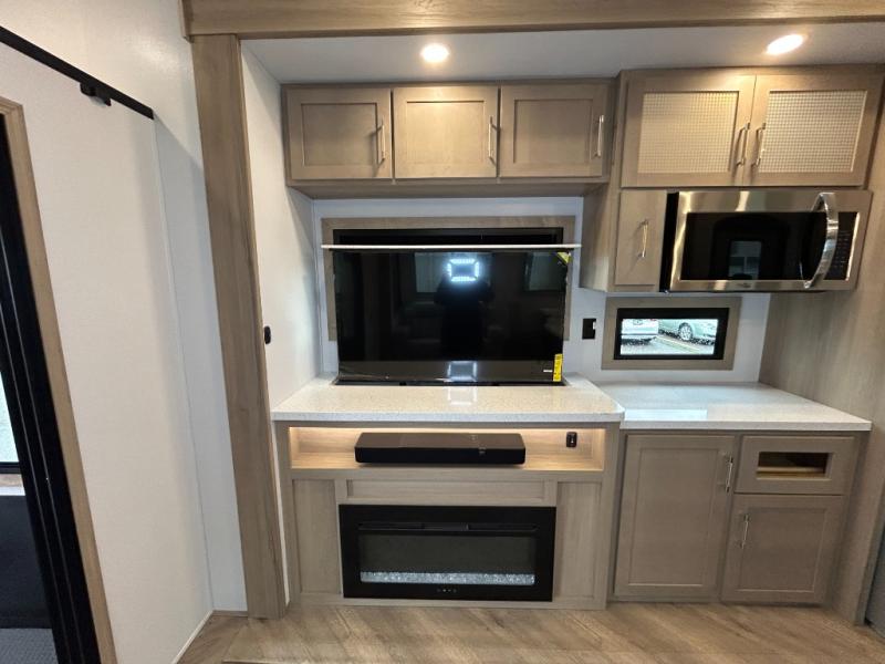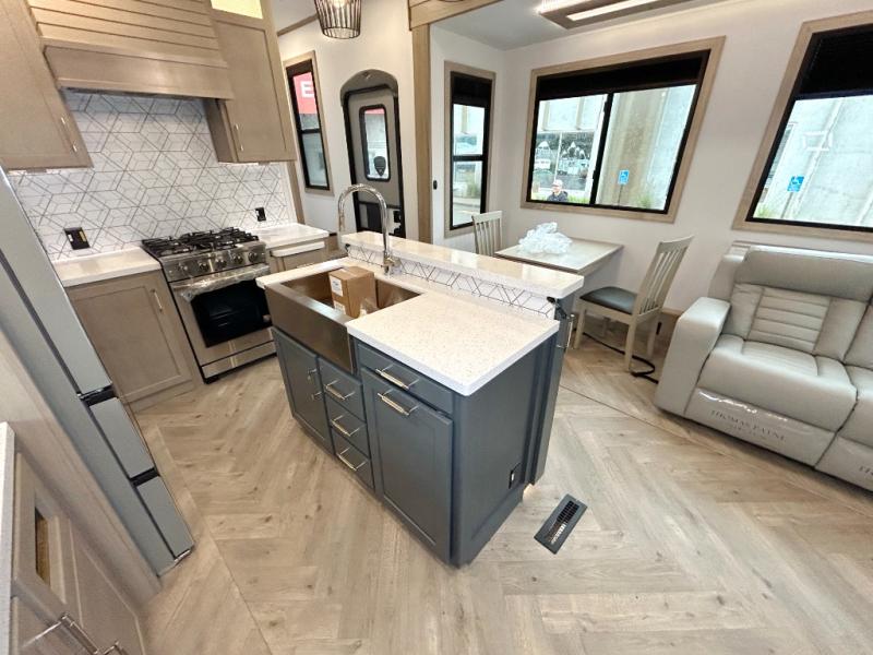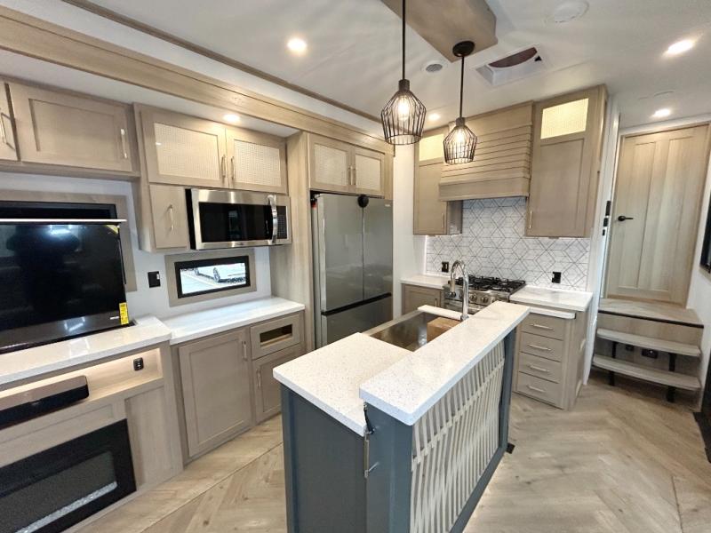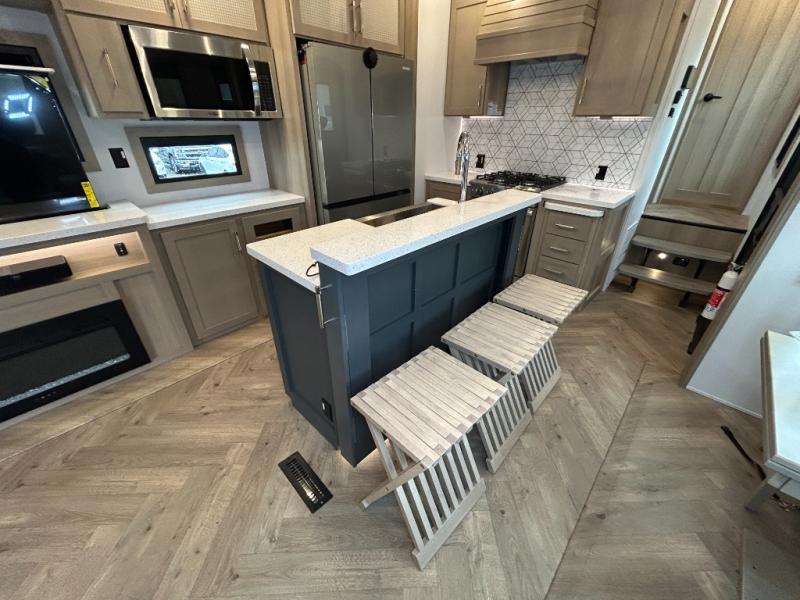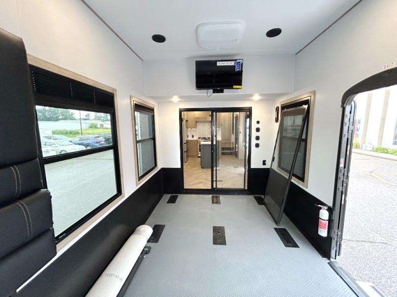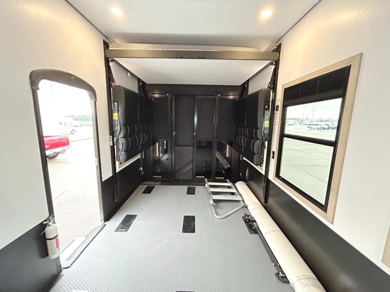 With a 15' garage area, you can bring your favorite off-road toys in this toy hauler! The exclusive ramp door with backup camera makes it easy to load them up and once you have arrived you can set up the dual opposing sofas, the queen bed above them, and the 32" bunk loft, plus there is even one of the dual entry doors to the unit. While the chef is preparing dinner on the Lasus 24" range and oven, three others can sit at the kitchen island with raised countertop and three folding bar stools or at the dinette table to play a game or simply socialize all together. When mother nature is raining on your parade, relax on the reclining theater seating with lumbar and tilting headrest, and enjoy the entertainment center with fireplace and 50" Smart LED TV. The front private bedroom will have you feeling right at home with a king bed slide, a large wardrobe with an area next to it prepped for a washer and dryer, a dresser with hidden storage, and a LED Smart TV. The full bathroom has a 40" x 28" shower with a seat to freshen up in each morning!