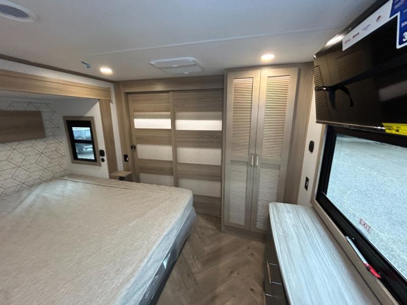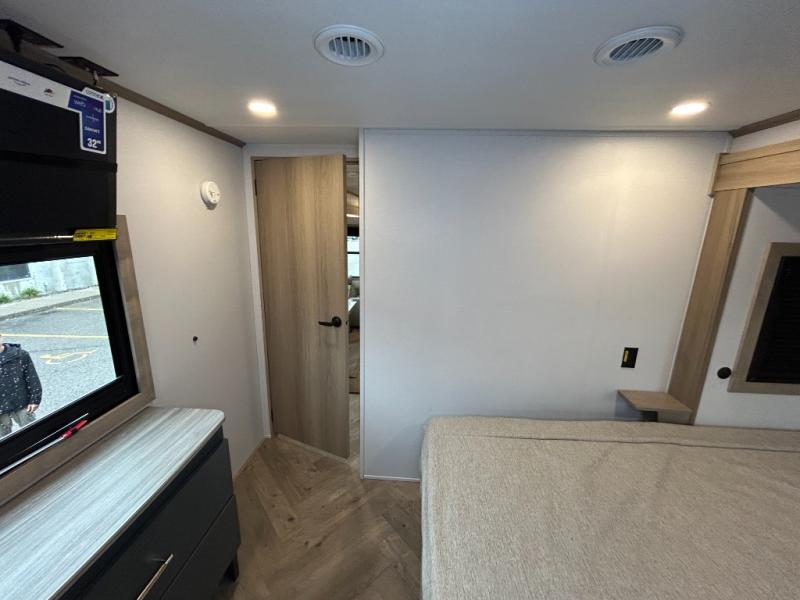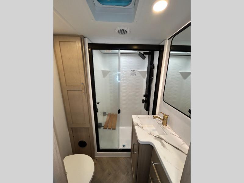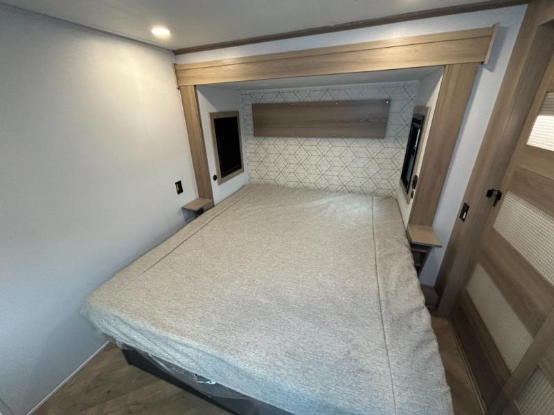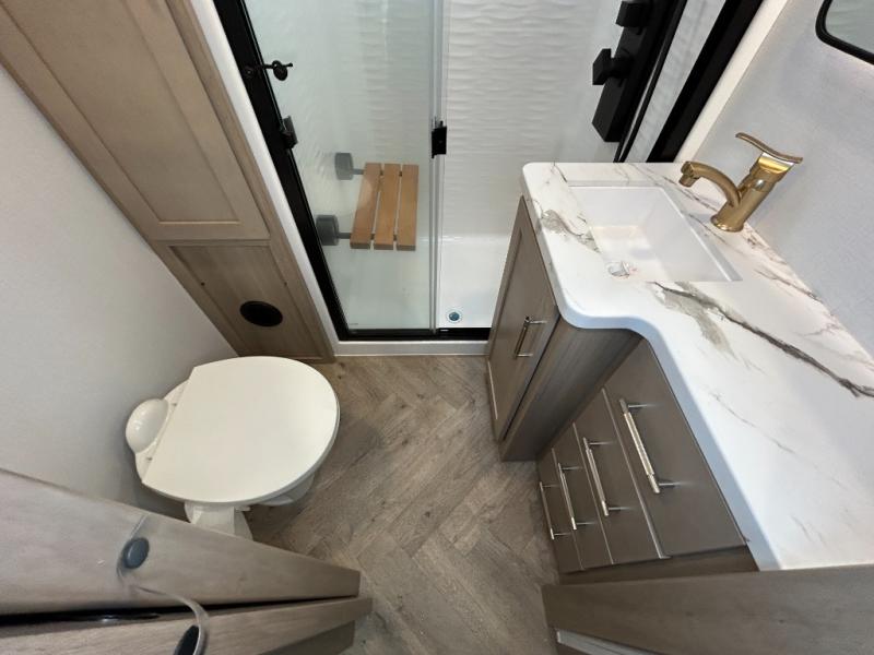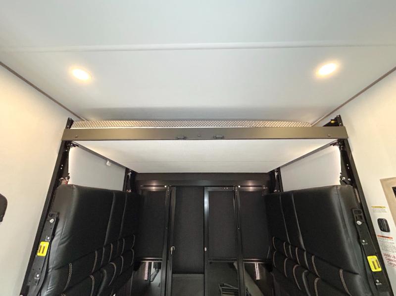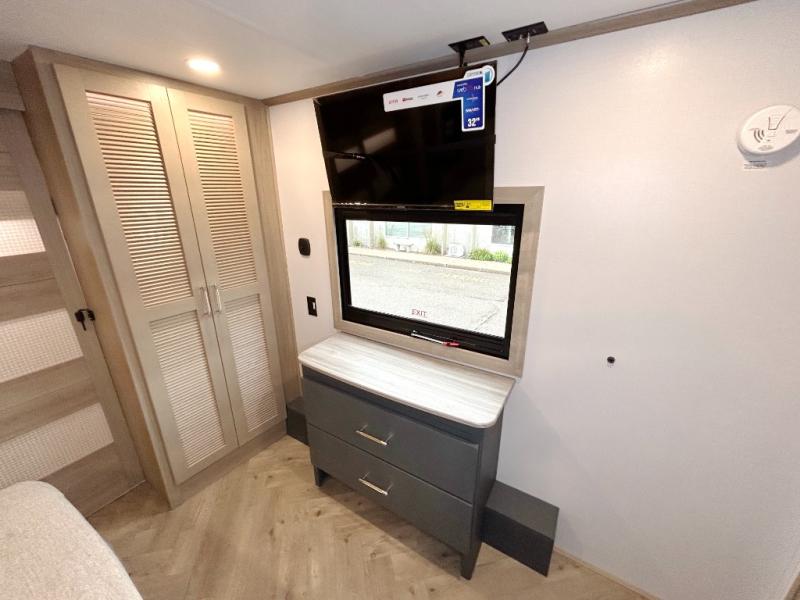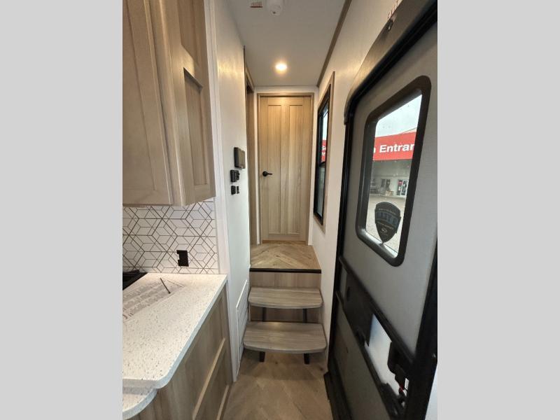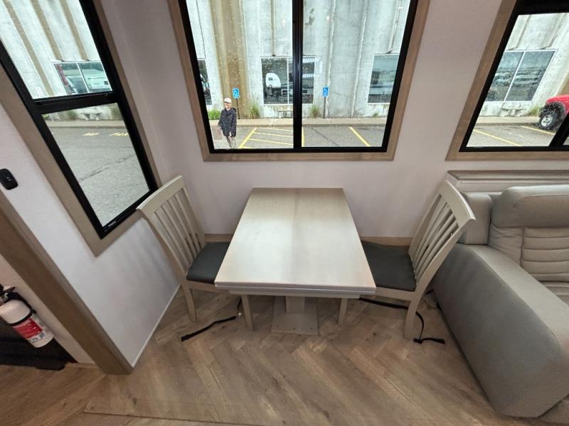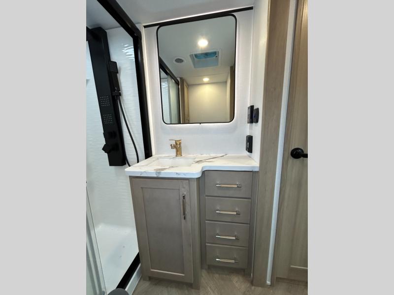 With a 15' garage area, you can bring your favorite off-road toys in this toy hauler! The exclusive ramp door with backup camera makes it easy to load them up and once you have arrived you can set up the dual opposing sofas, the queen bed above them, and the 32" bunk loft, plus there is even one of the dual entry doors to the unit. While the chef is preparing dinner on the Lasus 24" range and oven, three others can sit at the kitchen island with raised countertop and three folding bar stools or at the dinette table to play a game or simply socialize all together. When mother nature is raining on your parade, relax on the reclining theater seating with lumbar and tilting headrest, and enjoy the entertainment center with fireplace and 50" Smart LED TV. The front private bedroom will have you feeling right at home with a king bed slide, a large wardrobe with an area next to it prepped for a washer and dryer, a dresser with hidden storage, and a LED Smart TV. The full bathroom has a 40" x 28" shower with a seat to freshen up in each morning!