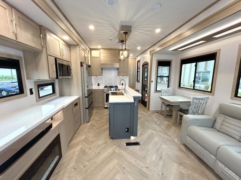 Experience a breath of fresh air with one of these Keystone RV Raptor fifth wheel toy haulers! Their rugged construction consists of a one-piece Alpha Super Flex TPO roof membrane, Dyna Span floor decking, and 5,000 lb. frame-welded tie- downs to keep your toys in place as you travel. Some unexpected conveniences you will appreciate include an Omni-Chill A/C system to keep you cool on those hot summer days, a Furrion backup camera, MaxTurn™ technology with a Helux™ pin box, and a Generation 3 iN-Command smart automation system with Global Connect to make life easier. There is also designer style vinyl flooring throughout, along with hardwood ceiling treatment with LED accent lighting, beach wood and white cabinetry, and many more interior comforts!