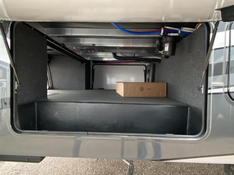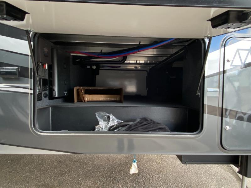 With a 15' garage area, you can bring your favorite off-road toys in this toy hauler! The exclusive ramp door with backup camera makes it easy to load them up and once you have arrived you can set up the dual opposing sofas, the queen bed above them, and the 32" bunk loft, plus there is even one of the dual entry doors to the unit. While the chef is preparing dinner on the Lasus 24" range and oven, three others can sit at the kitchen island with raised countertop and three folding bar stools or at the dinette table to play a game or simply socialize all together. When mother nature is raining on your parade, relax on the reclining theater seating with lumbar and tilting headrest, and enjoy the entertainment center with fireplace and 50" Smart LED TV. The front private bedroom will have you feeling right at home with a king bed slide, a large wardrobe with an area next to it prepped for a washer and dryer, a dresser with hidden storage, and a LED Smart TV. The full bathroom has a 40" x 28" shower with a seat to freshen up in each morning!