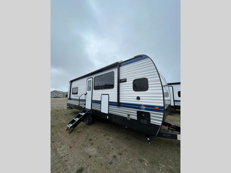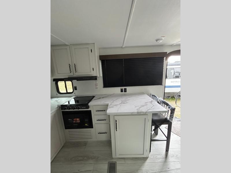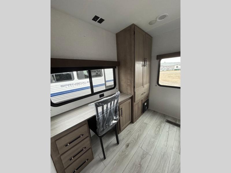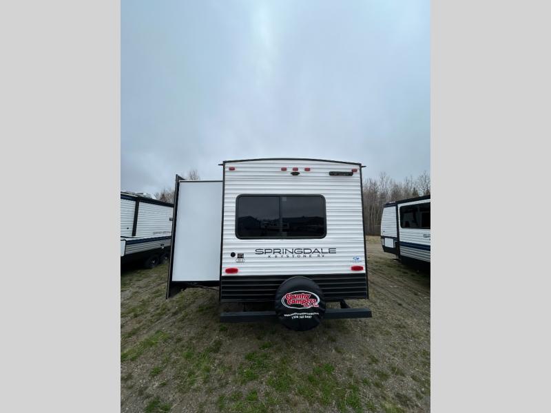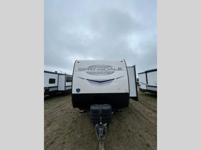 With any Springdale travel trailer by Keystone you will enjoy convenient amenities and comfortable camping features at every turn. The aluminum exterior will be easy to clean, and the power awning provides protection against the hot summer sun. There is also an exterior shower, a walkable roof, and an XL entry assist handle to safely enter and exit the unit. You will find many comforts inside, including a stainless steel sink, ample storage space for your belongings, and cozy sleeping spaces. Start a new adventure today in a Springdale travel trailer!