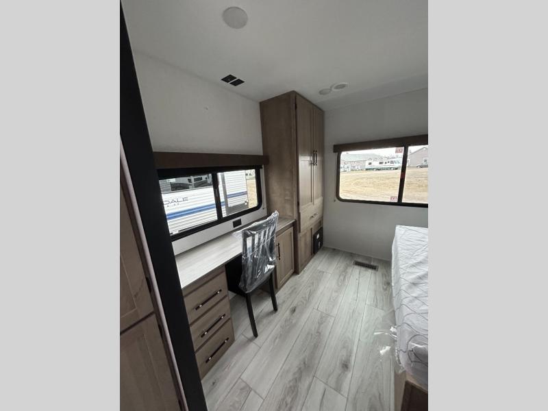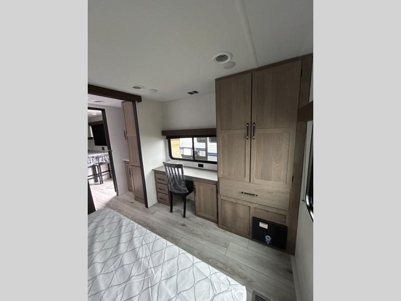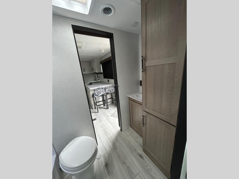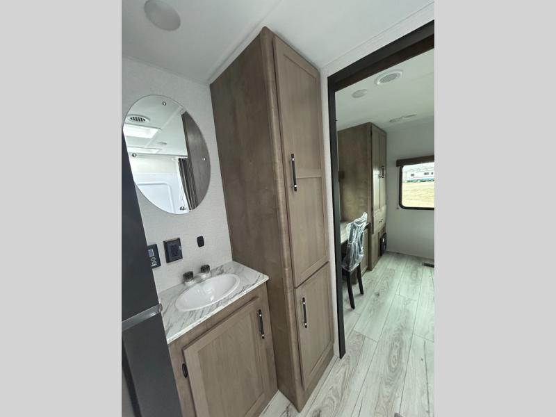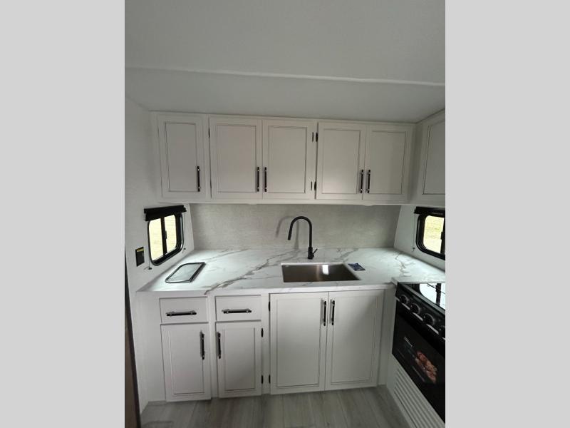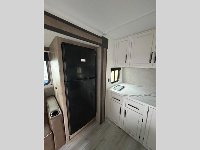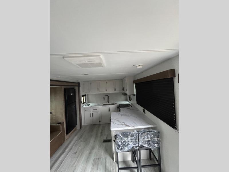 You'll love time spent at the campground in this front kitchen travel trailer. There is ample counter space to prep meals, along with a three burner range, air fryer microwave, and a countertop with chairs. You'll also appreciate the 10 cu. ft. refrigerator, pantry, and a second, lower pantry for tons of storage space. The front kitchen is inviting, but if the weather is nice, you may just find yourselves outdoors at the outside kitchen! A walk thru bath leads to the rear private bedroom where you'll enjoy a queen bed slide out, a wardrobe to keep your clothes tidy, and a desk with a chair if you need to get some work done. And if you have any guests, they can sleep on the tri-fold sofa slide in the main living area; how convenient!