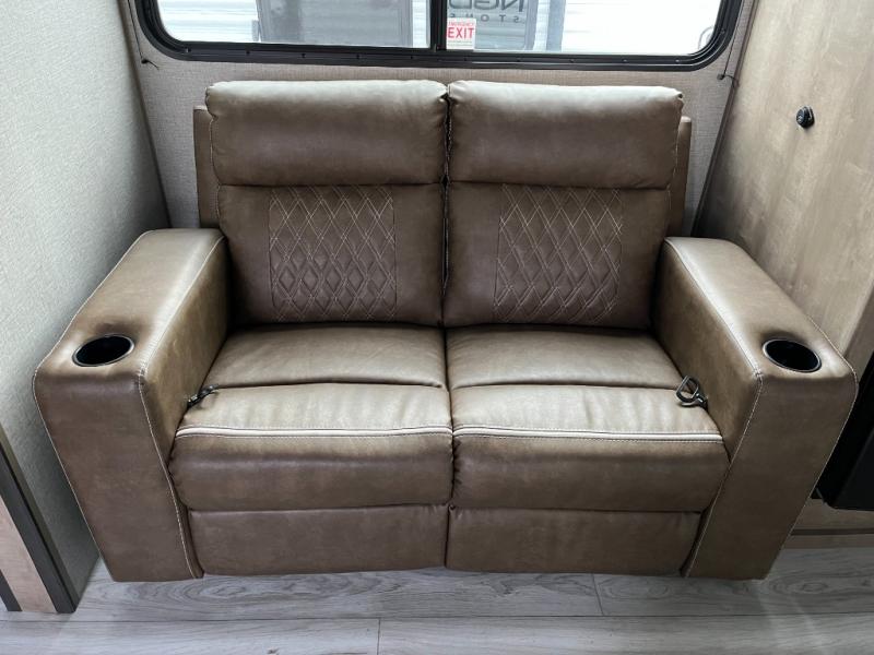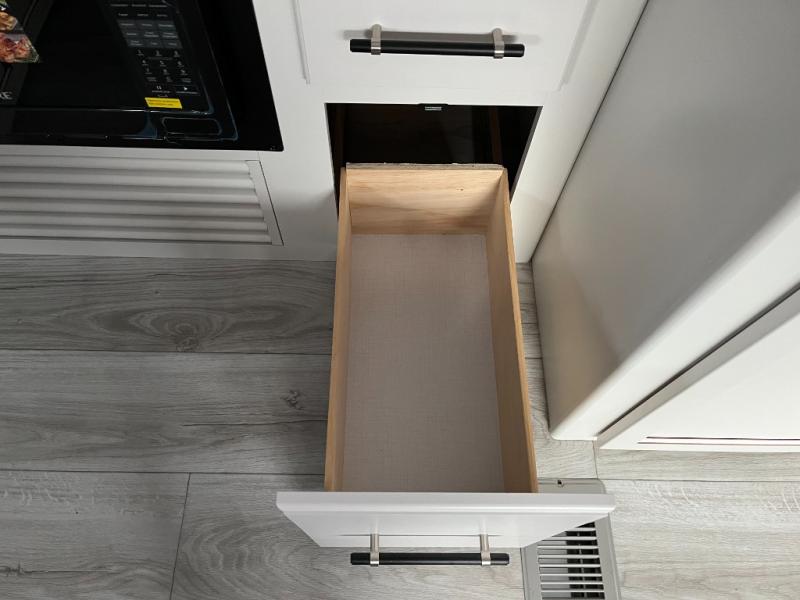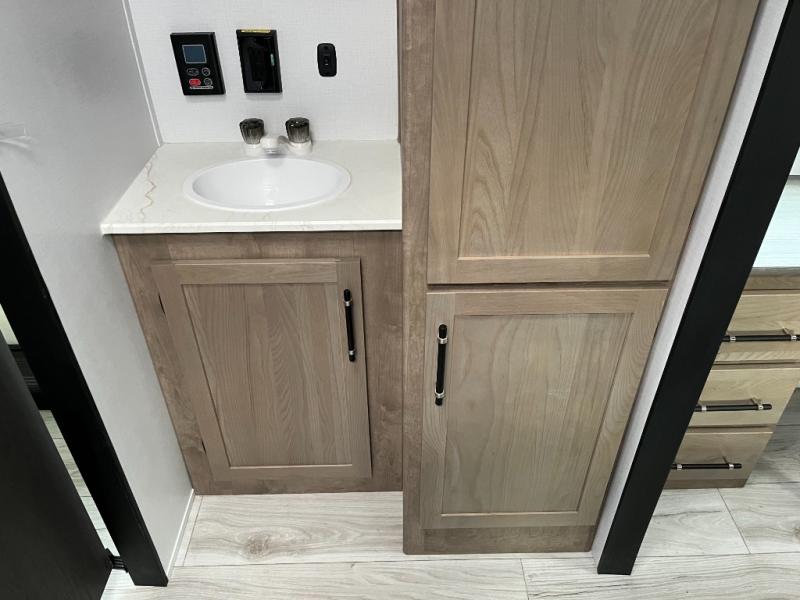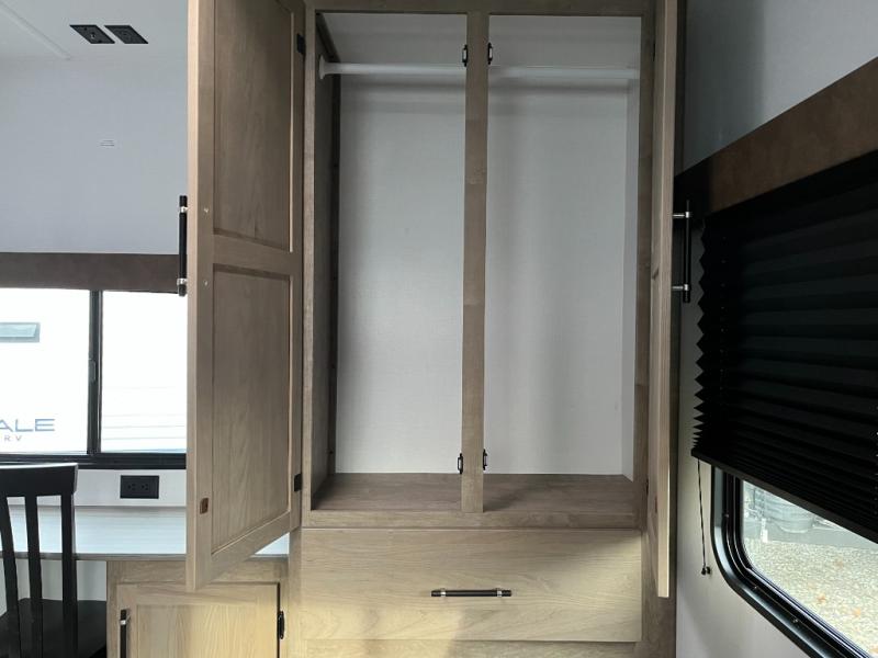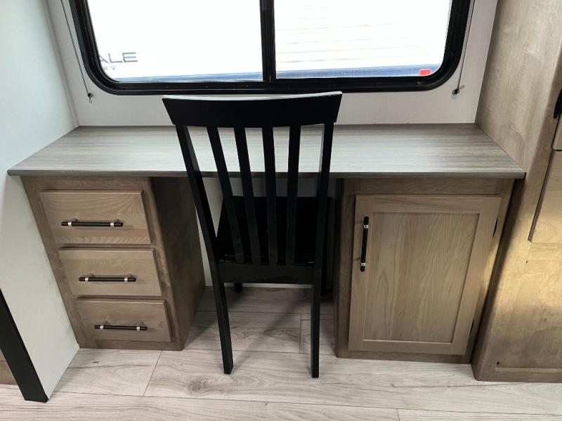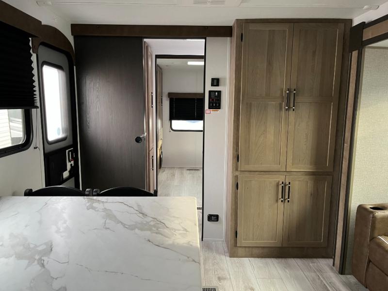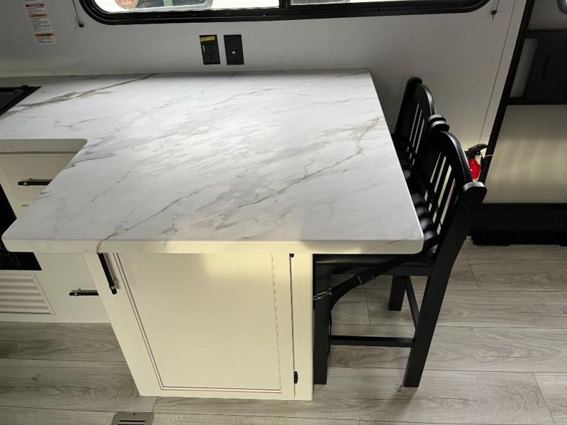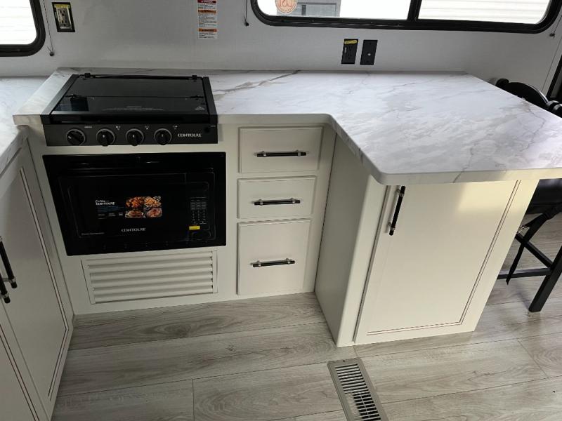 You'll love time spent at the campground in this front kitchen travel trailer. There is ample counter space to prep meals, along with a three burner range, air fryer microwave, and a countertop with chairs. You'll also appreciate the 10 cu. ft. refrigerator, pantry, and a second, lower pantry for tons of storage space. The front kitchen is inviting, but if the weather is nice, you may just find yourselves outdoors at the outside kitchen! A walk thru bath leads to the rear private bedroom where you'll enjoy a queen bed slide out, a wardrobe to keep your clothes tidy, and a desk with a chair if you need to get some work done. And if you have any guests, they can sleep on the tri-fold sofa slide in the main living area; how convenient!