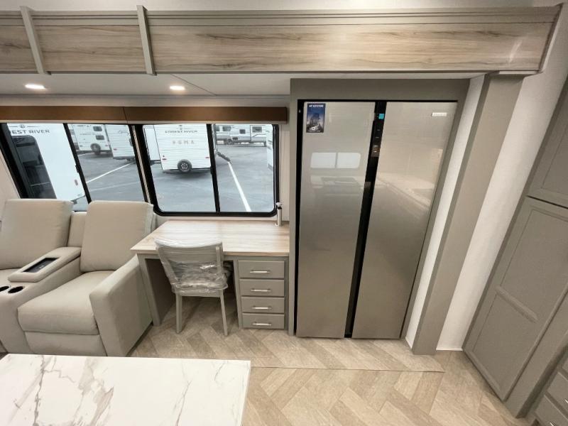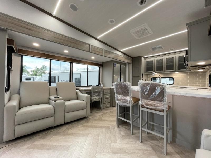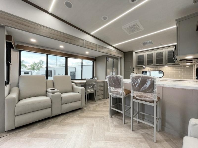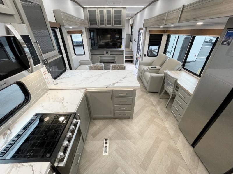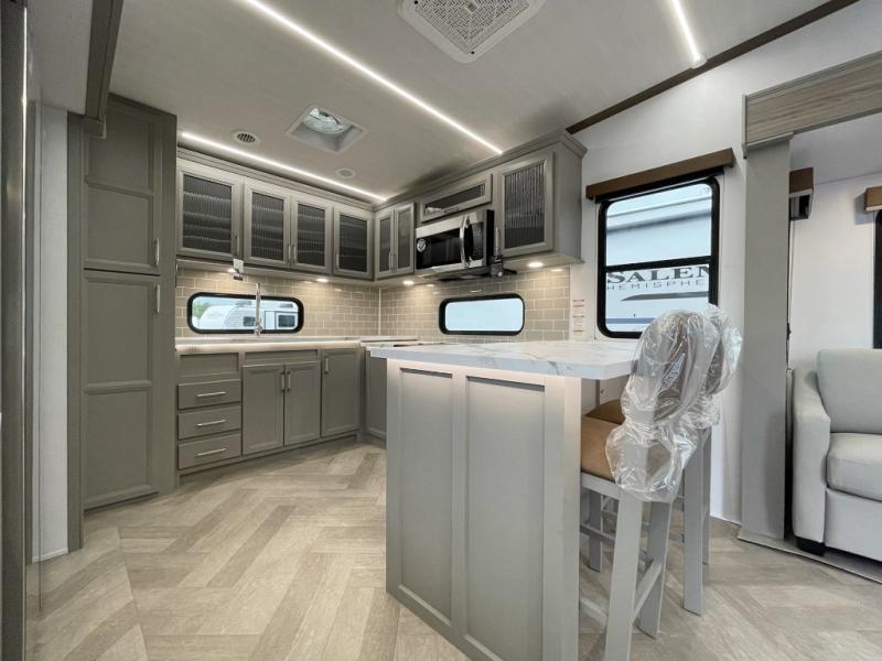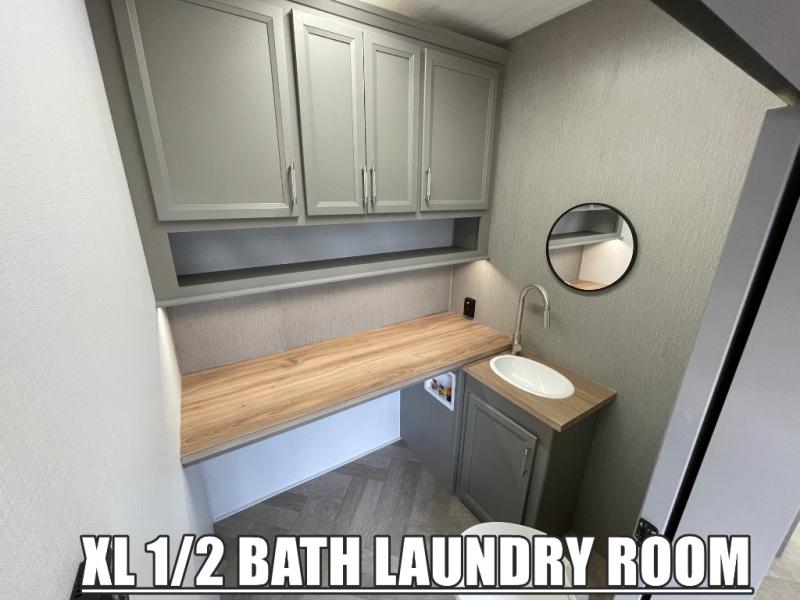 There is much to love about this fifth wheel! Starting with the front full bathroom which has a dual sink vanity for two to get ready at once and heading to the rear kitchen where you will have everything you need to prepare the best home cooked meals. There are also three bar stools at the bar top so guests can socialize with the cook. If you need to get a little work done while you're away, then you can easily get it done at the desk with chair next to the reclining theater seating and the 16 cu. ft. refrigerator for quick access to a snack break. The private bedroom has a king bed slide to lay your head on at night, and if you need an extra sleeping space then you can utilize the sofa slide too. Inside the half bathroom is a countertop with an area prepped for a washer and dryer to be added so you can enjoy clean clothes throughout your entire trip!