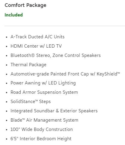 | Awning Info | 10' and 18' Electric with Friction-Hinge Adjustment, LED Lights, and Manual Override |