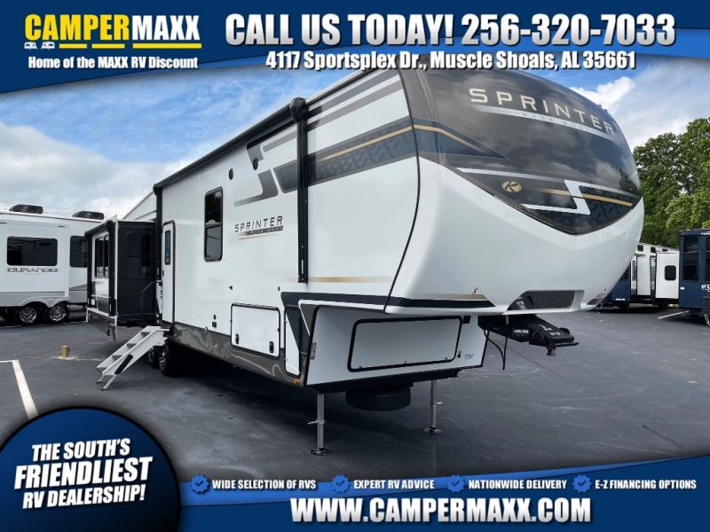 The Sprinter fifth wheels by Keystone feature spacious living areas, plenty of storage, and outstanding towability. Each unit is constructed with 2" aluminum framed and laminated sidewalls, a fully walkable roof, and dual layer insulation to help extend your camping season. The heated pass-through storage includes lockable slam latch baggage doors so you can easily pack your gear, and the one-touch 4-point leveling system features return hookup memory to have you set up in no-time. Head inside to find Congoleum vinyl flooring, Thomas Payne luxury collection furniture, residential style seamless marbled countertops, and an upgraded bedspread to name a few comforts. The Sprinter also includes a Girard tankless on-demand water heater, a central command center, plus a 30k BTU furnace and two A/C units to ensure your comfort!