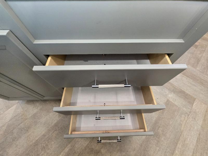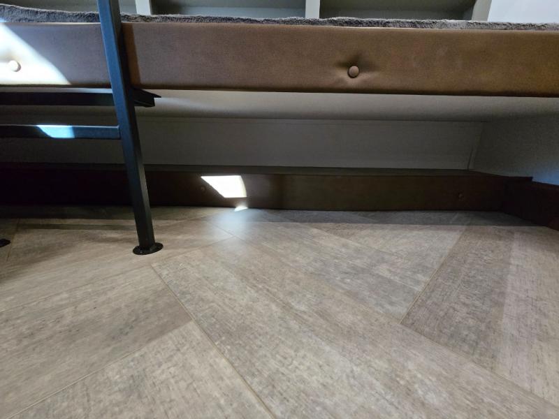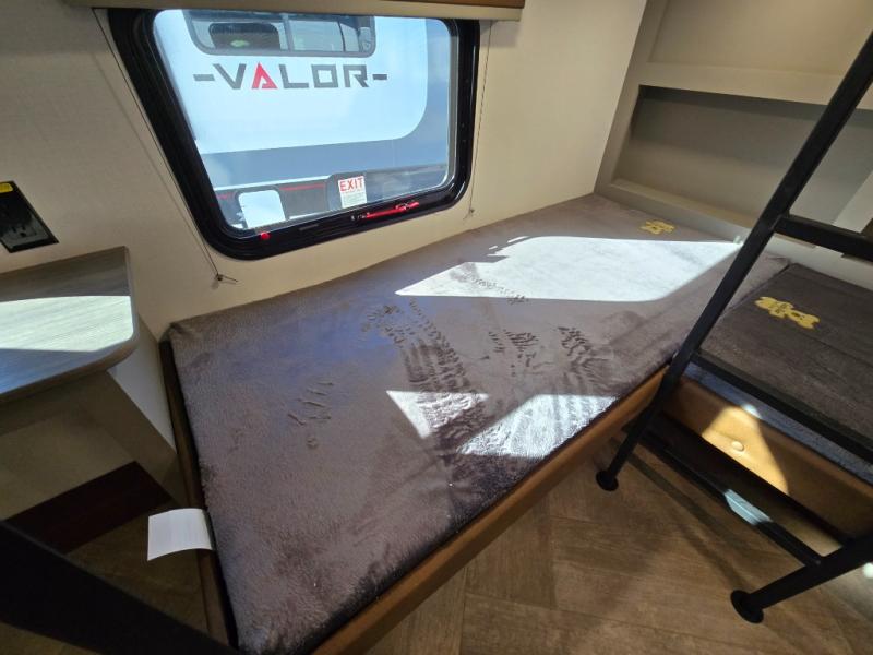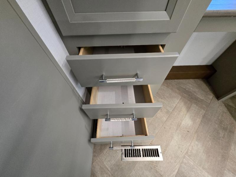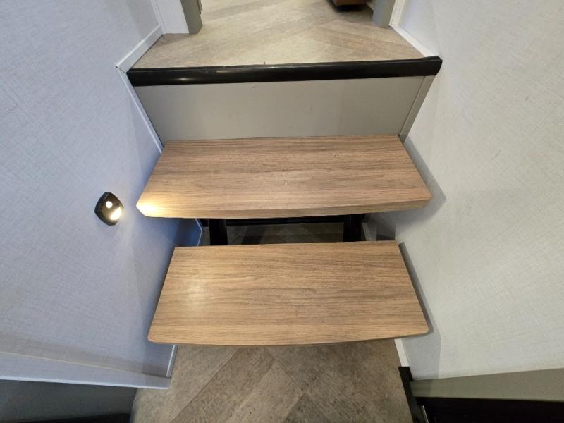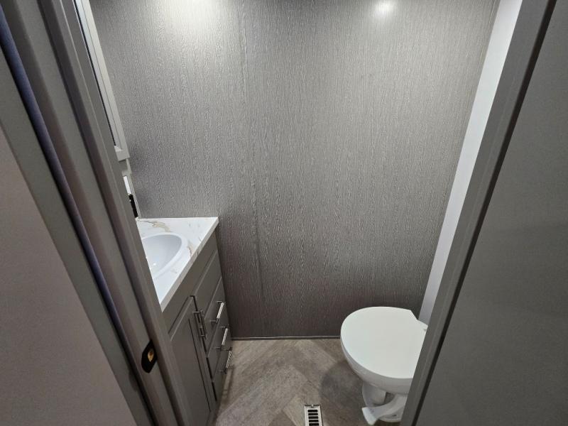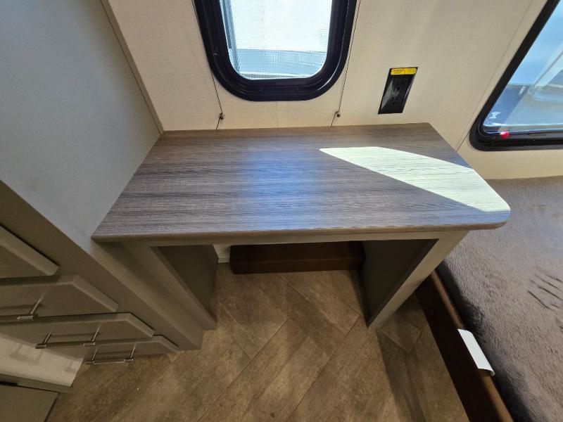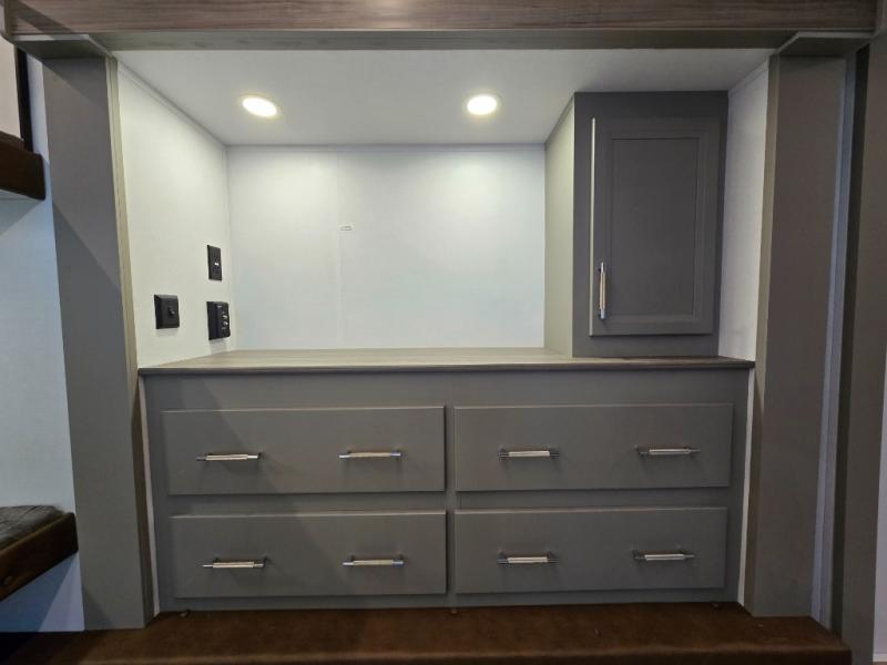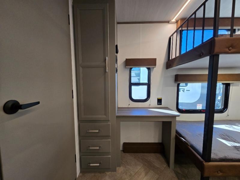- Front Bunkhouse Suite: Perfect for kids or extra guests, this suite has two bunk beds, a desk, a slide-out with a TV hookup, and a convenient half bath, ensuring everyone has their own space.