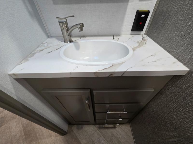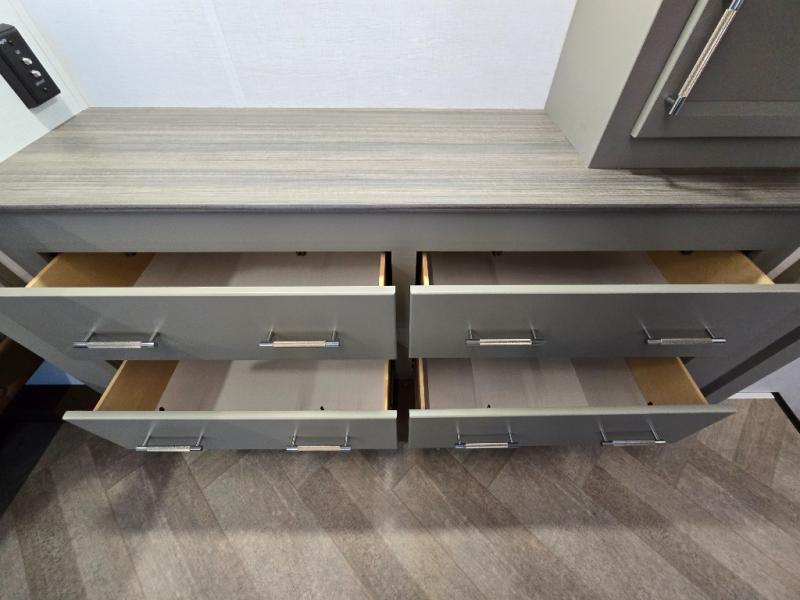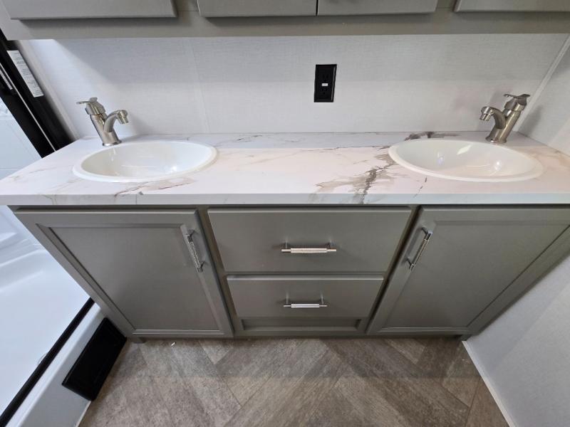 - Master Bedroom: The private master suite features a king-sized bed with a slide-out for added space, plenty of storage, and easy access to the full rear bath with dual bath sinks, making it easy for two people to get ready at once.