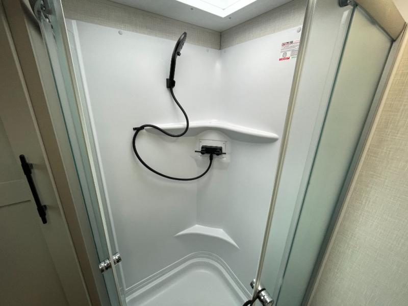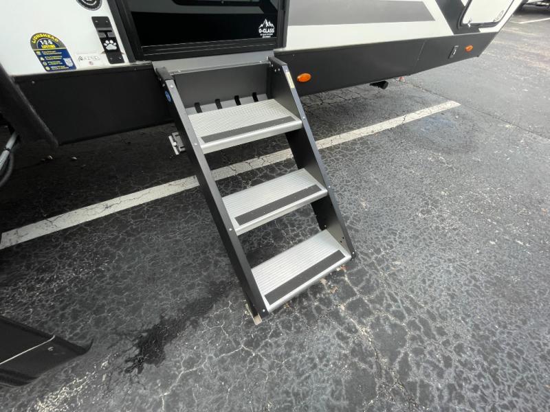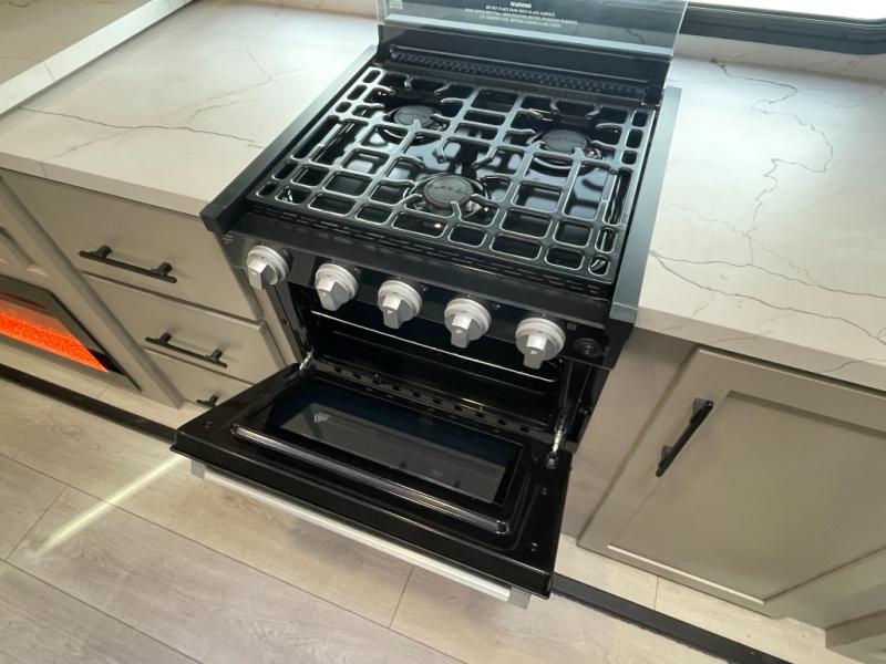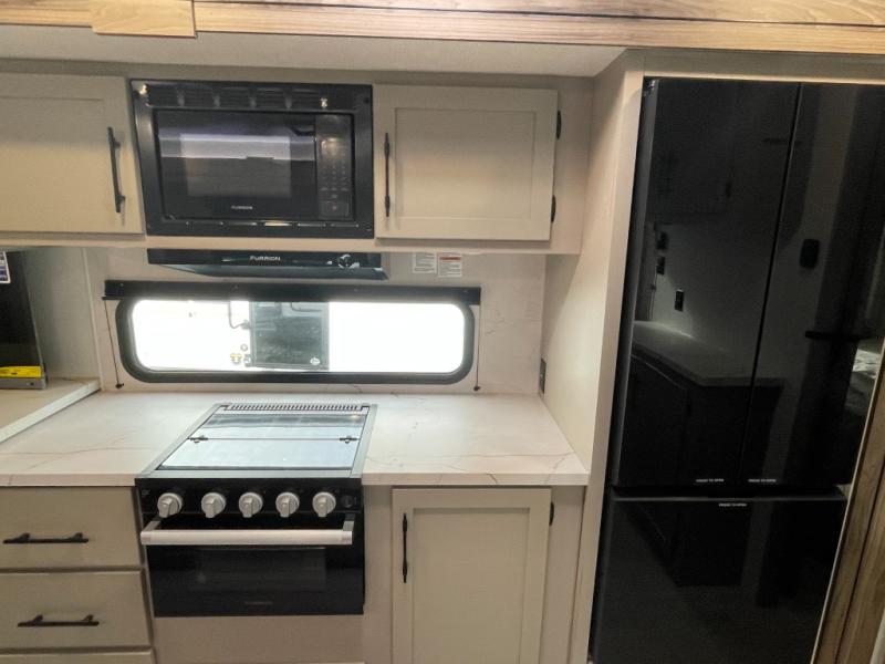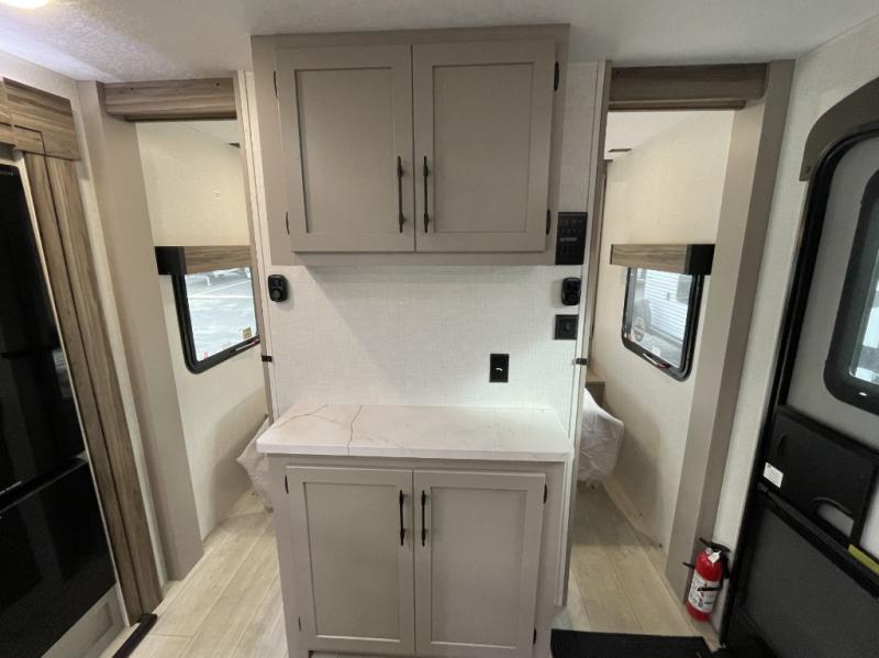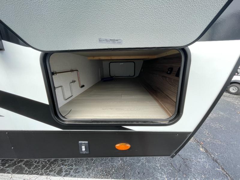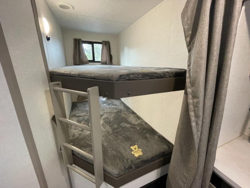 You'll love how spacious this travel trailer is thanks to the dual opposing slides in the combined kitchen and living area. You'll also find theater seating here across from the fireplace and LED TV to make it a movie night. The kids or your guests can sleep on the rear corner double-size bunks, and there is a trunk door under the bunks for easy storage. You'll find a king bed in the front private bedroom for a great night's rest, and the dual wardrobes will let you keep your room tidy. This unit also includes a kitchen island and a hutch for more counter and storage space; how convenient!
