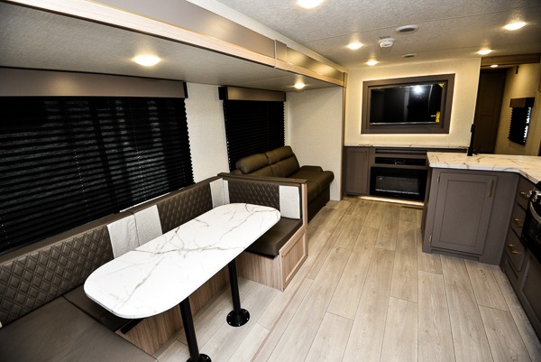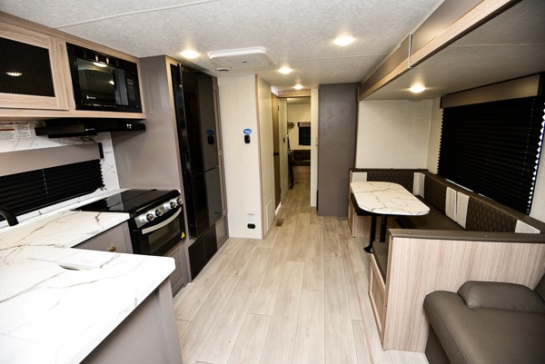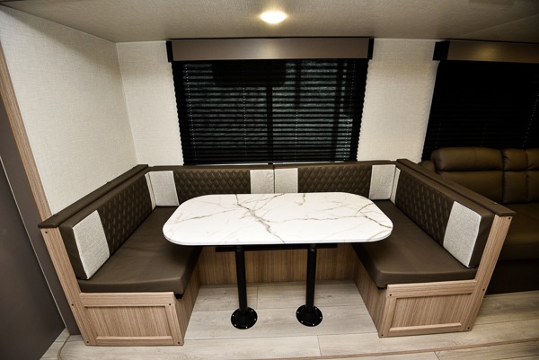 If you've been looking for a travel trailer with plenty of space for your family or group of friends, look no further than this one! The private bunkhouse includes two bunks, plus a third bunk across the room and a jiffy sofa below. There is also a bench seat here, and the full bath is close by for convenience. Everyone can gather in the main living area at the 80" U-shaped dinette, and there is a 64" sofa here for more seating space. If the weather is nice, head outdoors to relax under the 20' power awning with LED lights as the cook prepares dinner on the outside griddle!
