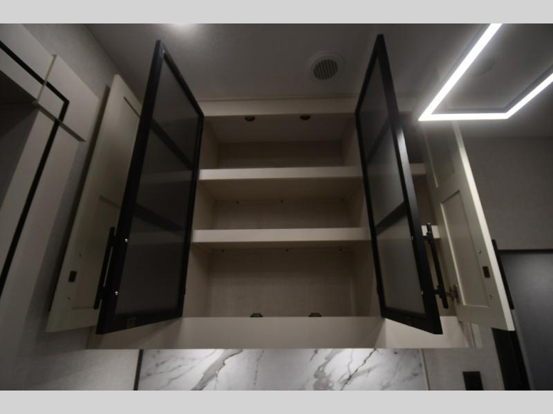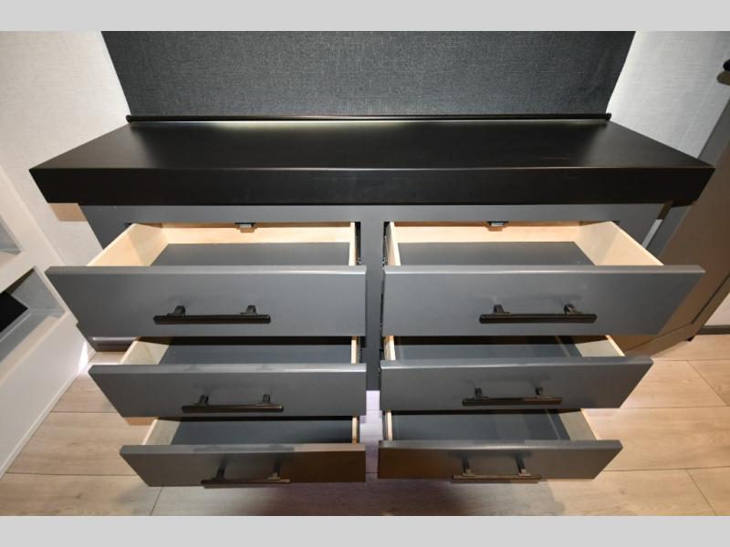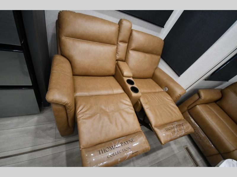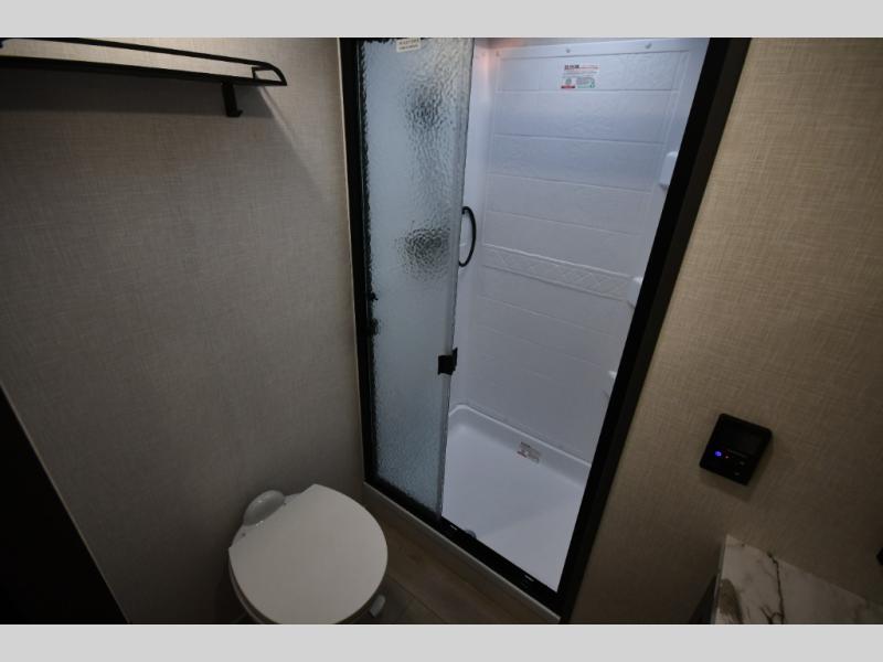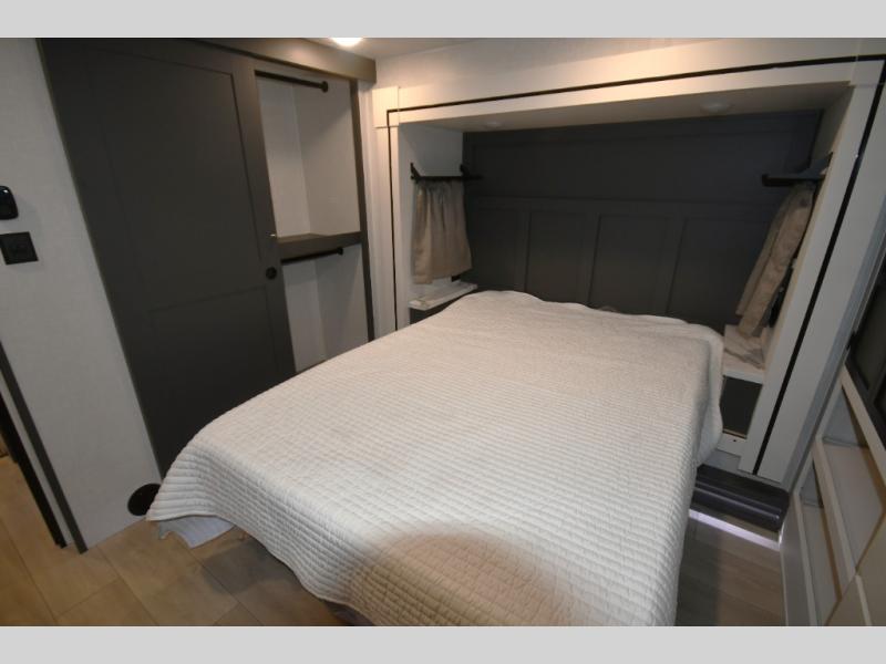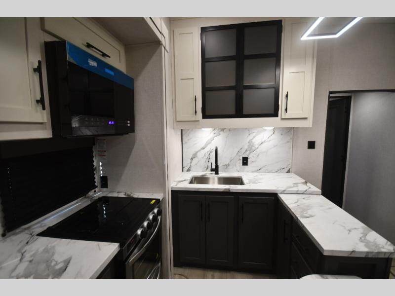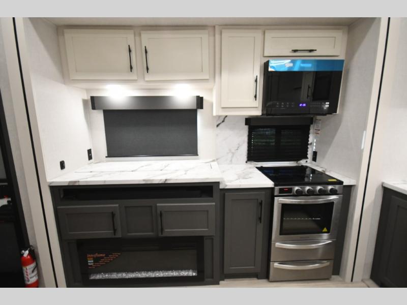 This fifth-wheel toy hauler is the perfect vehicle for unwinding on the road. The front bedroom boasts a plush queen bed, dresser with hidden storage, and washer and dryer prep for added convenience. The full bathroom is complete with a generous 30” x 36” shower. The kitchen is a culinary dream, equipped with a 16 cu refrigerator, microwave, 3-burner cooktop, and pantry for all your favorite snacks. The living room is the perfect place to relax and entertain featuring theater seating, a spacious 64” sofa, a cozy fireplace, and an LED TV for movie nights. The 13’ 6” garage is the ultimate playground, featuring a 60” x 84” power bed with seat & sleep, and a laminated bed base, perfect for converting the space into a spacious bedroom or play area. Plus, a 32” x 96” loft bed for added sleeping capacity. Step outside and enjoy the fresh air with our patio rail kit, perfect for outdoor entertaining, and enjoy nature in the shade with our massive 14’ & 20’ awnings, and get ready to take your adventures to new heights!