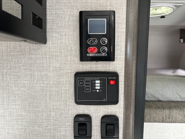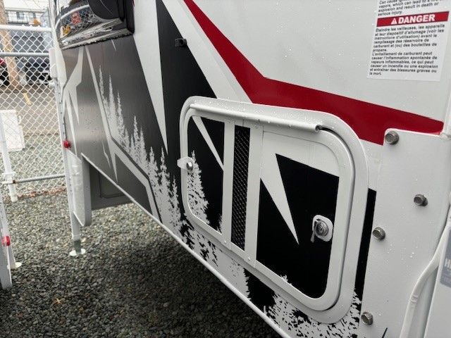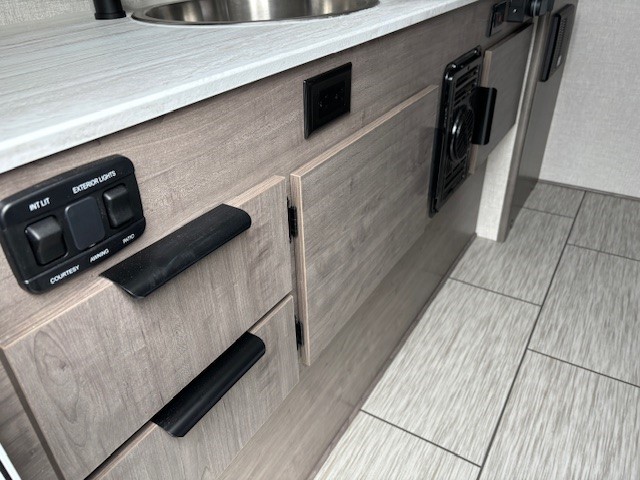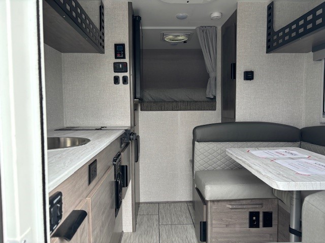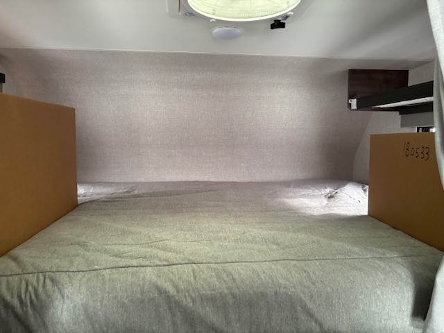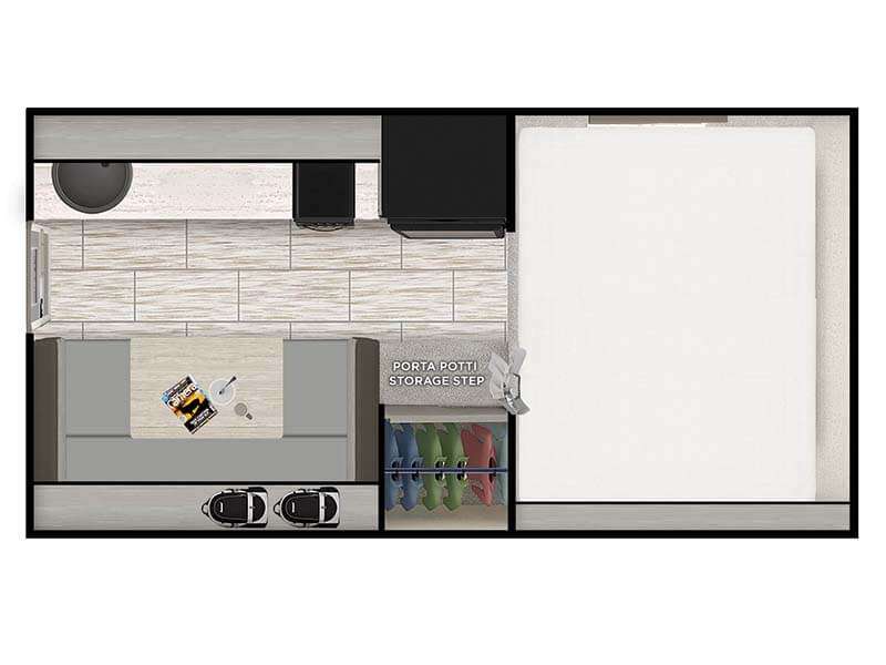 Highlights include a 12v refrigerator, real 60"x80" queen size east/ west bed, porta potti and 23Zero exterior shower enclosure.