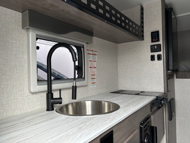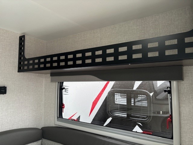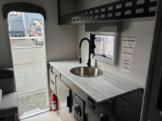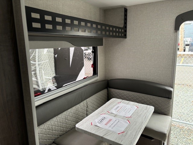 The goal we achieved with this model was to make a more minimalist space that still has all the necessities while staying super lightweight and with dimensions that allow owners of many different trucks and interests the ability to safely load up and hit the road. It boasts the longest countertop of any of our campers at 6' with a built-in sink and a two-burner cooktop, two drawers and two under sink cabinets. Galley and storage space in any camper is at a premium and instead of building walls and fully faced cabinets and cramming in accents we focused on open space and large windows. Across from the massive countertop you find a large u-shaped dinette to match, above that you find on either side equal length MOLLE (Modular Lightweight Load-carrying Equipment) panels which serve as structure for the cabinet and also offers a huge grid to clip and fasten gear to which allows the owner big possibilities.