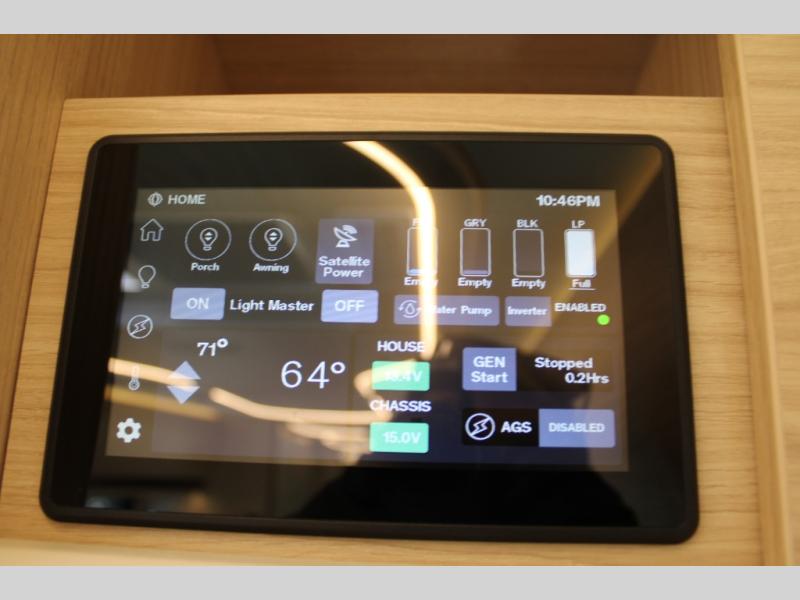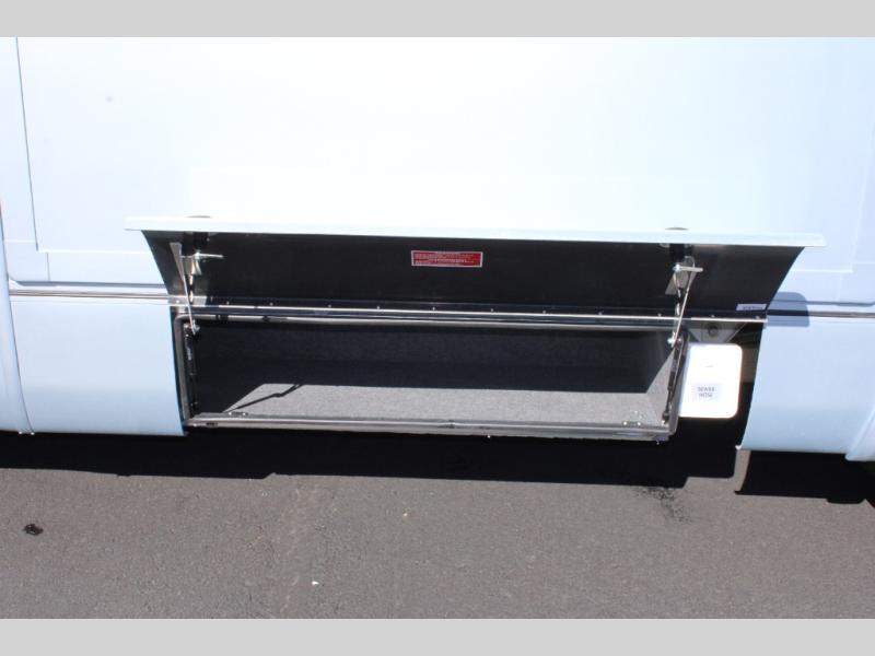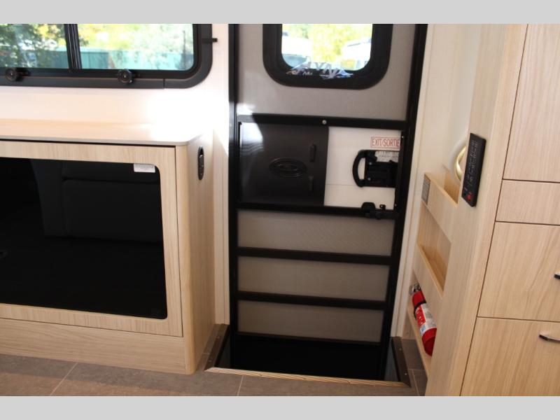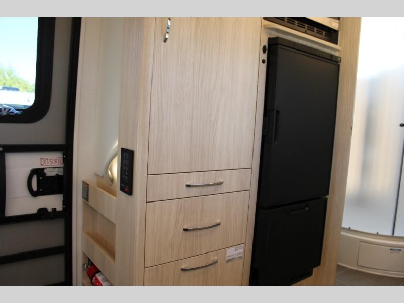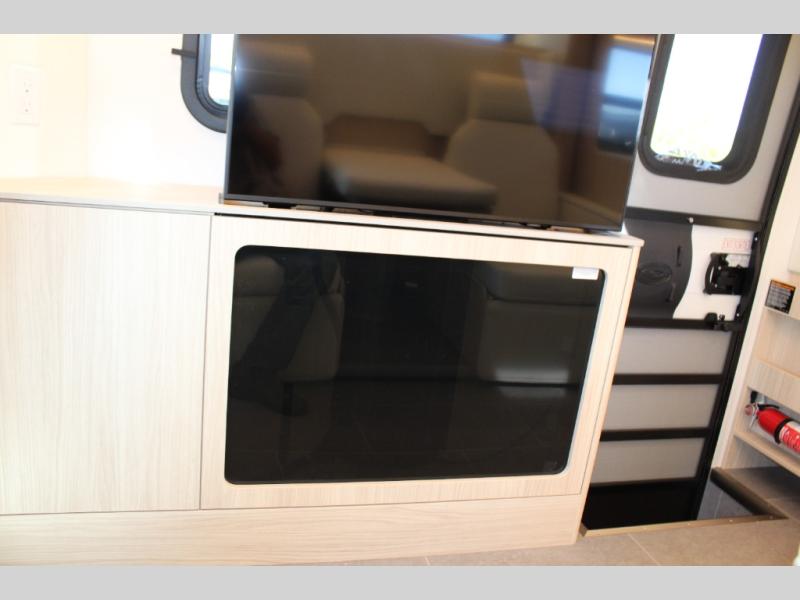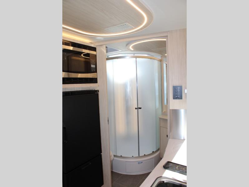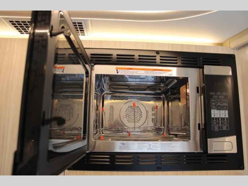 Traveling will be convenient and comfortable with this versatile Murphy bed and redesigned leisure lounge, which includes dual reclining chairs, an updated dinette table and a large panoramic window! At night, the lounge seating is hidden as you flip-down the Murphy bed for a comfortable night's rest. In the morning, tuck it all away to bring back your living space. You will also enjoy the convenient kitchen amenities in place so you can easily whip up a meal or snack while you are stopped, and for overnight you can get refreshed for a new day in the rear bath featuring a radius shower with a skylight, a sink, and closet space for your things.