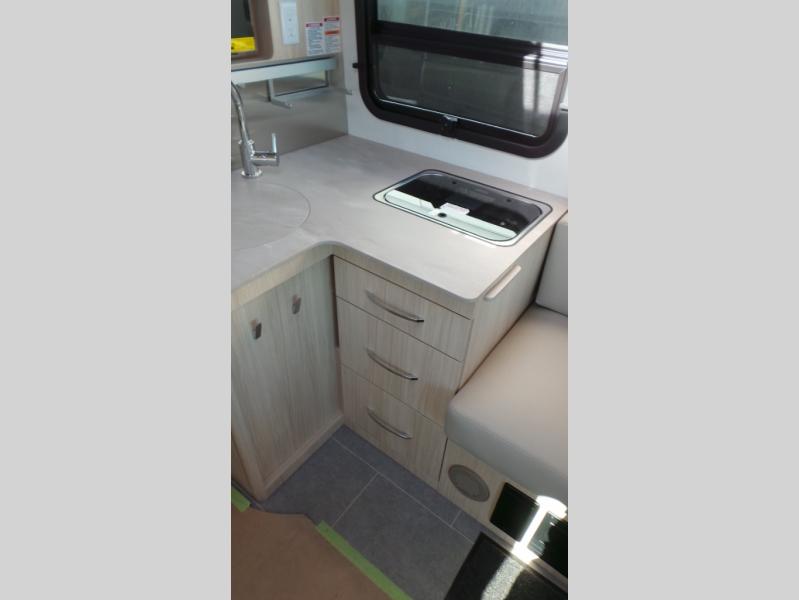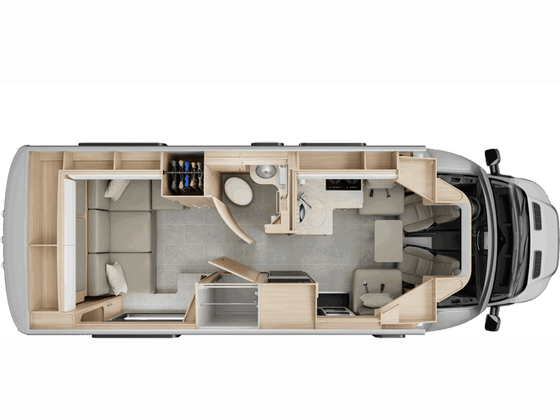 Built on the impressive Ford Transit Chassis, the Wonder Rear Lounge features an innovative layout with two unique multi-purpose living spaces, creating a coach that easily adapts to your lifestyle and needs. Adjacent to the generous galley, find a removable front dinette that comfortably seats four and easily converts to a second bed (optional) for overnight guests. At the rear, a residential-style sectional sofa with two built-in lounge chairs and near floor-to-ceiling windows transforms into a luxurious master bedroom, thanks to a modern Murphy bed system.