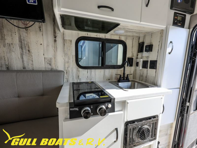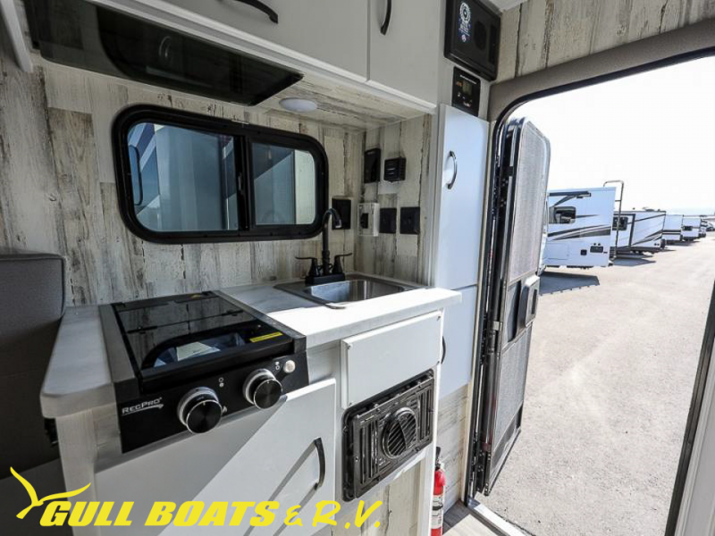 The Modern Buggy truck camper is constructed with Azdel walls, roof and ceiling, double rolled R7 insulated walls, and a composite subfloor for added strength and durability. You will love the look of the Stained Birch or White Sands cabinetry inside, and the USB stations will keep your electronics powered up. There are manual jacks outside, along with an outside spray port shower box and a heavy duty grab handle to safety enter the unit. Optional upgrades such as, a lithium battery, electric jacks and a power awning can be added to further customize your truck camper!