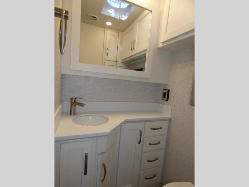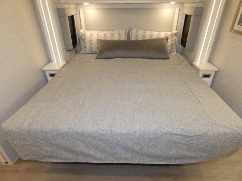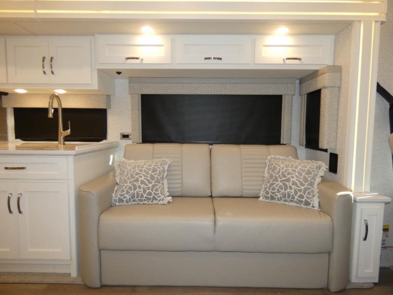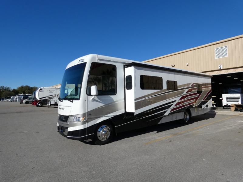 Each Bay Star Class A gas motorhome by Newmar delivers a smooth ride thanks to the standard electronic stability control, along with the 7.3-liter V8 engine with 350 HP and 468 lb./ft. of torque. The exterior is sure to turn heads with its full-paint Masterpiece Finish, and you'll have three interior decor choices and three wood choices to truly make the coach your own. Each model includes newly styled Williamsburg furniture, luxurious vinyl plank flooring, polished solid surface countertops in the kitchen, plus many more comforts. Head outside to find lit basement storage, a 5.5kW Onan generator with remote switch, and smart level hydraulic leveling jacks with a Bluetooth compatible touch pad for set up easy as 1-2-3!