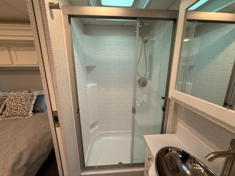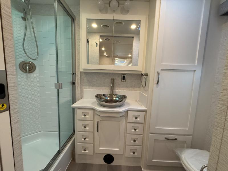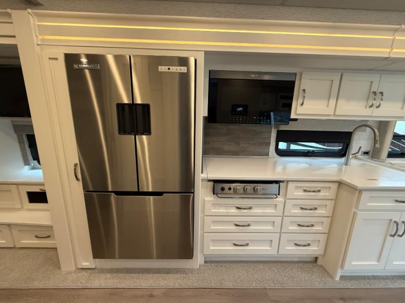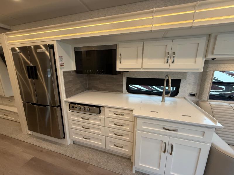 This coach is the perfect companion to take across states since it will feel just like home. There is a full-wall slide that will open up your living space, plus two additional slides so you won't feel confined. You will love the master bedroom and the full rear bath that includes a linen closet for clean towels, and there is a mid-coach half bath with an area for an optional Splendide stacked washer and dryer. The chef of your group will have a 30" convection microwave and a three burner cooktop to prepare meals each day, and there is a booth dinette (sleeper) where you can all dine together. You might want to relax on the sofa comfort lounge after dinner and watch a movie on the TV on power lift!