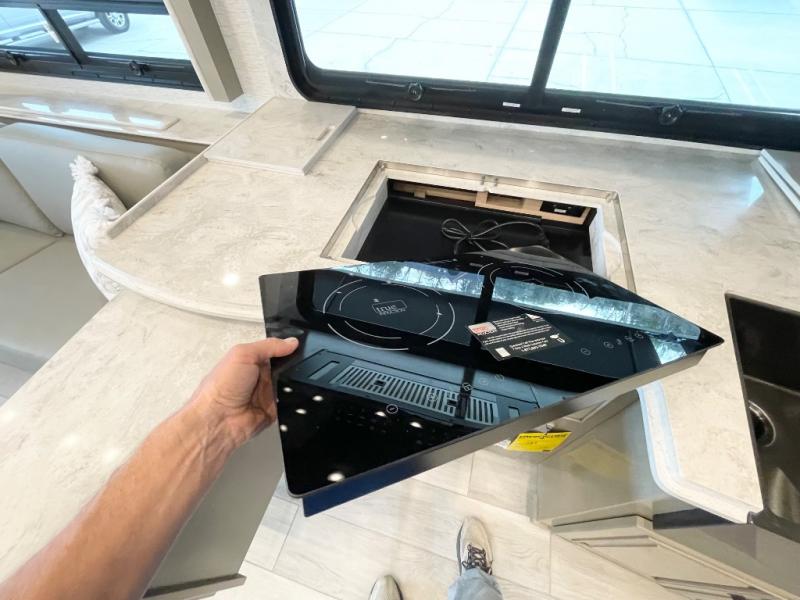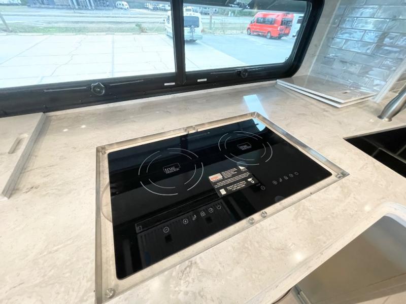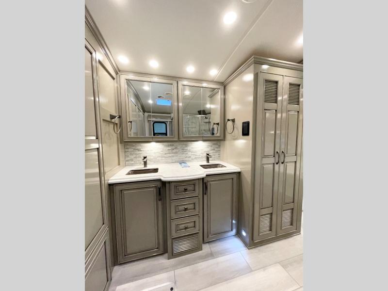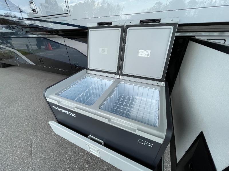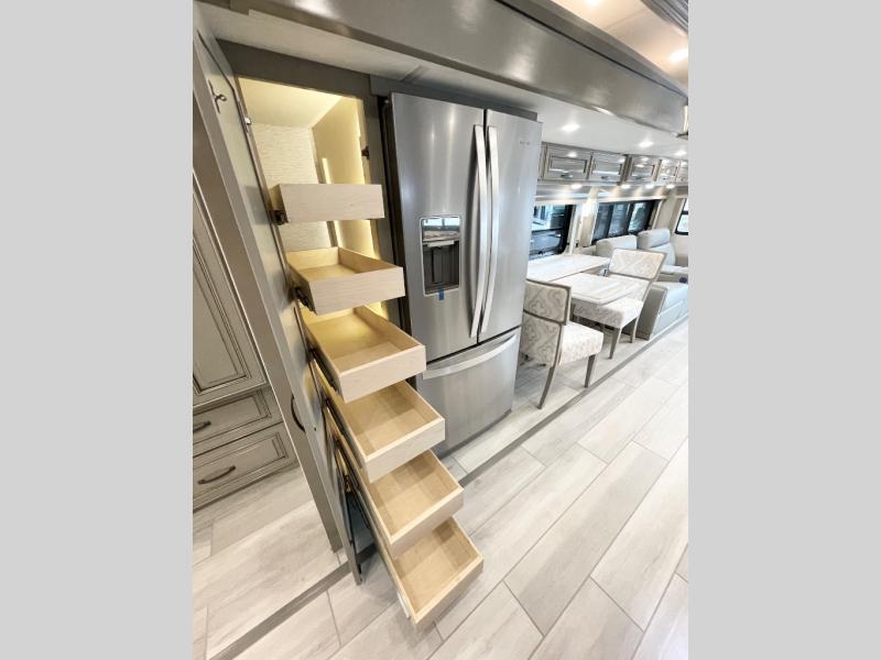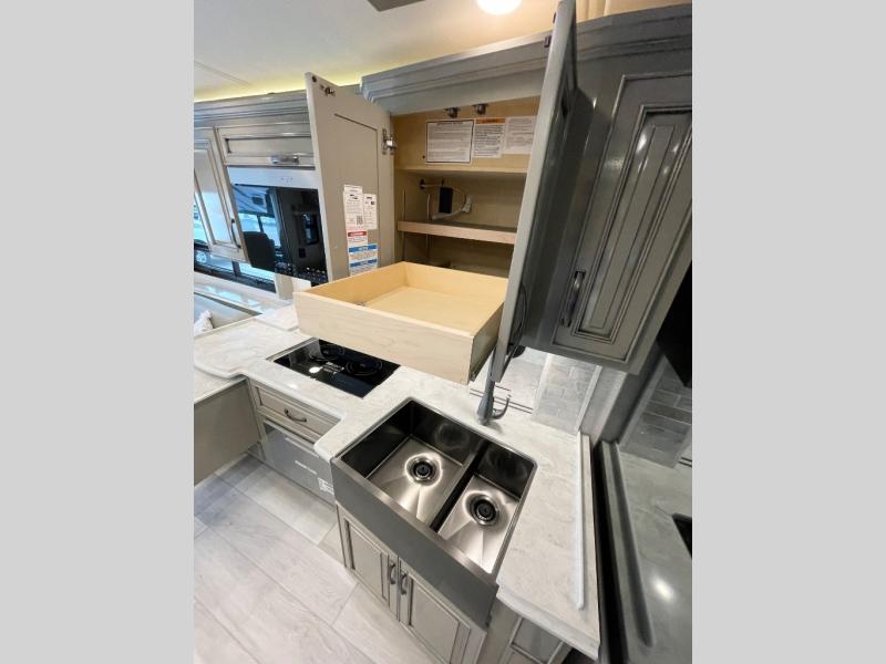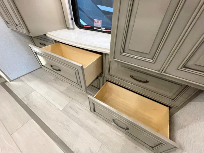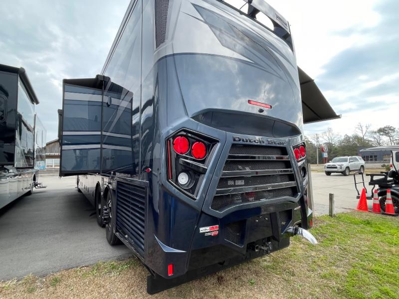 Luxury is waiting for you in this spacious Dutch Star Class A diesel motorhome that can comfortably sleep six each night. The full-wall slide plus two additional slides will open up the whole unit for a more at-home feel. Relax on the hide-a-bed sofa or read a book on the jackknife sofa. The hide-a-leaf dinette will be the perfect place to catch up on some work while you're away from home. Easily prepare breakfast, lunch, and dinner on the all-electric induction cooktop, or use the convenient stainless steel convection microwave with an air fryer feature. This model features a master suite with a pillowtop king bed, dual wardrobes and a dresser, plus an LED TV. You will love the rear bath cathedral ceiling that will add additional height, plus there is plenty of storage space and two bath sinks so that you and your spouse can freshen up at once! Specifications shown are with the standard Freightliner tag axle chassis. See dealer for details if optional Spartan K2 tag axle chassis is selected.