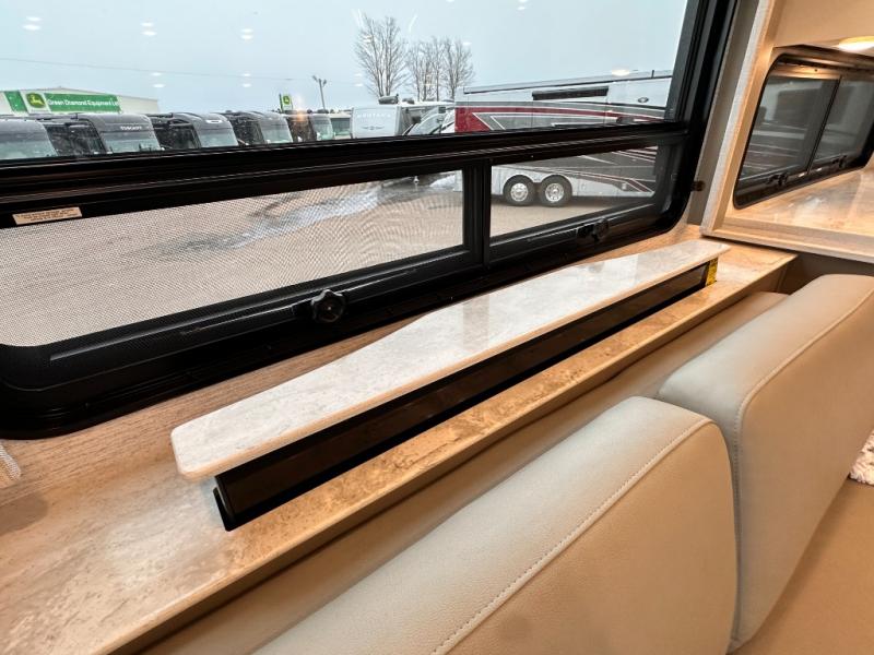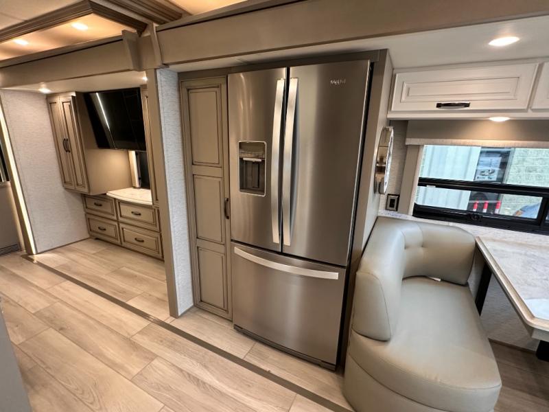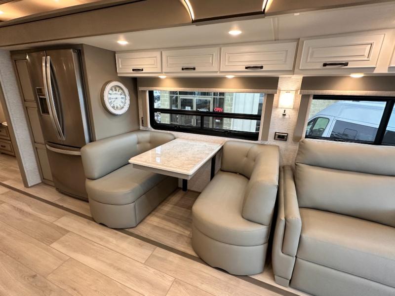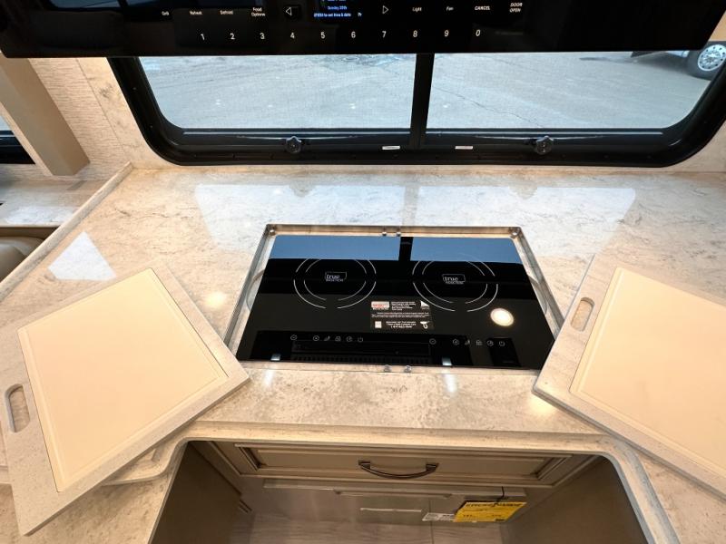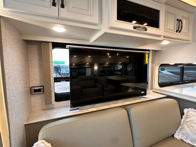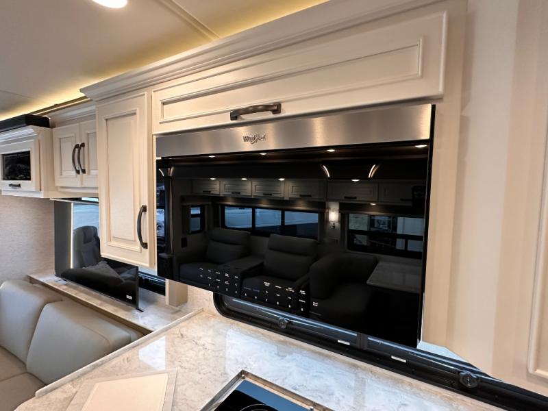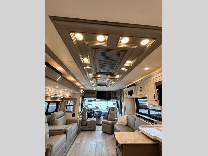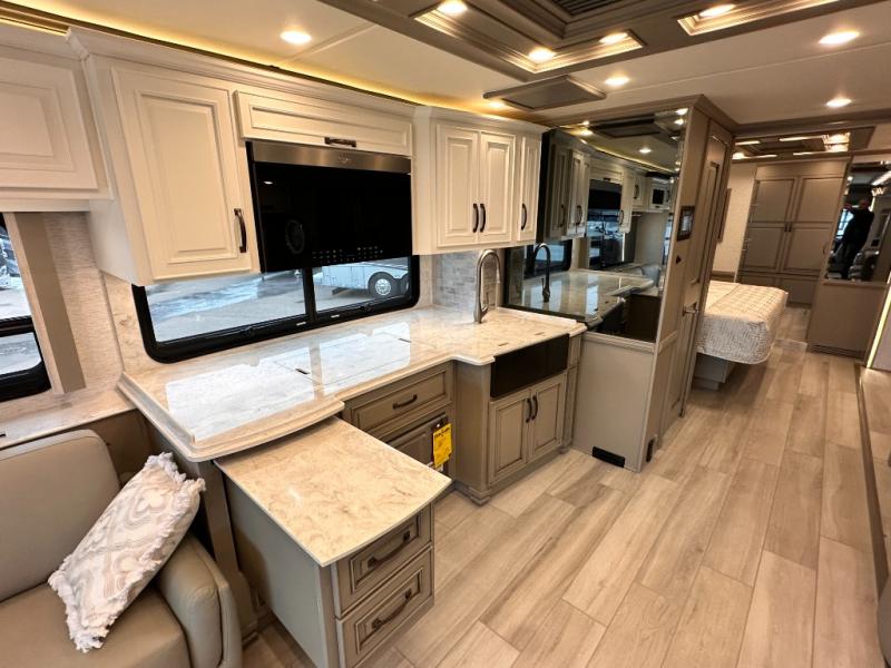 Luxury is waiting for you in this spacious Dutch Star Class A diesel motorhome that can comfortably sleep six each night. The full-wall slide plus two additional slides will open up the whole unit for a more at-home feel. Relax on the hide-a-bed sofa or read a book on the jackknife sofa. The hide-a-leaf dinette will be the perfect place to catch up on some work while you're away from home. Easily prepare breakfast, lunch, and dinner on the all-electric induction cooktop, or use the convenient stainless steel convection microwave with an air fryer feature. This model features a master suite with a pillowtop king bed, dual wardrobes and a dresser, plus an LED TV. You will love the rear bath cathedral ceiling that will add additional height, plus there is plenty of storage space and two bath sinks so that you and your spouse can freshen up at once! Specifications shown are with the standard Freightliner tag axle chassis. See dealer for details if optional Spartan K2 tag axle chassis is selected.