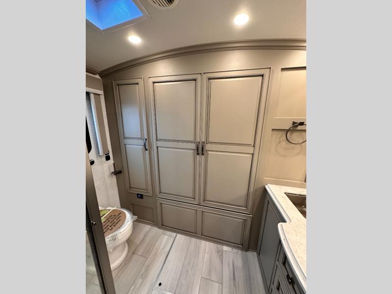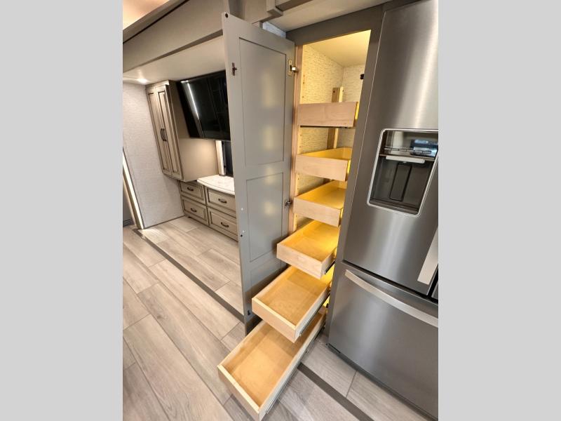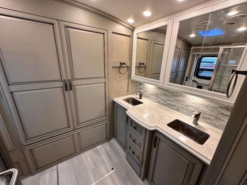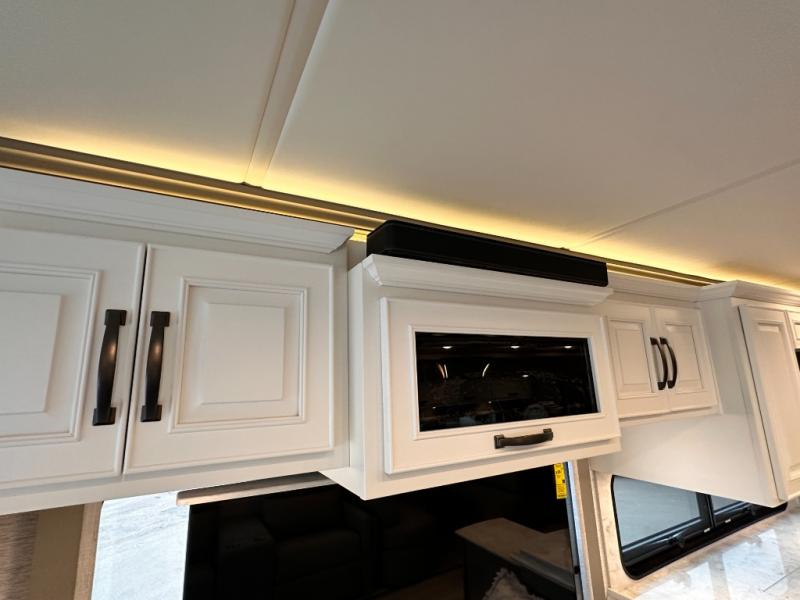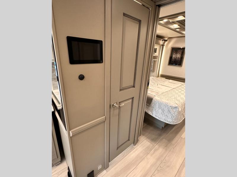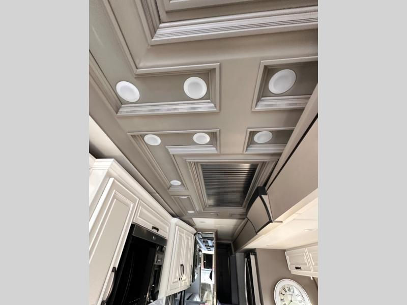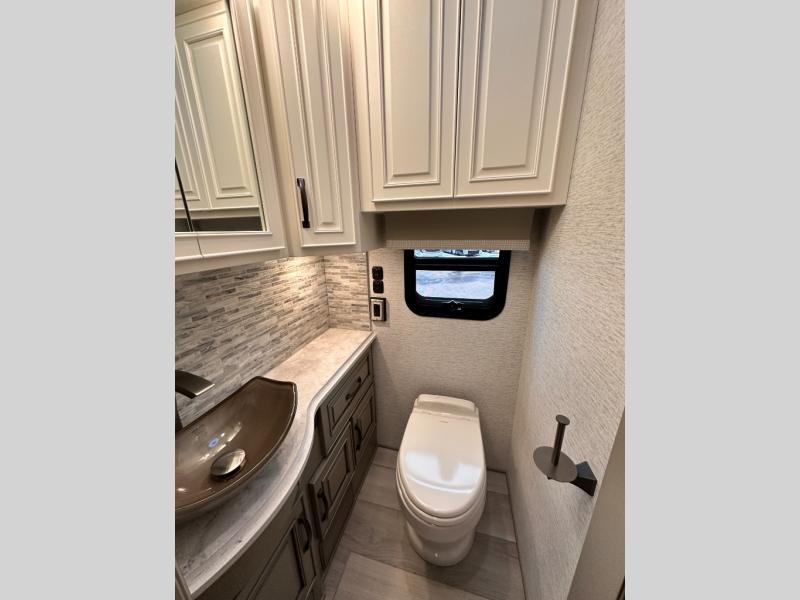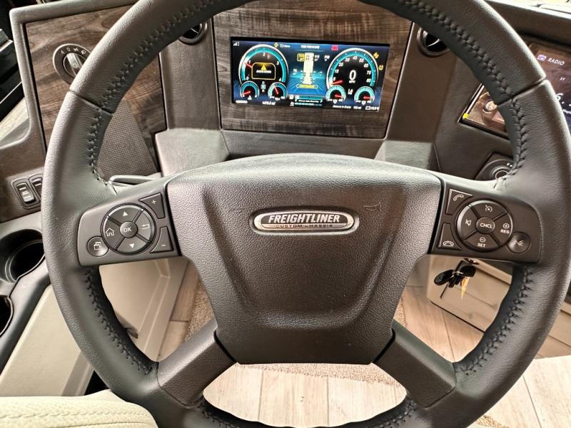 Luxury is waiting for you in this spacious Dutch Star Class A diesel motorhome that can comfortably sleep six each night. The full-wall slide plus two additional slides will open up the whole unit for a more at-home feel. Relax on the hide-a-bed sofa or read a book on the jackknife sofa. The hide-a-leaf dinette will be the perfect place to catch up on some work while you're away from home. Easily prepare breakfast, lunch, and dinner on the all-electric induction cooktop, or use the convenient stainless steel convection microwave with an air fryer feature. This model features a master suite with a pillowtop king bed, dual wardrobes and a dresser, plus an LED TV. You will love the rear bath cathedral ceiling that will add additional height, plus there is plenty of storage space and two bath sinks so that you and your spouse can freshen up at once! Specifications shown are with the standard Freightliner tag axle chassis. See dealer for details if optional Spartan K2 tag axle chassis is selected.