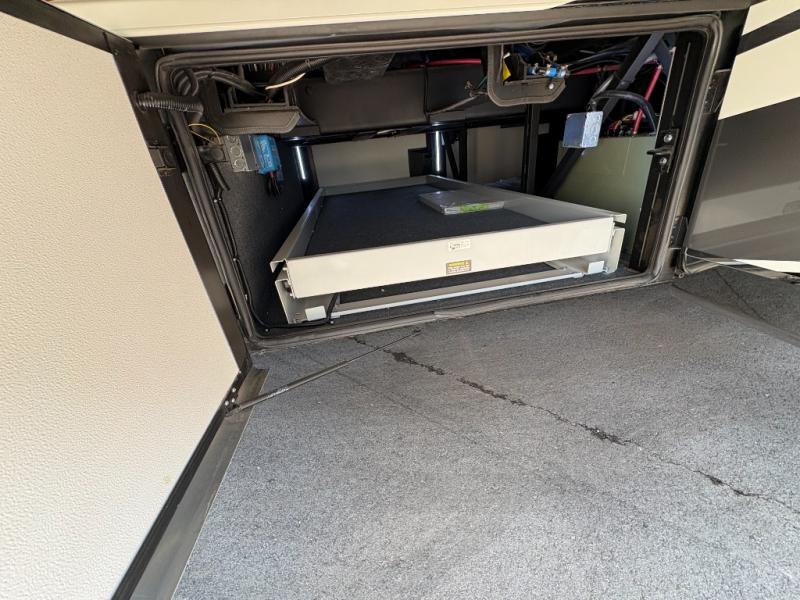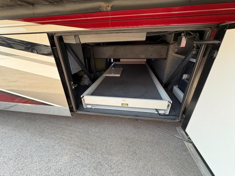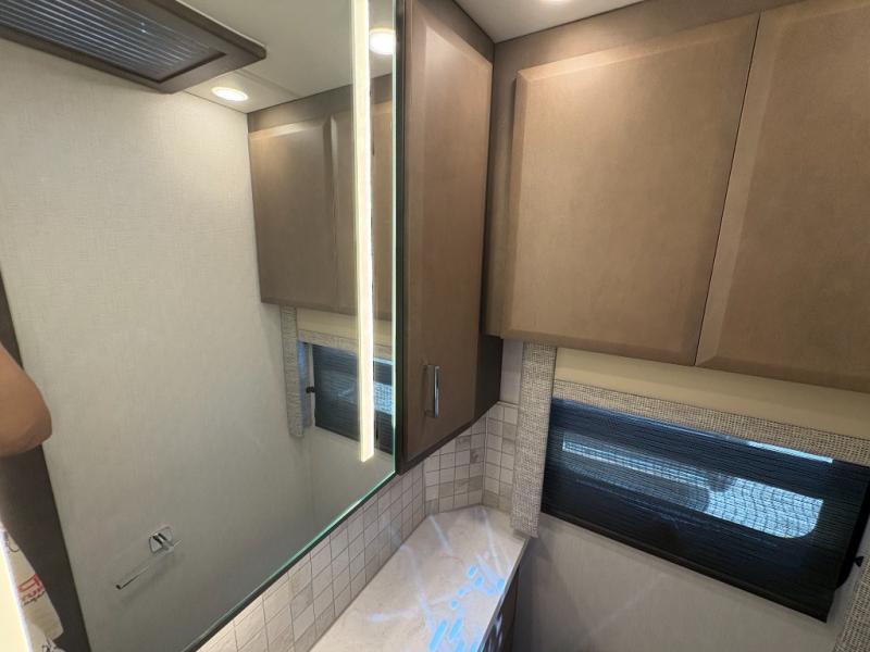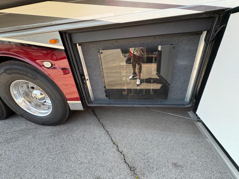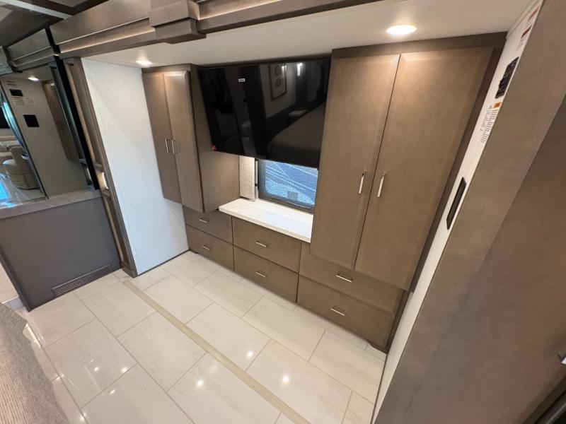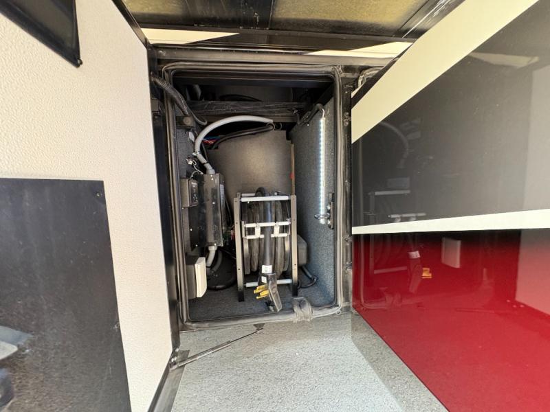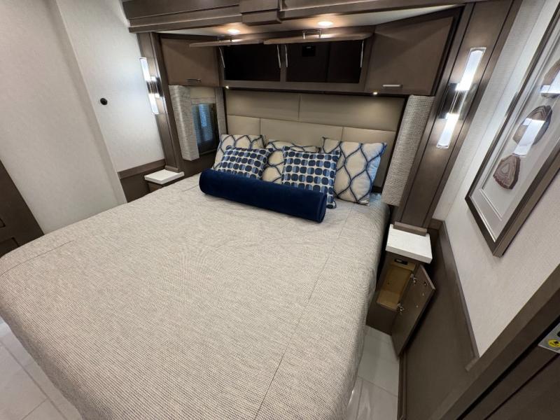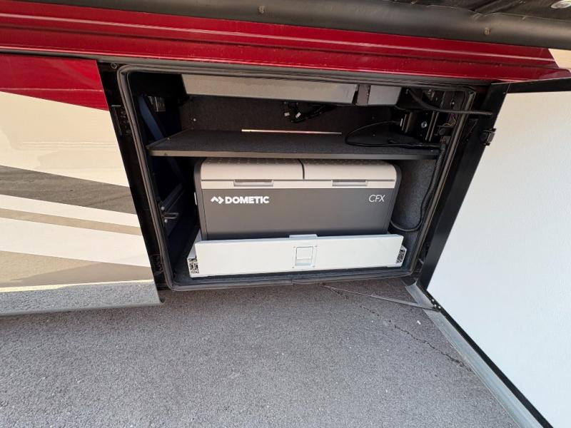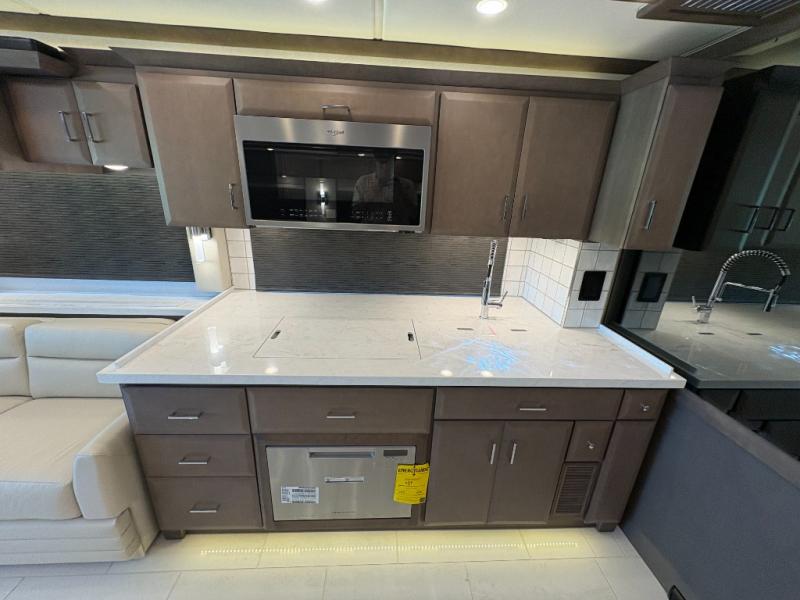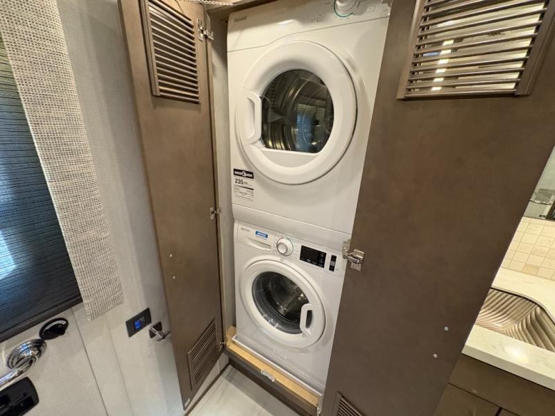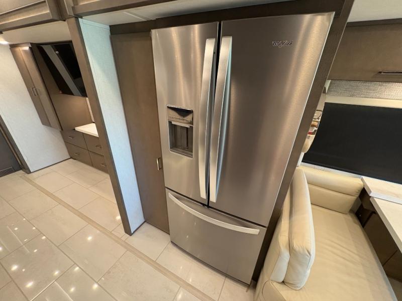 Don't pass up your opportunity to travel in pure luxury with this motorhome! The master suite has a king bed slide for a good night's rest across from a dresser with a Samsung LED TV and shirt wardrobes on either side. Attached to the bedroom is your very own full rear bathroom which has a 40" x 32" shower with a seat next to a linen closet and wardrobe, as well as a Splendide two-piece washer and dryer next to the vanity sink. The chef will have everything they need to prepare delicious home cooked meals including a cabinet pull-out, a stainless steel 30" convection microwave with air fryer feature and a Whirlpool 19.7 cu. ft. refrigerator to keep the perishables fresh, plus the half bathroom is by the kitchen for quick bathroom breaks while cooking. Enjoy your meals at the hide-a-leaf dinette and relax on either the 84" hide-a-bed sofa or the 62" jackknife sofa while watching your favorite movies on the Samsung LED TV on power lift!